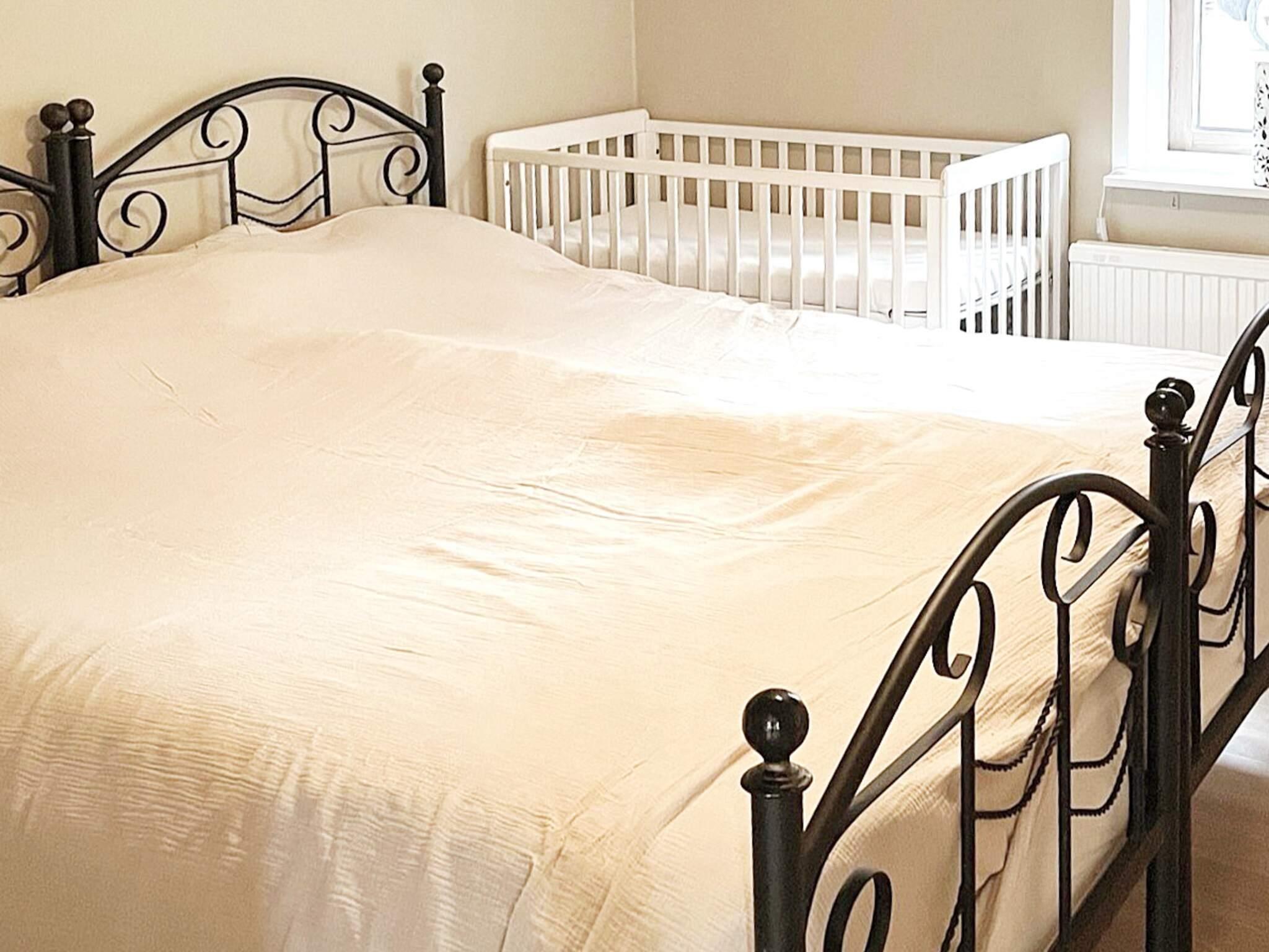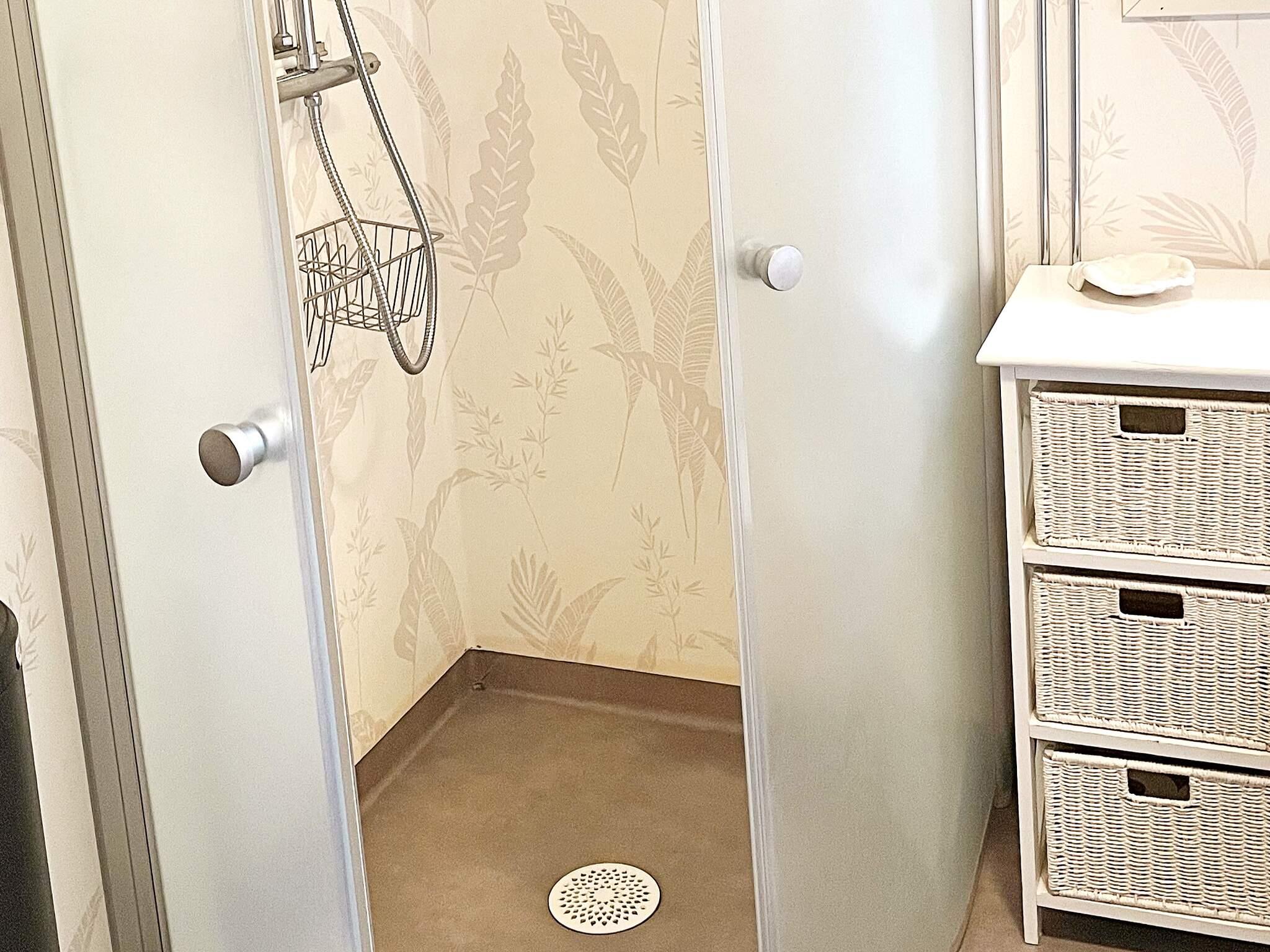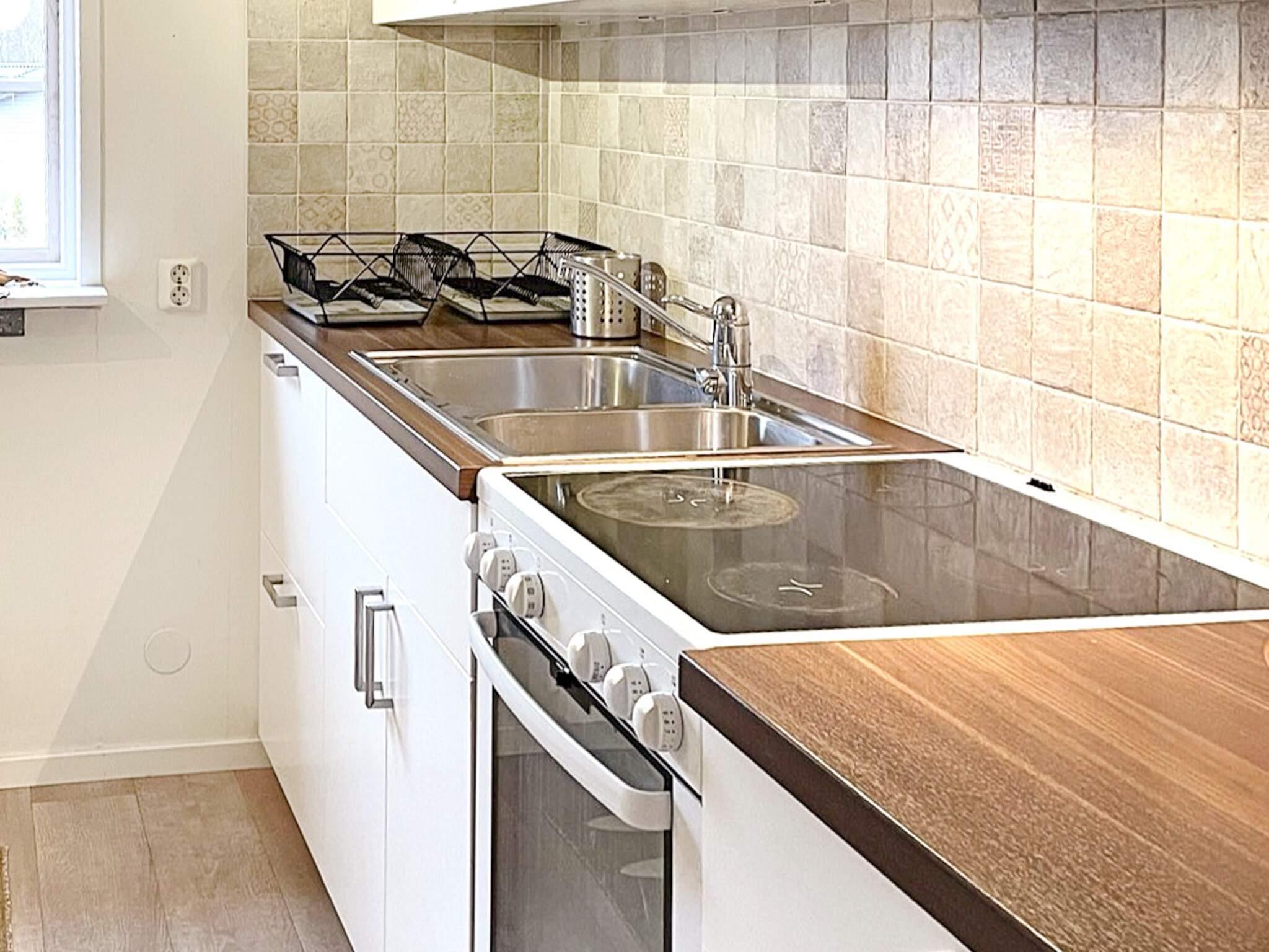 Öppet kök med matplats och ett vardagsrum i vinkel med öppen spis-kamin som man kan elda i, här finns också en bekväm soffa, TV och Wifi. Det finns två sovrum med dubbelsängar. Badrummet har WC, dusch och tvättmaskin.