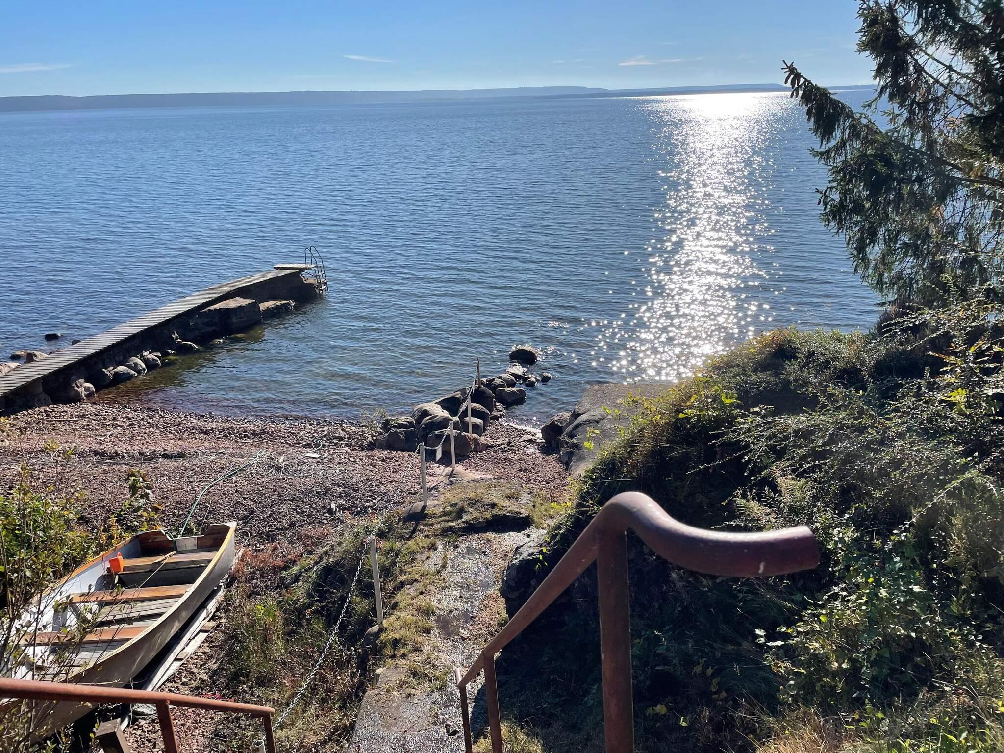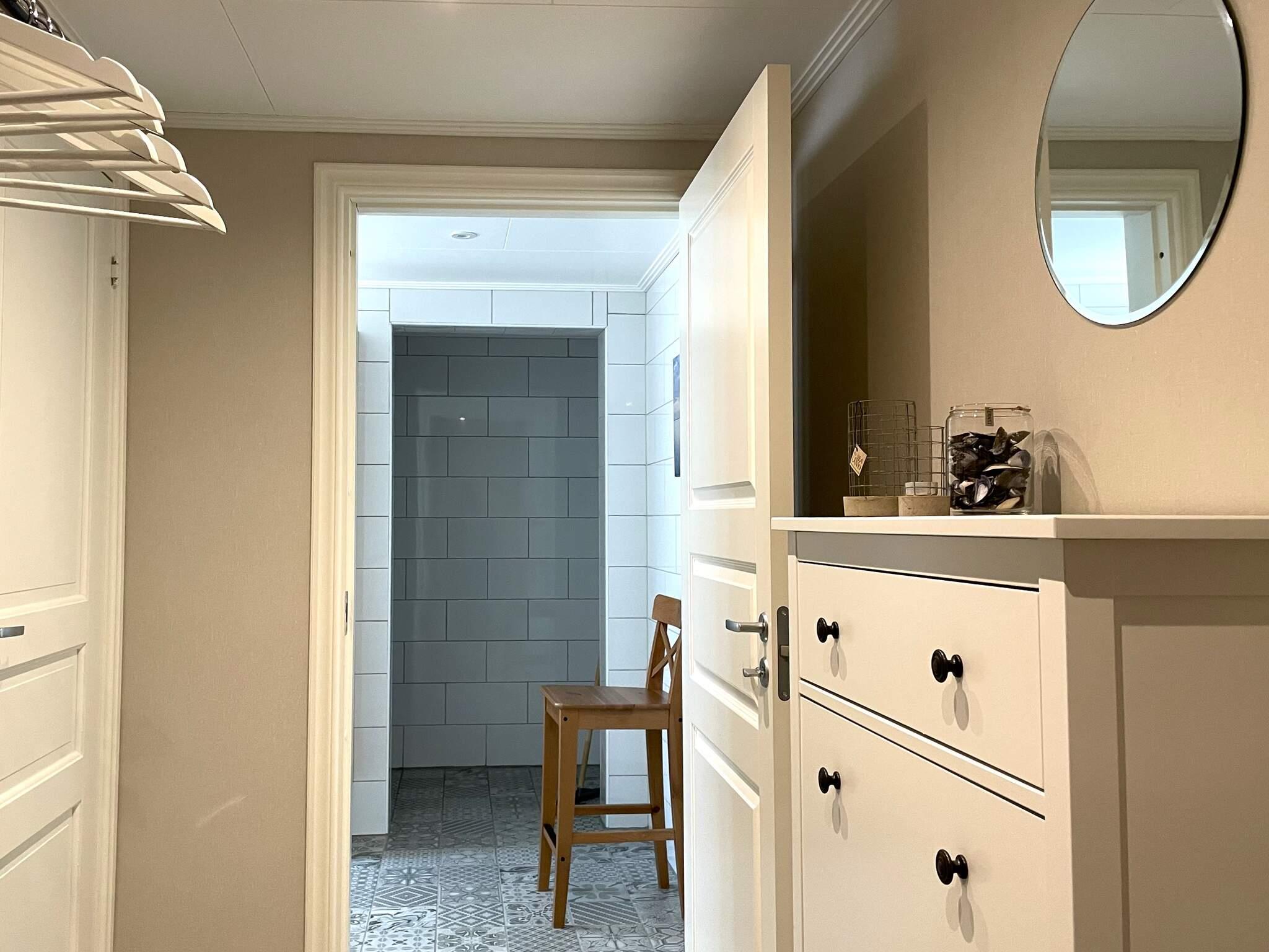 Välkommen till ett mycket trivsamt boende med närhet till bad och med utsikt över sjön från altanen och från ena fönstret. Stugan ligger i ett lugnt villa- och sommarstugeområde med minst fem så kallade allmänningar, dit man kan gå för att bada och njuta av sjön Vänerns klara vatten och mysiga badplatser. Boendet är en ljus möblerad lägenhet som ligger på ovanvåningen av husägarens garage. När du kommer in öppnar en ljus hall upp sig och rakt fram finns ett mycket rymligt badrum. I första delen är handfat och wc och i andra delen innanför är själva duschutrymmet som är helkaklat.