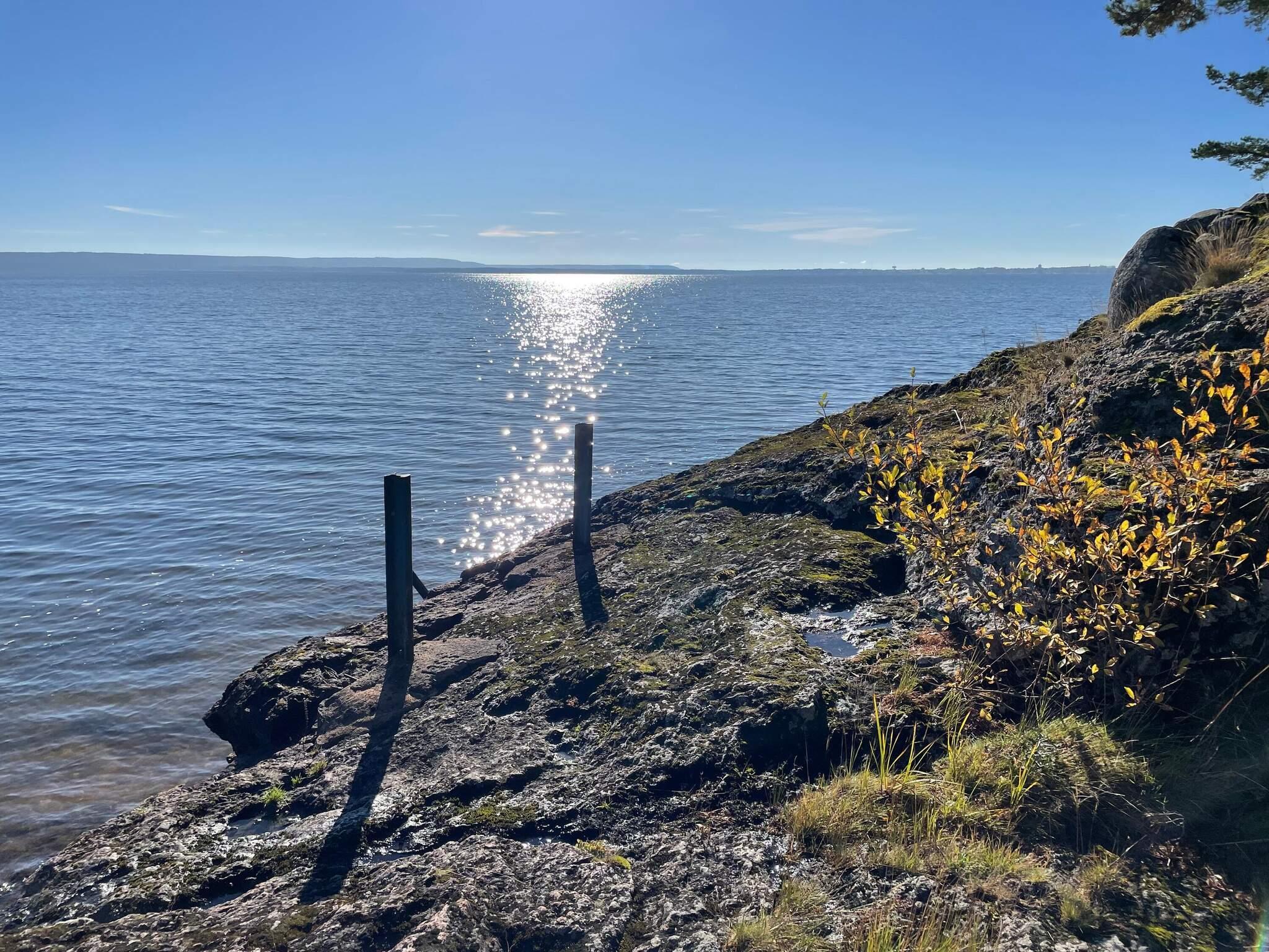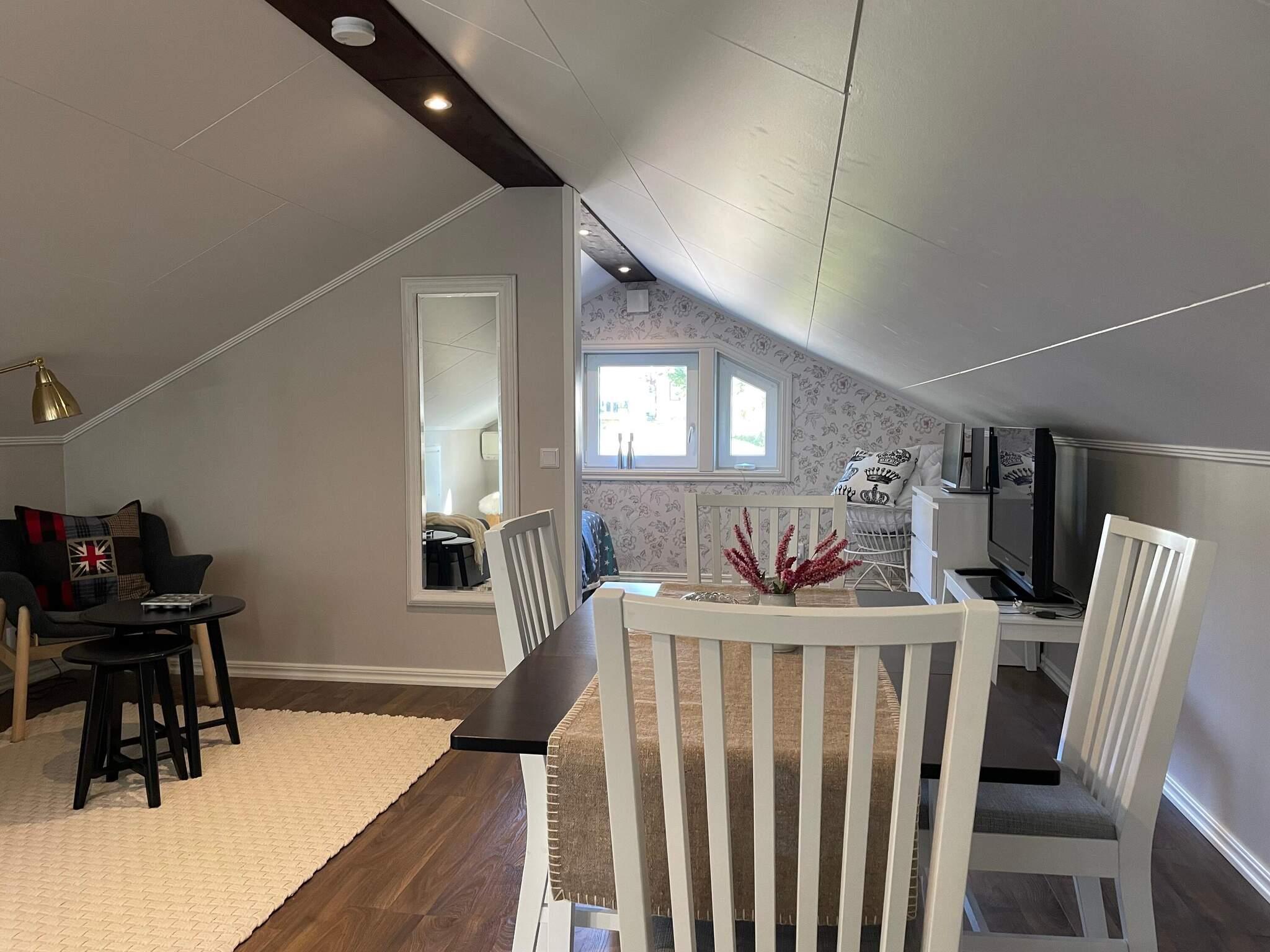 Trappen upp leder er till själva boendet. Här kommer du rakt in i det trevliga allrummet med ljus och hemtrevlig stil. Träbalken i taket har spotlight och fåtöljen man ser är även bäddbar, som kan bli en enkelsäng. Köksbordet har plats för 4 personer. Det finns det mesta du kan behöva i detta välutrustade kök. Kyl med frys samt mikrovågsugn. Längst in är sovrummet med en dubbelsäng på 180 cm. Det finns också en extra bädd, en resårmadrass som man nyttja som är under dubbelsängen. Lägenheten har ett mysigt snedtaket med en öppen planlösning men du kan gå raklång i stort sett i hela boendet. Boendet är en lägenhet som delar tomt med husägarna som är mycket trevliga. På baksidan finns en altan där man kan njuta av stilla kvällar med sjöbris. Ett stenkast på knappt 3 min promenadavstånd kommer du ner till en av alla de härliga badplatserna som finns.