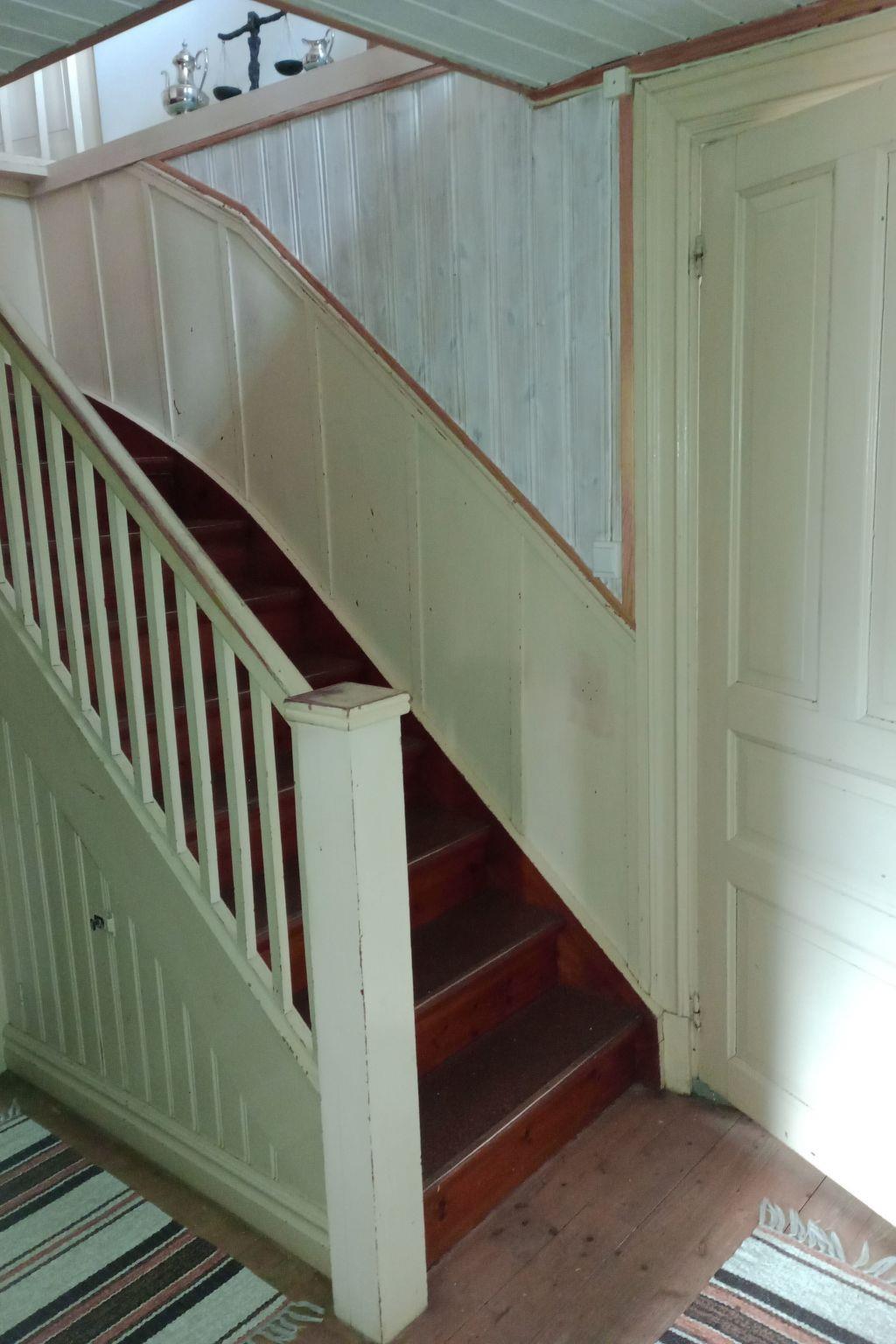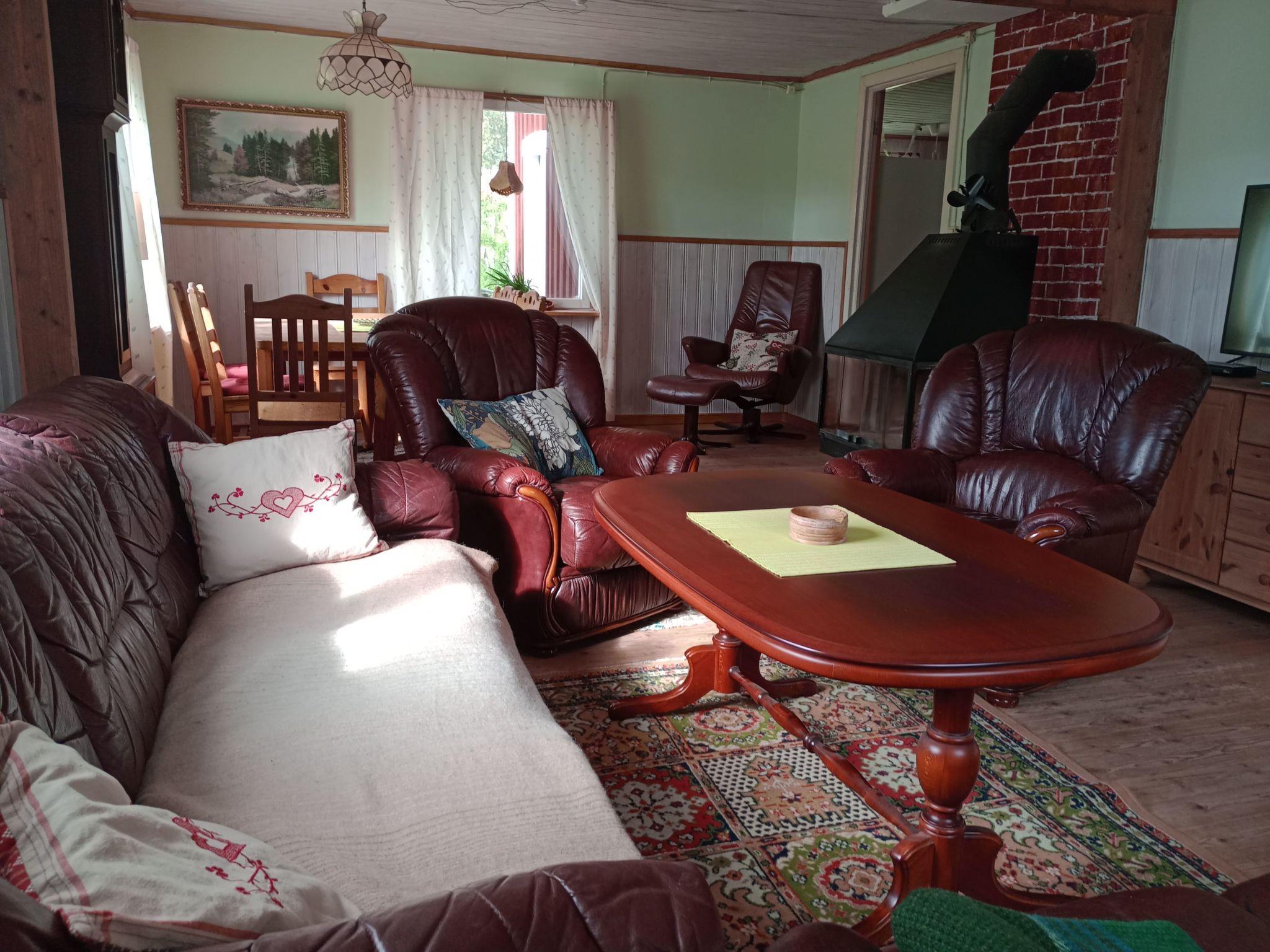 Inside the 90m² house you will find a cosy, old-style interior. The kitchen combines traditional charm with a wood-burning stove and modern amenities such as a microwave, toaster, fridge and cooker. A dining table in the kitchen invites you to enjoy meals together. The spacious ground floor also includes a bathroom and a living room with a fireplace and satellite TV, as well as a cosy bedroom. Upstairs you will find further sleeping options, including a room with bunk beds and another with two single beds.