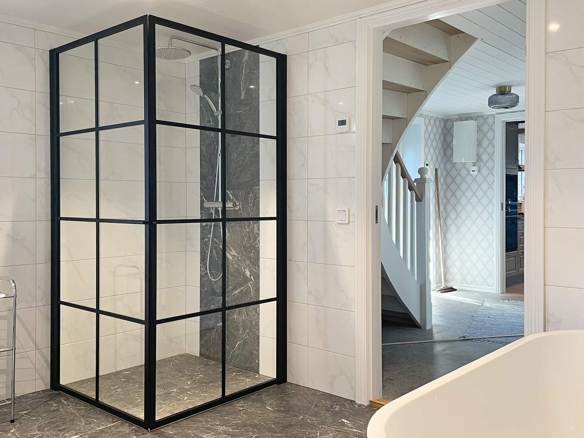 Huset har två lyxiga badrum med wc, dusch och handfat. Även ett badkar finns i det större badrummet som man kan nå både från hallen och det stora sovrummet.