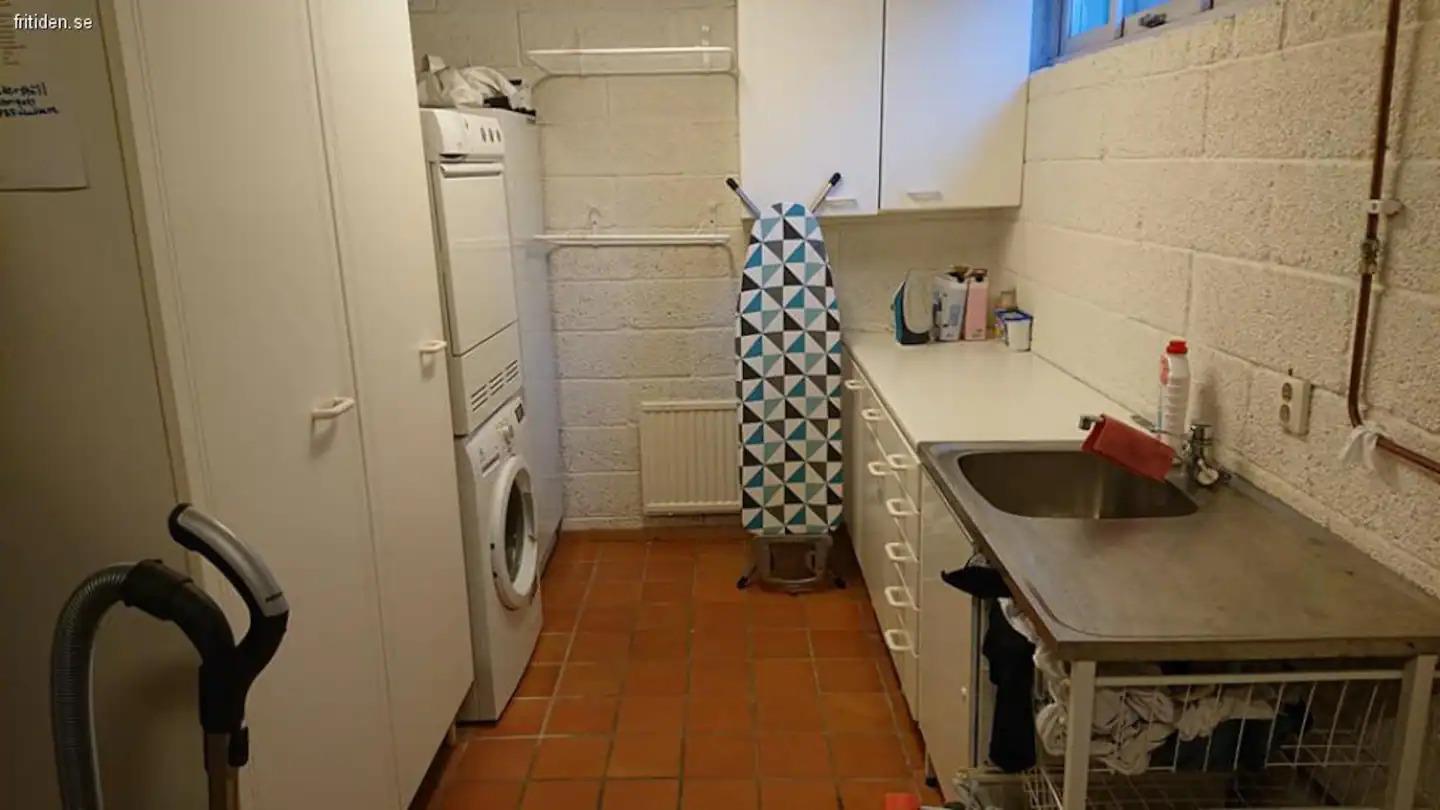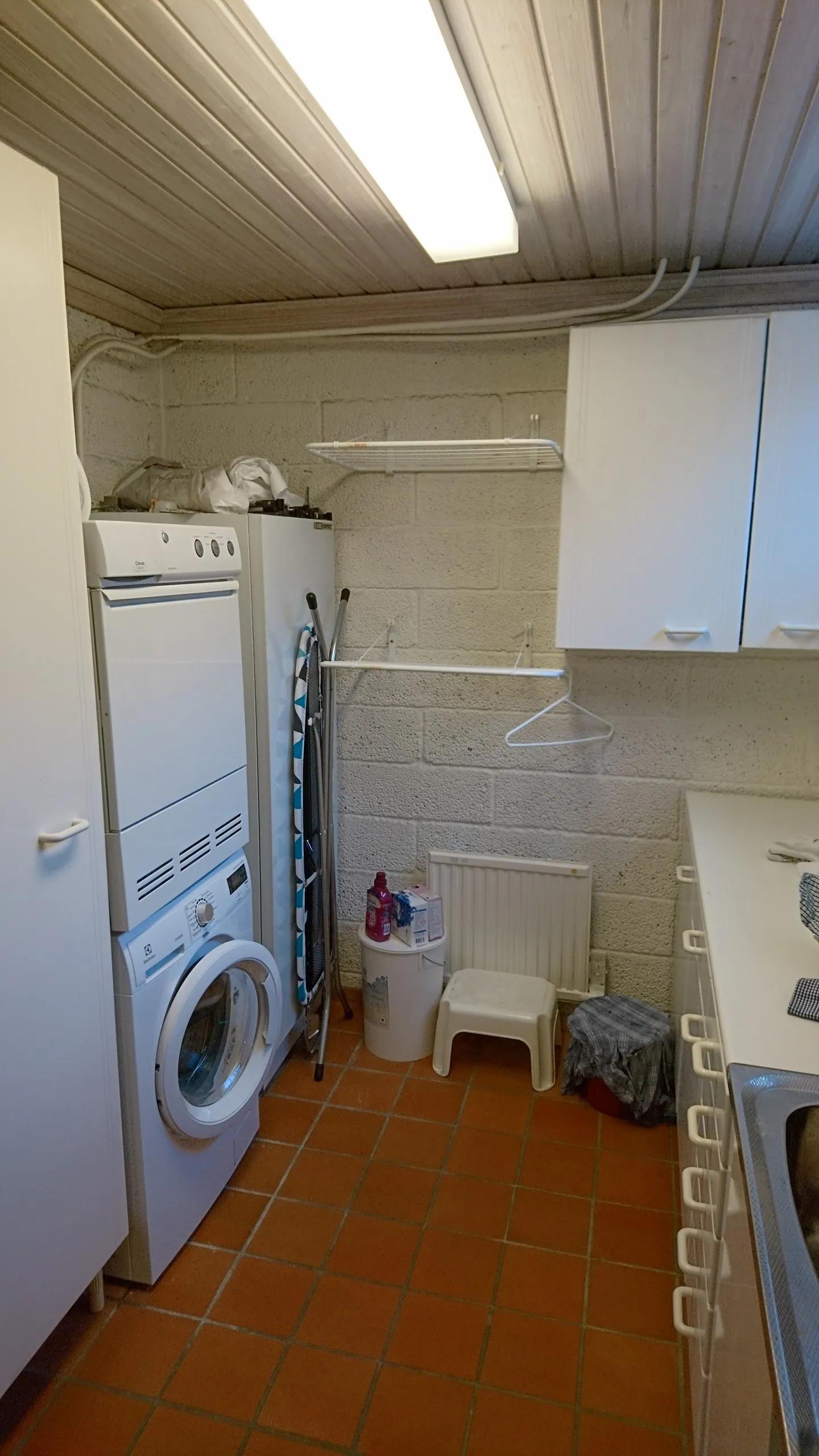 From the entrance hall downstairs, you enter a spacious hall. Here is a bedroom with two single beds, a bathroom with shower and access to a laundry room. Here is also the gym with many different exercise equipment, a ping pong table and a cozy TV corner with a comfortable sofa.