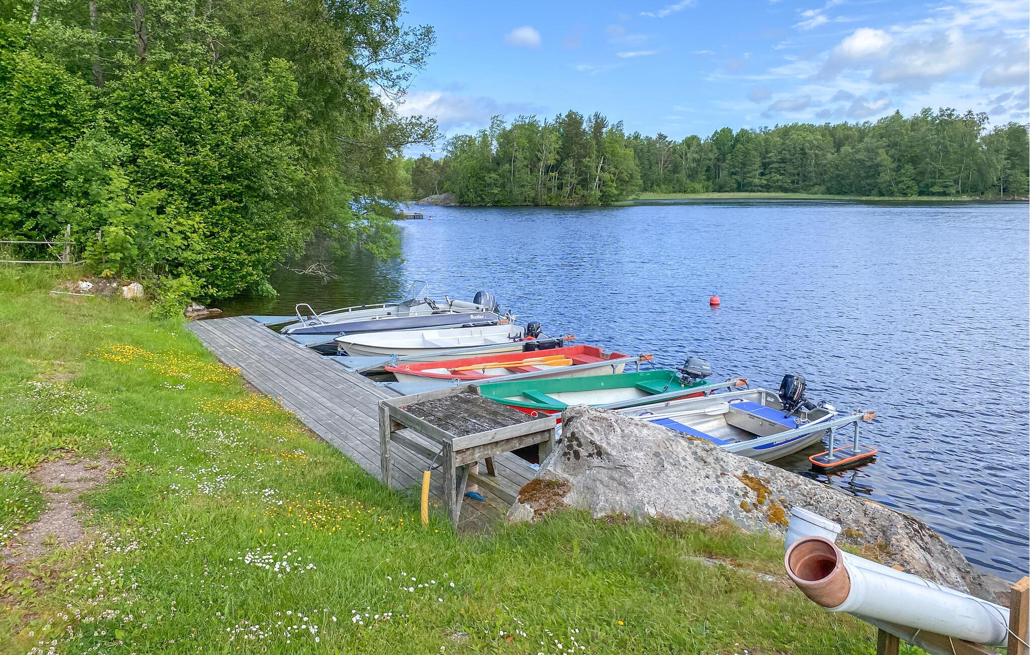På terrassen kan du la blikket vandre over innsjøen mens du spiser frokost i frisk luft eller tenner grillen om kvelden. Den velstelte hagen med busker og blomstrende planter innbyr til opphold. Nede ved vannet er det en brygge med utgang til innsjøen, ideell for bading, fiske eller leie av båt med motor og utforske innsjøen.