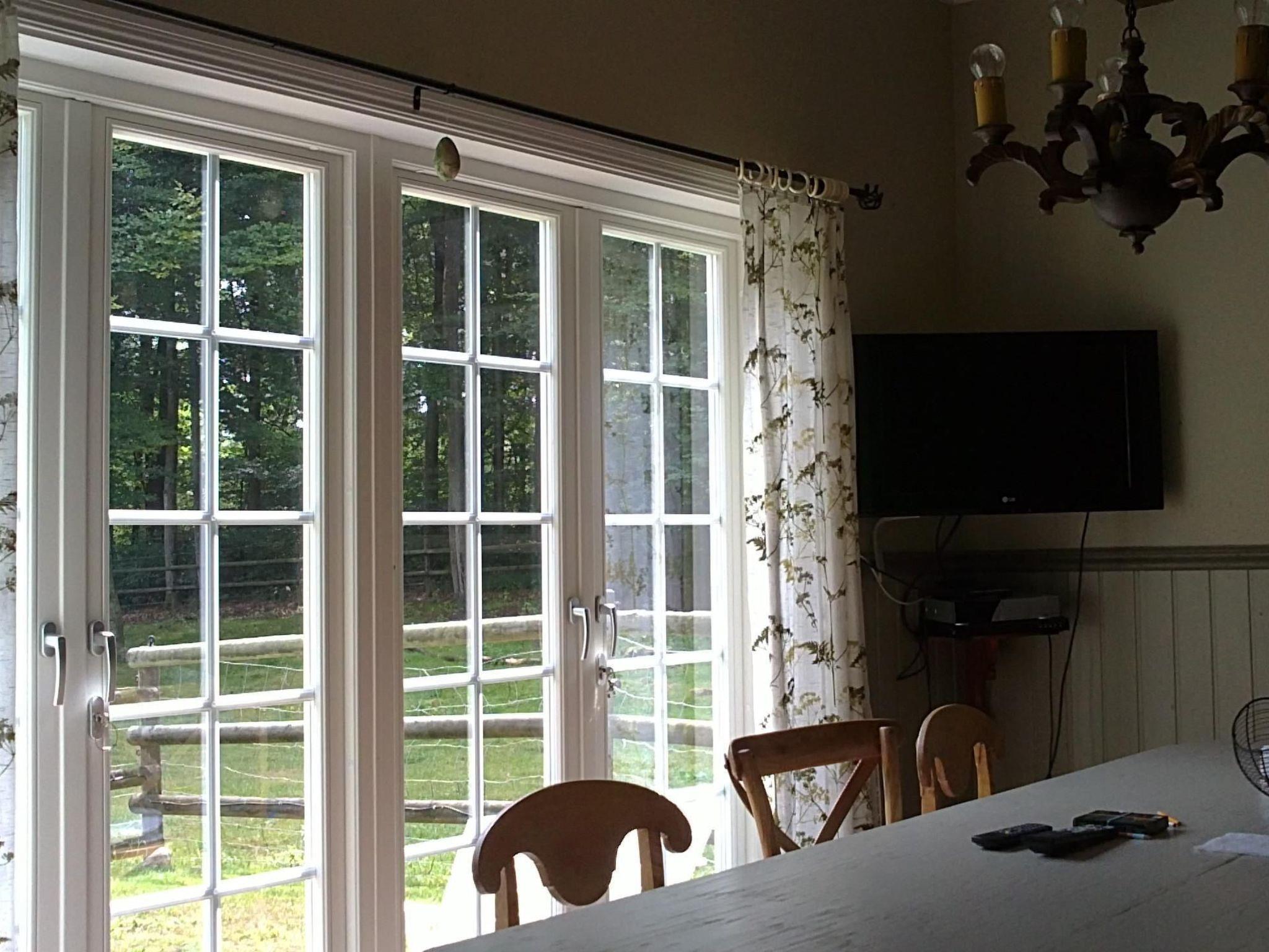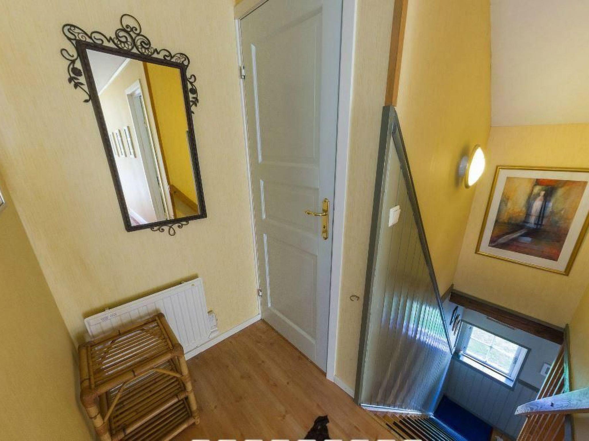 The holiday house is one of three buildings on the farm, of which one is occupied by the owner and is about 100 metres away. Other residential houses are at least 500 metres away. The one-hectare site also has hens, sheep and geese in fenced areas. The house of around 120m² is on two floors. The ground floor has a 60m² living room with a kitchen, equipped with satellite TV, a DVD and CD player, an electric stove with two ovens, a microwave, a big fridge, a dishwasher, a coffee machine, a toaster and a mixer. The washing machine is in a room next to it and there is a big freezer in the bicycle storage room. There is a bathroom with a shower and a sauna. Upstairs there are four bedrooms and a toilet. The smallest bedroom has a bunk bed and a changing table. A cot is available on request. The other three bedrooms each have two single beds, so there are a total of eight beds measuring 90 x 200cm. The bedrooms upstairs have electric radiators, while the living room downstairs has Daikon air conditioning and there are electric radiators in the hallway and in the bathroom.