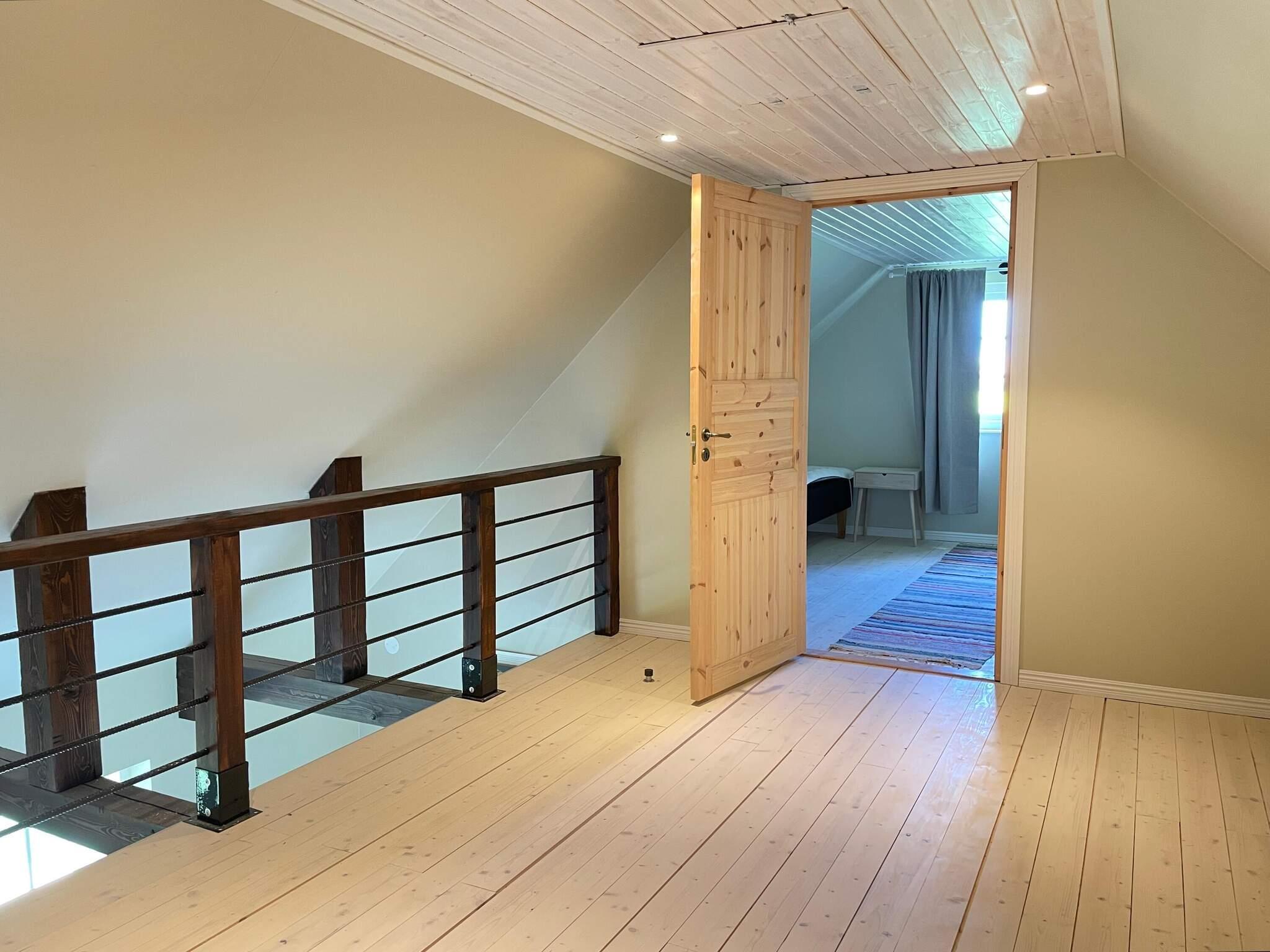 Husets nedervåning bjuder på en öppen planlösning mellan det moderna köket och det ljusa vardagsrummet – perfekt för umgänge och avkoppling. Här finns också ett sovrum med dubbelsäng samt ett rymligt badrum med dusch, tvättmaskin och gott om plats. En trappa upp möts du av ett luftigt allrum med soffa och TV – en skön plats för lugna stunder. På samma våningsplan ligger två sovrum, båda utrustade med två enkelsängar. Från övervåningen är det delvis öppet ner mot vardagsrummet, med ett tryggt räcke som ramar in rymden.