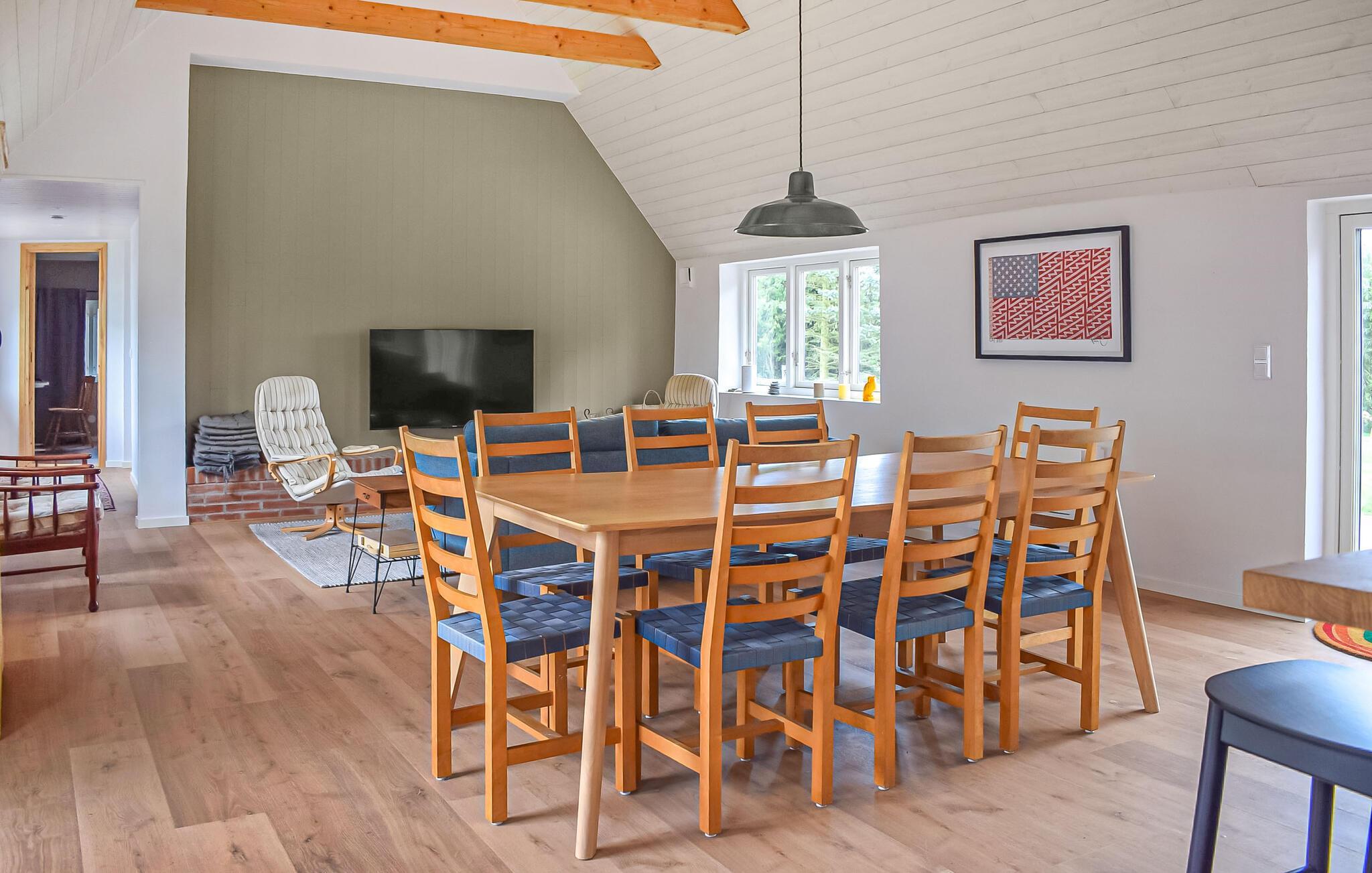 Du vil umiddelbart føle deg hjemme i dette romslige huset. Lyse trepaneler, trebjelker og en sofagruppe skaper en innbydende atmosfære. Slapp av i den behagelige sofaen med en deilig kopp kaffe, lag deilige måltider på kjøkkenet eller tenn opp i vedovnen for ekstra koselig varme på kjøligere dager.