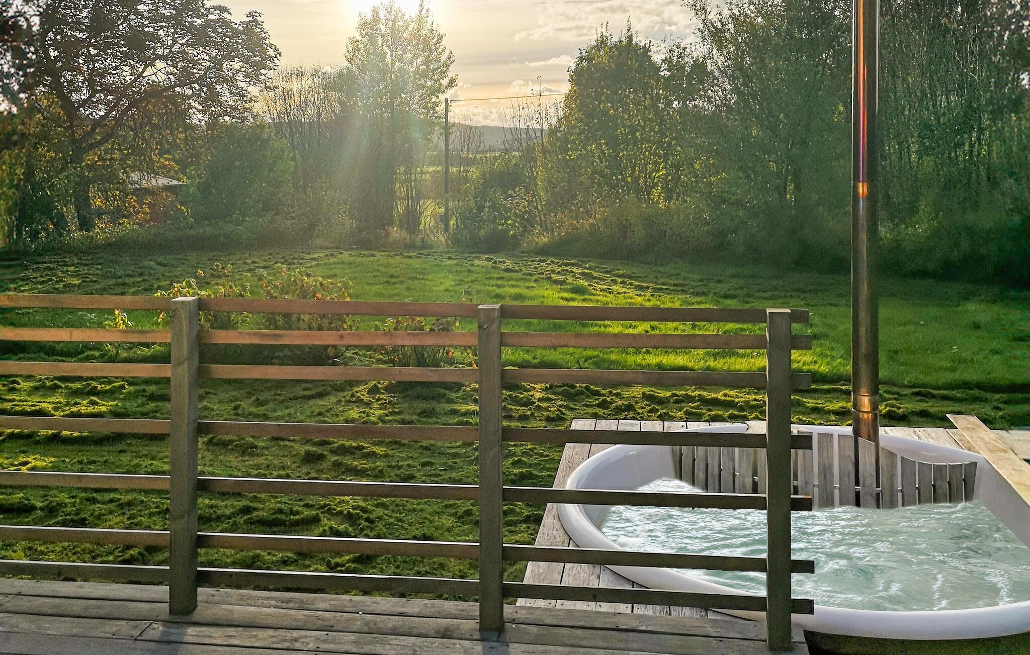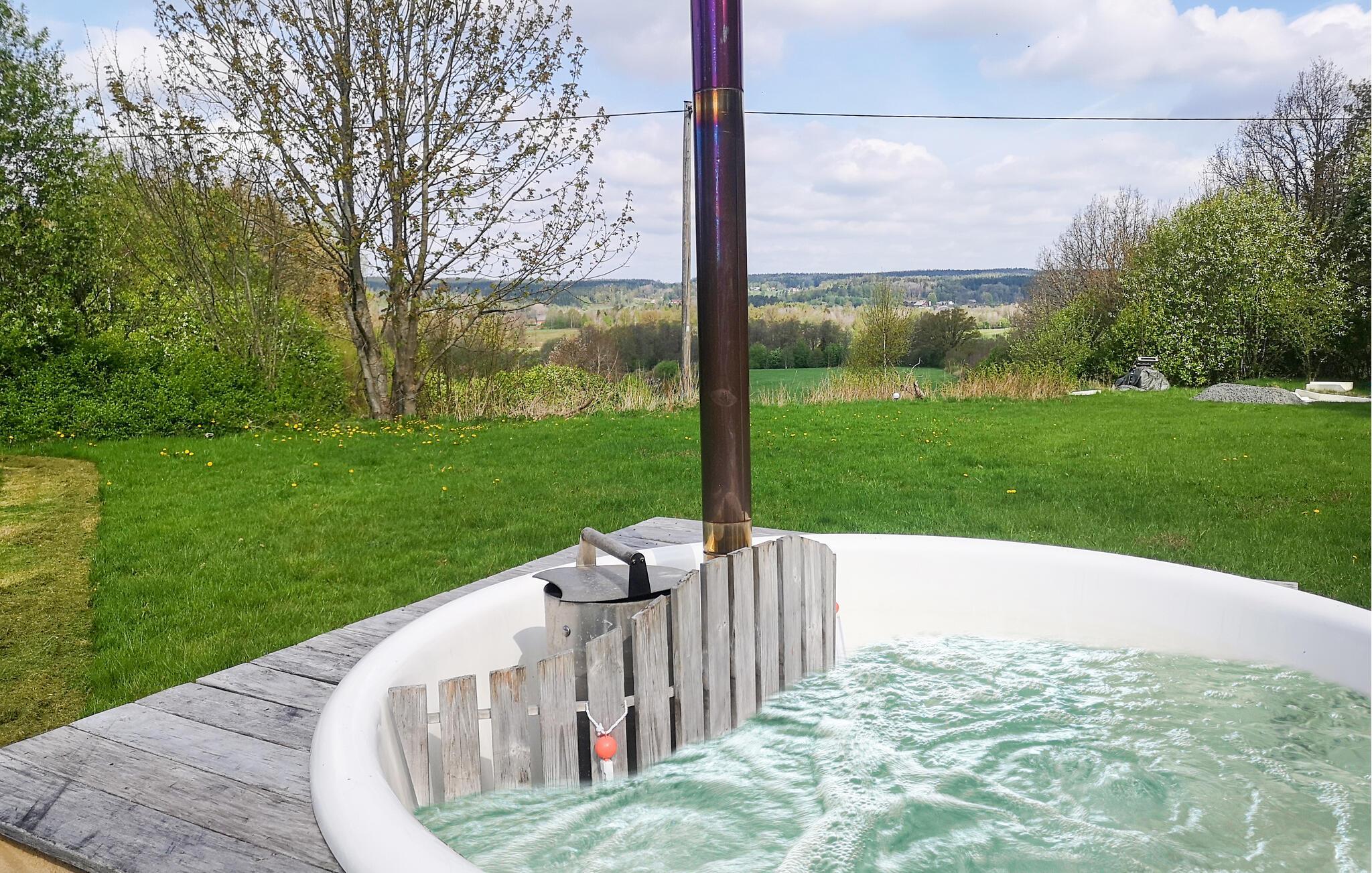 Dette feriehuset ligger på en stor naturtomt i kort avstand fra fiskevann, og er spesielt godt egnet for fiskeentusiaster. Inne i dette feriehuset finner du nok plass til den store familien. Dra på fisketurer som varer hele dagen. Forhåpentligvis kommer dere hjem med ryggsekken full av fisk! Tilbered fisken på grillen og nyt den på spisekjøkkenet eller i den store hagen med en fantastisk utsikt. Du kan slappe av i boblebadet. Den store sofaen og TV-en innbyr til en kveld med en god film.