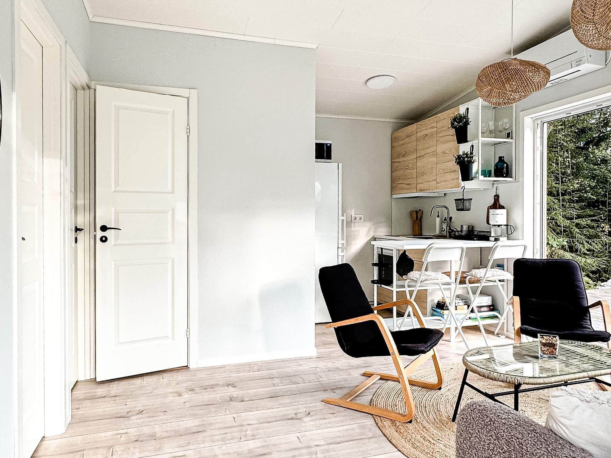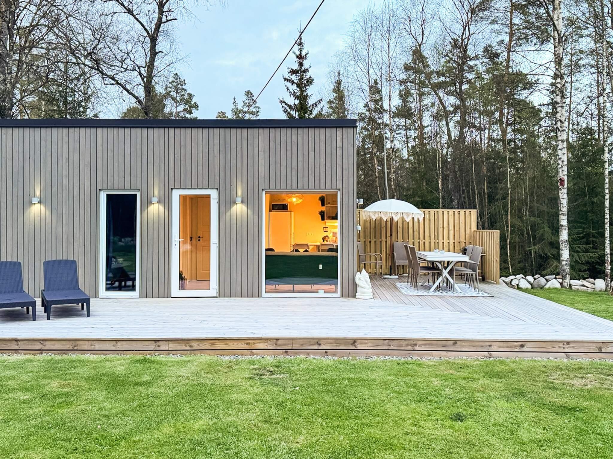 Med fantastiskt sjö nära läge hittar ni här nybyggda stugan med sjöutsikt. Stugan är helt nybyggd, och är inte jättestor men välplanerad. Stugan har ett litet kök som sitter ihop med vardagsrums delen, två sovrum, ett med en dubbelsäng och ett med en familjesäng, 140+80 för 2-3 personer. Ett fantastiskt badrum med dusch och wc. Matplats är främst utomhus på den stora altanen, här har ni en härlig utsikt av sjön. Det finns även två barstolar vi köksödelen av köket.