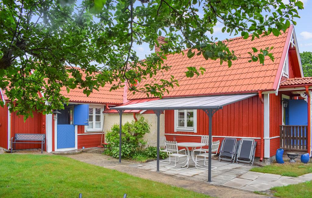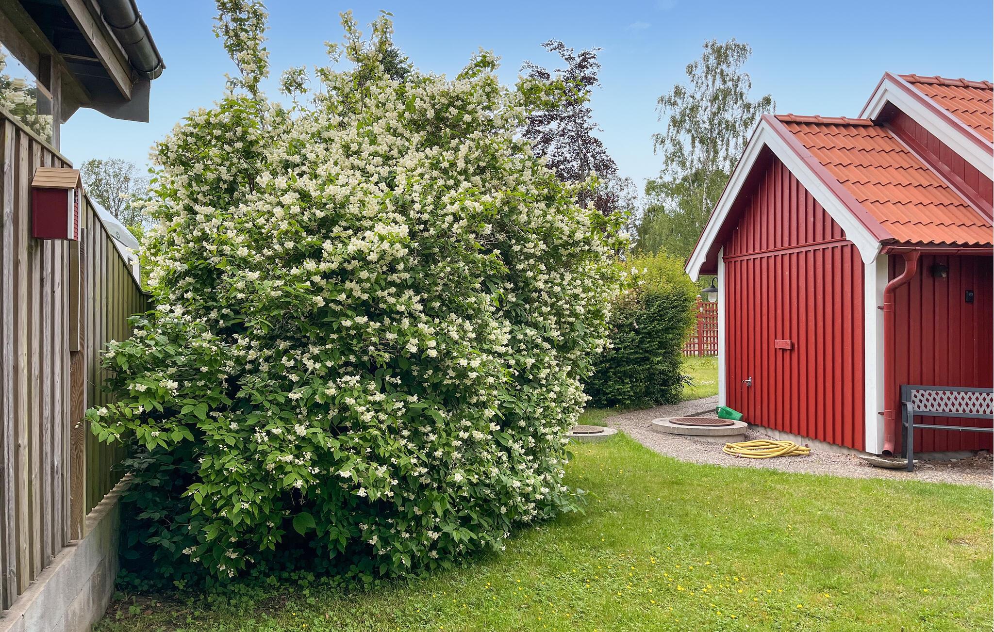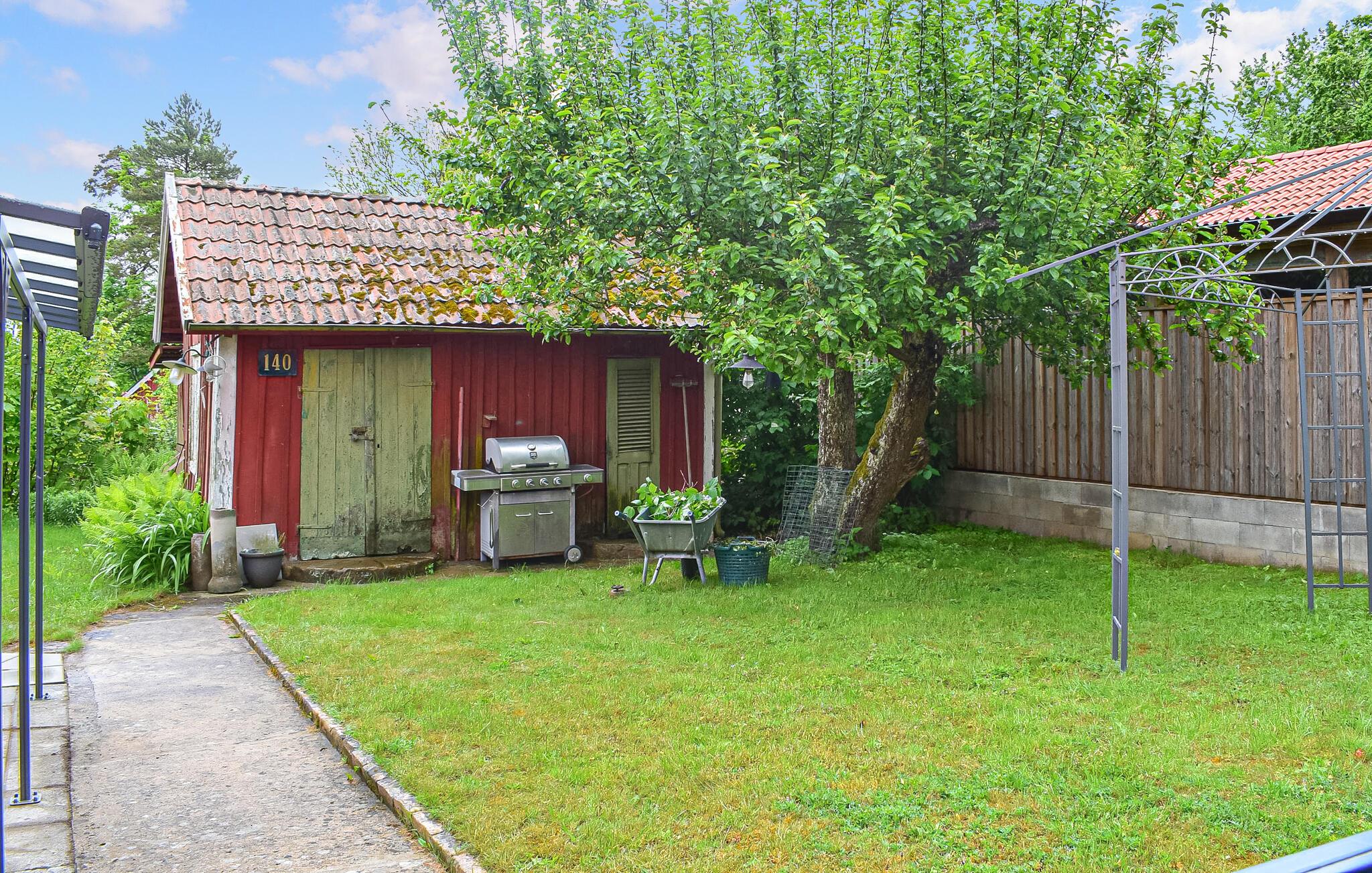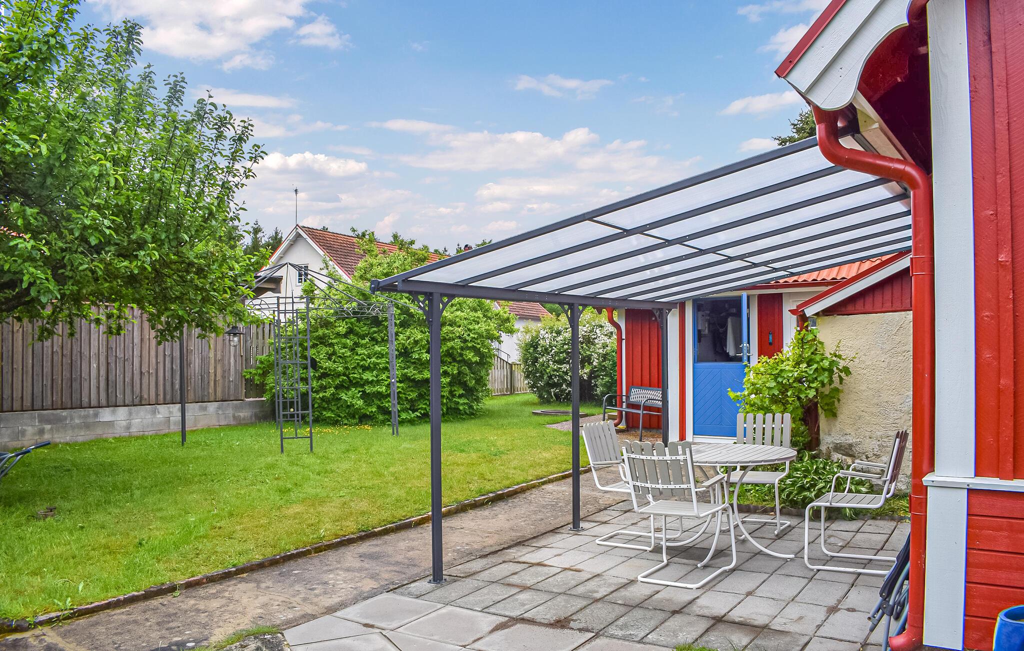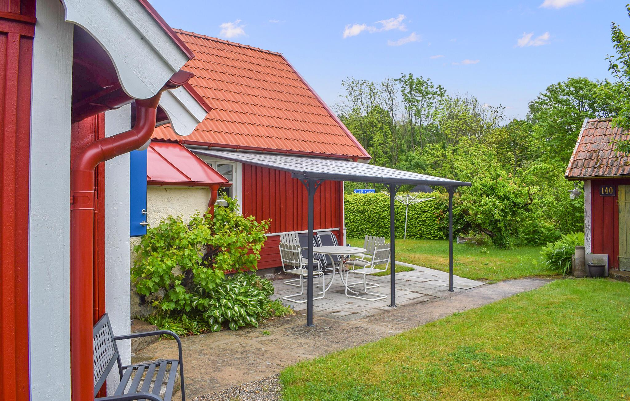 På solfylte dager er den overbygde terrassen et koselig sted der du kan nyte frokosten med utsikt over den velstelte hagen. Tenn opp grillen og reflekter over opplevelsene dine med et glass vin fra Ivögården under åpen himmel.