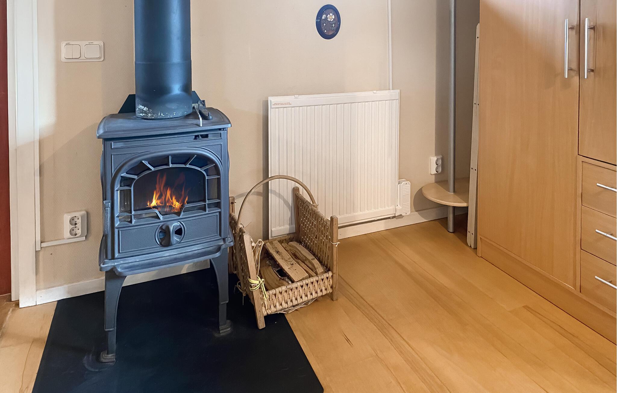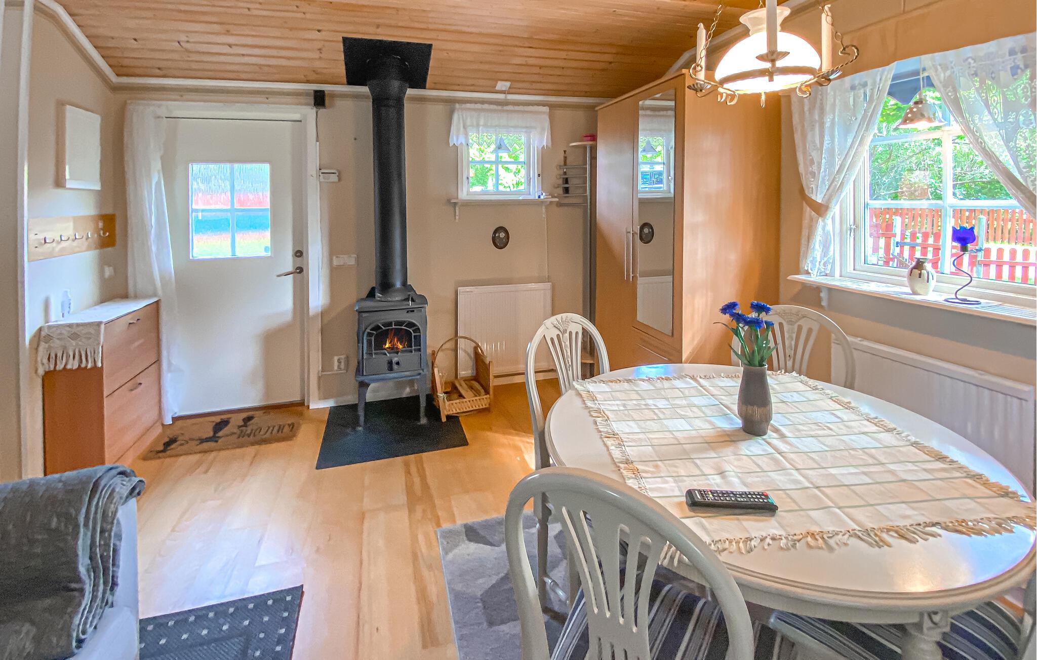 Dette huset kombinerer alt du trenger for en avslappende ferie på liten plass. En komfortabel sofa inviterer deg til å lytte til musikk, du kan lage mat til deg selv og dine kjære på det praktiske kjøkkenet, og vedovnen gir en ekstra koselig touch.