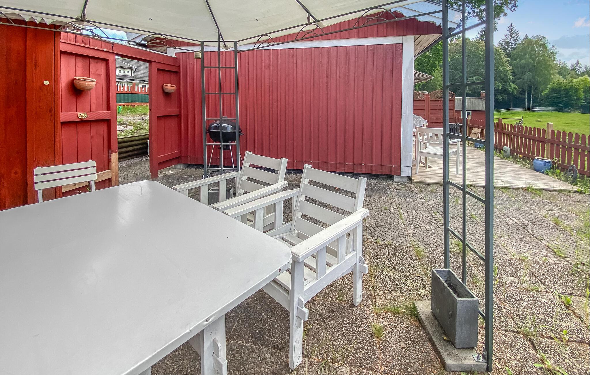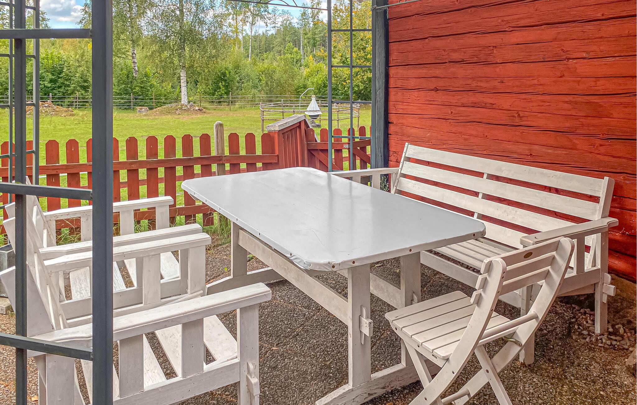 På treterrassen like ved huset finner du ulike sittemuligheter, slik at det finnes noe for enhver værsituasjon og ethvert behov. Her kan du nyte en solid frokost, kose deg med en god bok eller tilbringe avslappende timer med kaffe og prat.