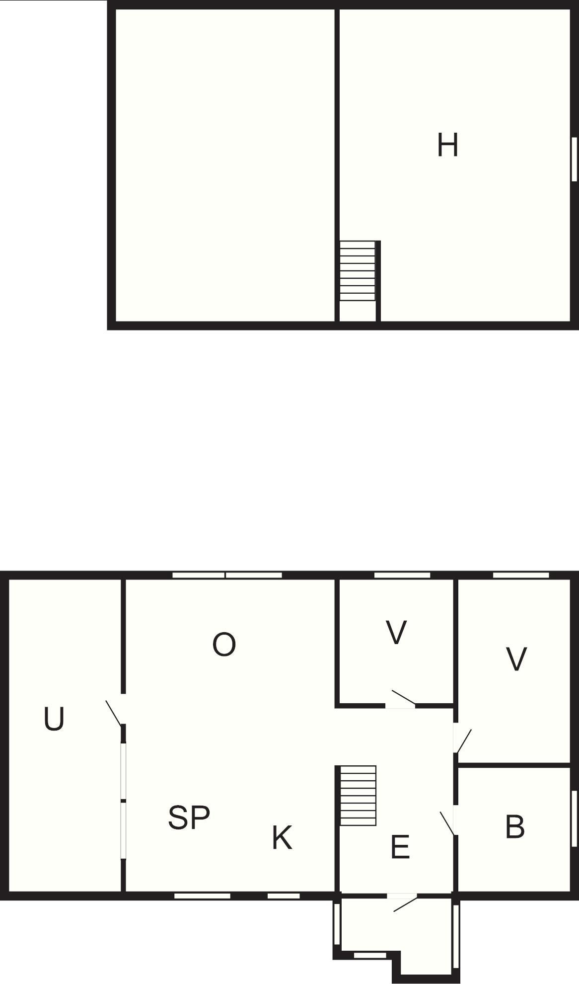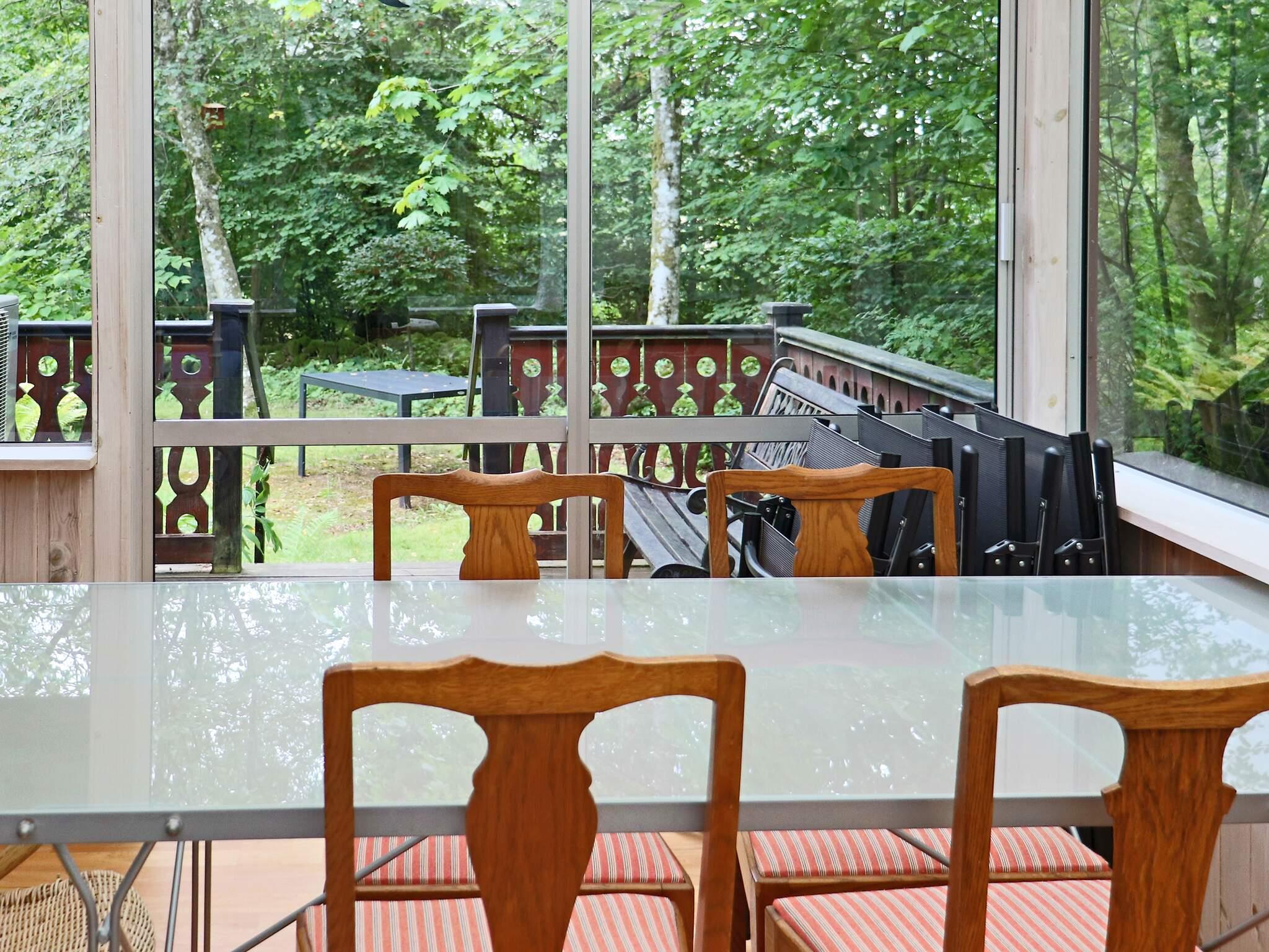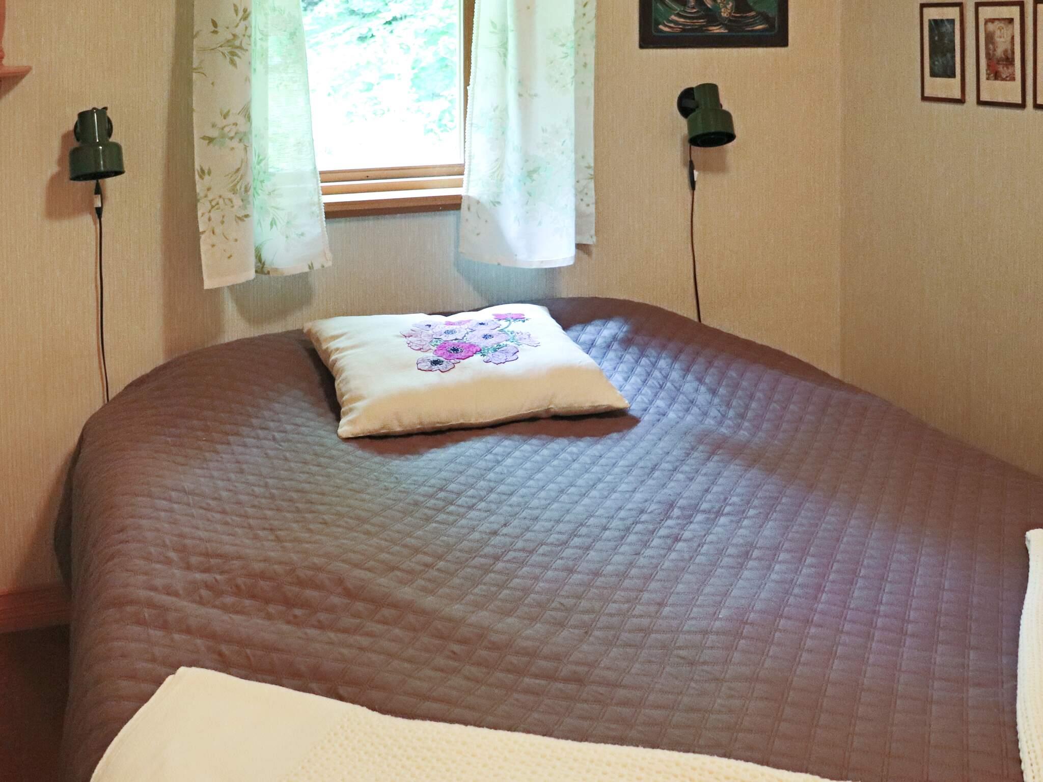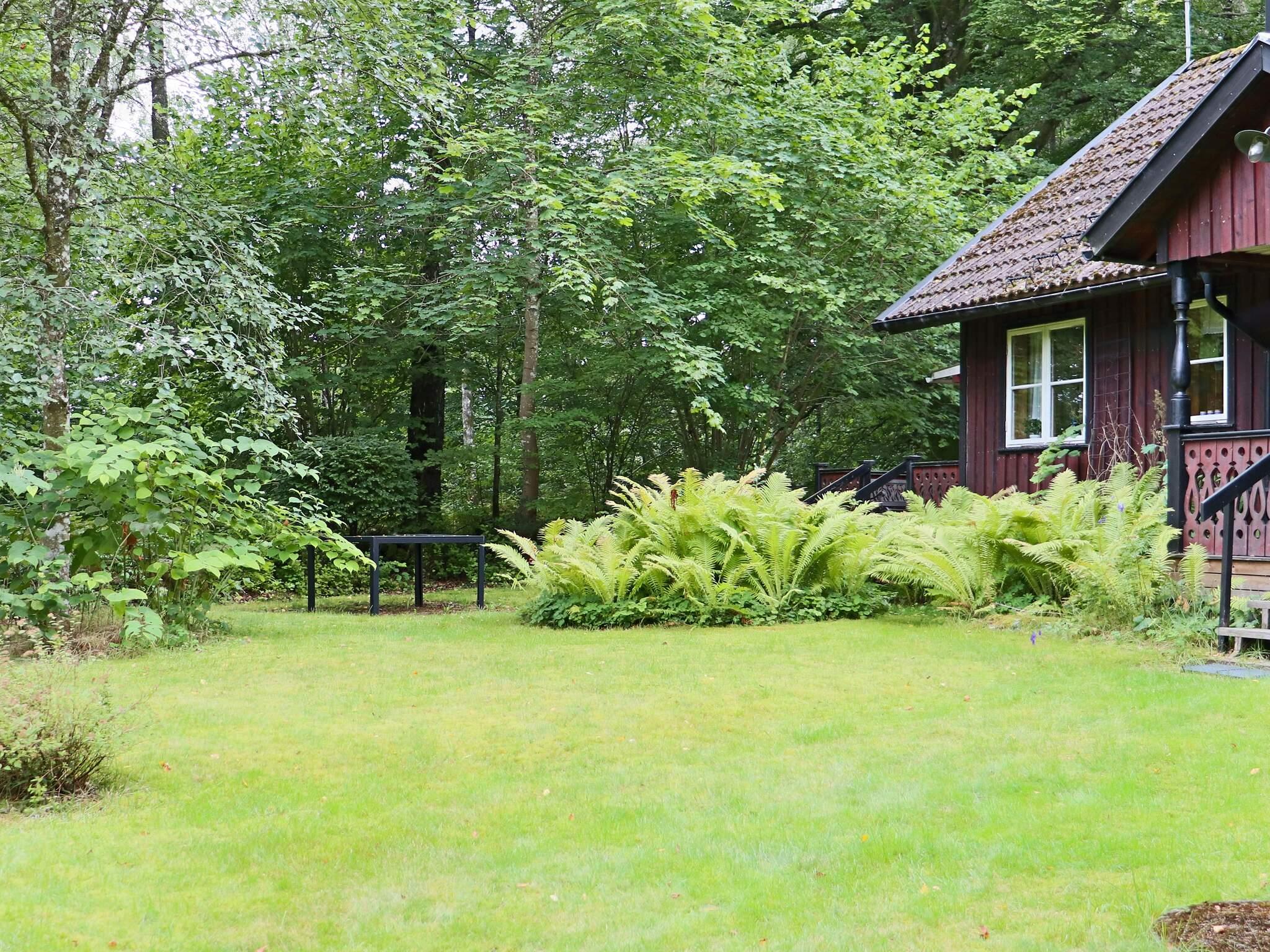 Huset har i bottenvåningen två sovrum. Ett med en dubbelsäng (140cm) och ett med en våningssäng och en enkelsäng. Badrummet har dusch. I det öppna köket och vardagsrummet finns matplats och en bäddsoffa. Köket är välutrustat. Här finns en modern TV med chromecast och en härligt värmande braskamin. Rummet är öppet upp i nock som ger en härlig rymd. Intill finns ett inglasat uterum. En trappa upp finns sovloftet med ett avdelat rum som har en dubbelsäng och utanför en enkelsäng. Tomten är grönskande med skyddande skog runtom. Vid huset passerar flera promenadstigar. En kort promenad bort finns den allmänna badplatsen