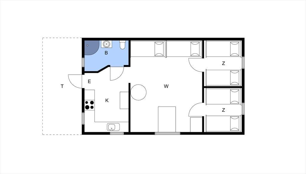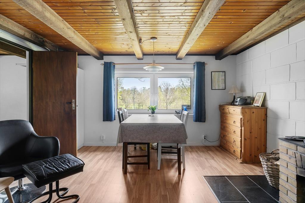 Das etwa 60 m² große, in 2020 gründlich renovierte Ferienhaus bietet Platz für bis zu sechs Personen. Neben den beiden Schlafsofas im Wohnzimmer, in dem es auch einen Kaminofen gibt, verfügt das Haus über zwei Schlafzimmer, die beide jeweils mit zwei Einzelbetten möbliert sind. Zur Ausstattung der Küche gehören ein Elektroherd mit Backofen und Dunstabzugshaube, Kühlschrank mit Gefrierfach, Geschirrspüler und Kaffeemaschine. Für Angler besonders wichtig ist die sich darüber hinaus im Keller befindliche, etwa 200 l fassende Gefrierbox. Weiterhin hat das Haus ein Duschbad mit WC und Handwaschbecken. Die Beheizung erfolgt über eine Luftwärmepumpe und mittels fest installierter Elektroheizkörper sowie dem Kaminofen. Darüber hinaus verfügt das Haus über eine mit Gartenmöbeln ausgestattete, überdachte Terrasse im Eingangsbereich; ein Holzkohlegrill steht zur Verfügung. Ein Internetzugang ist ebenfalls vorhanden; Datenvolumen muss von den Gästen in Mörrum erworben werden.