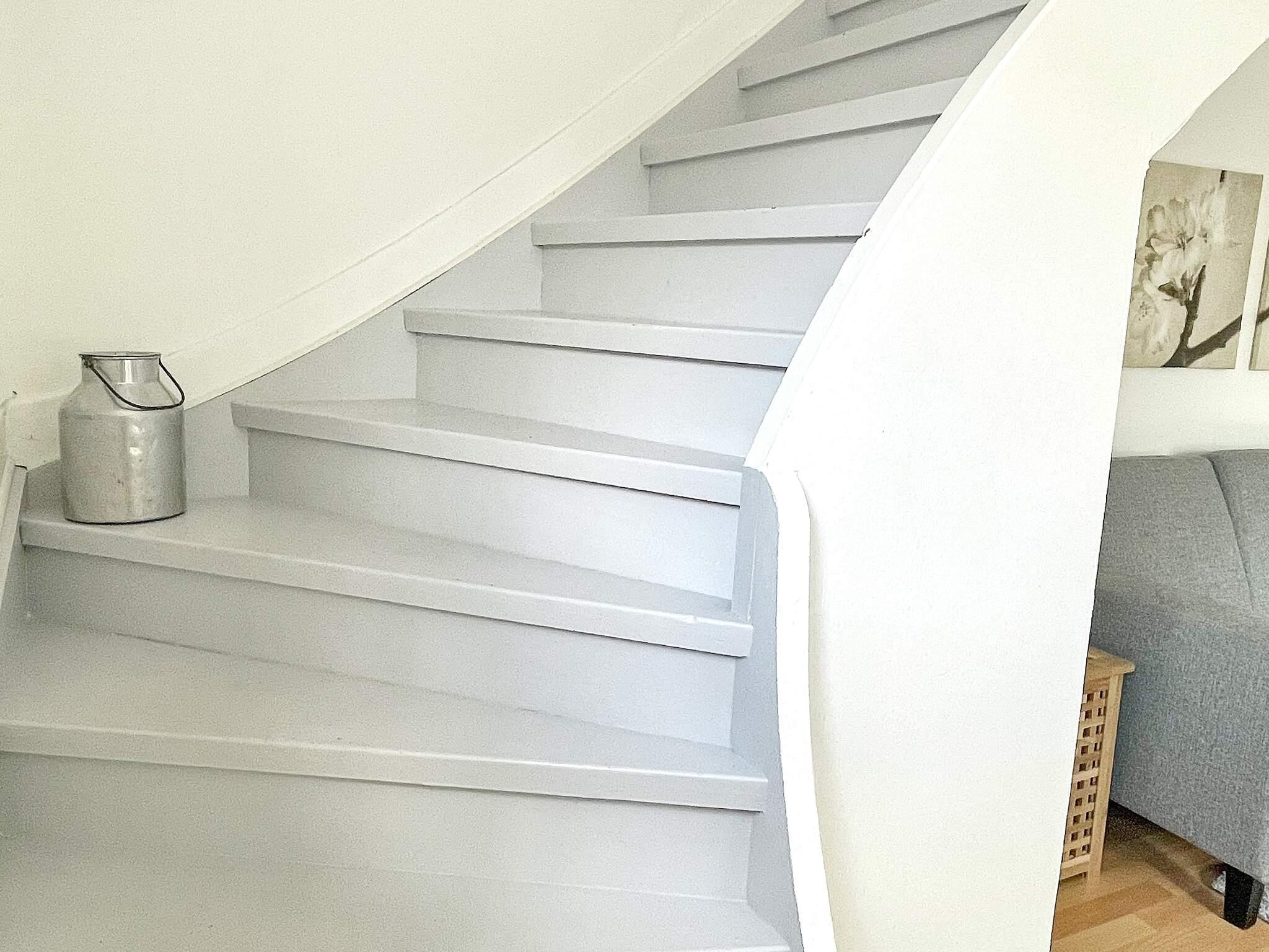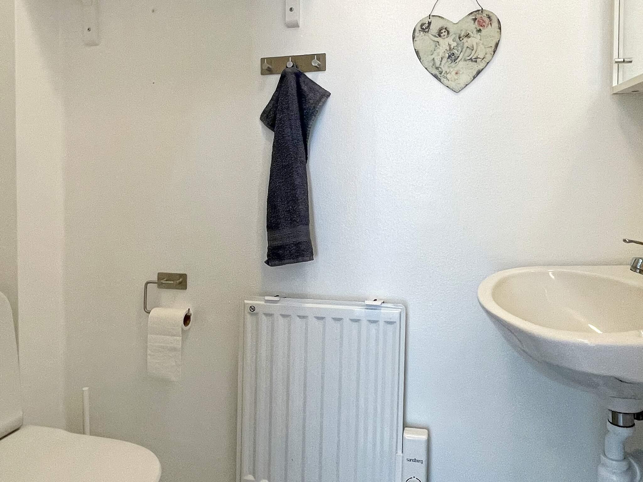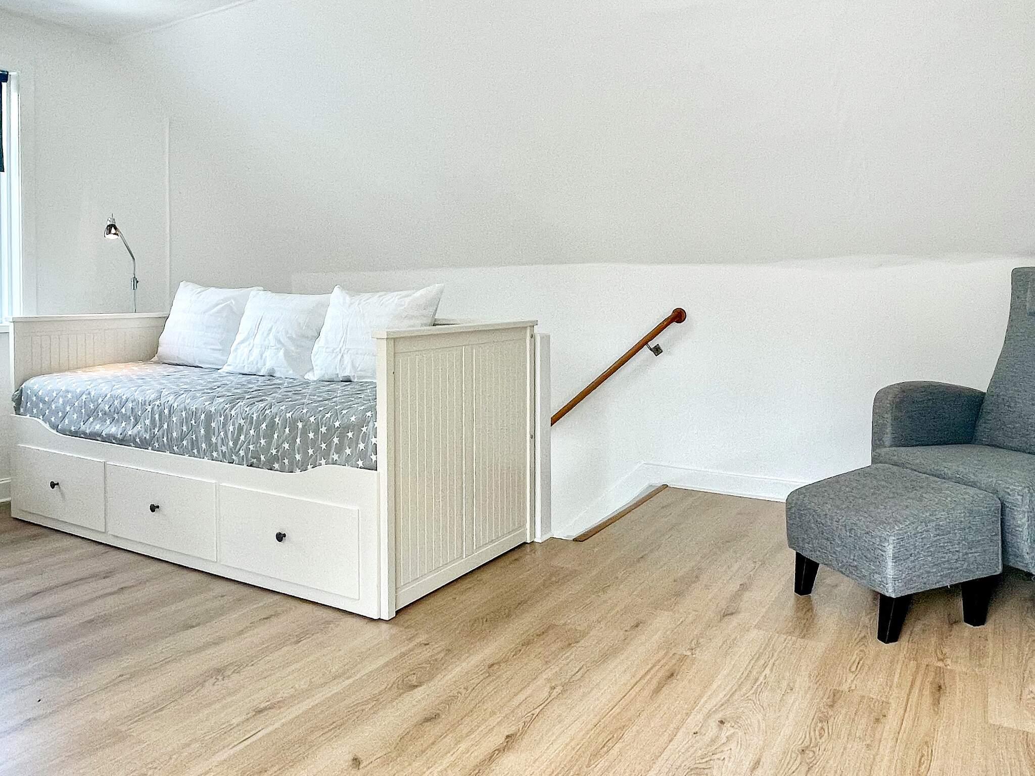 Sovrum finns på övervåningen, där ni har ett sovrum med en bekväm dubbelsäng samt ett mer öppet sovrum med en dagbädd som bäddas upp till dubbelsäng. Här finns även bekväma vilfåtöljer. I badrummet finns wc, handfat, dusch och tvättmaskin.