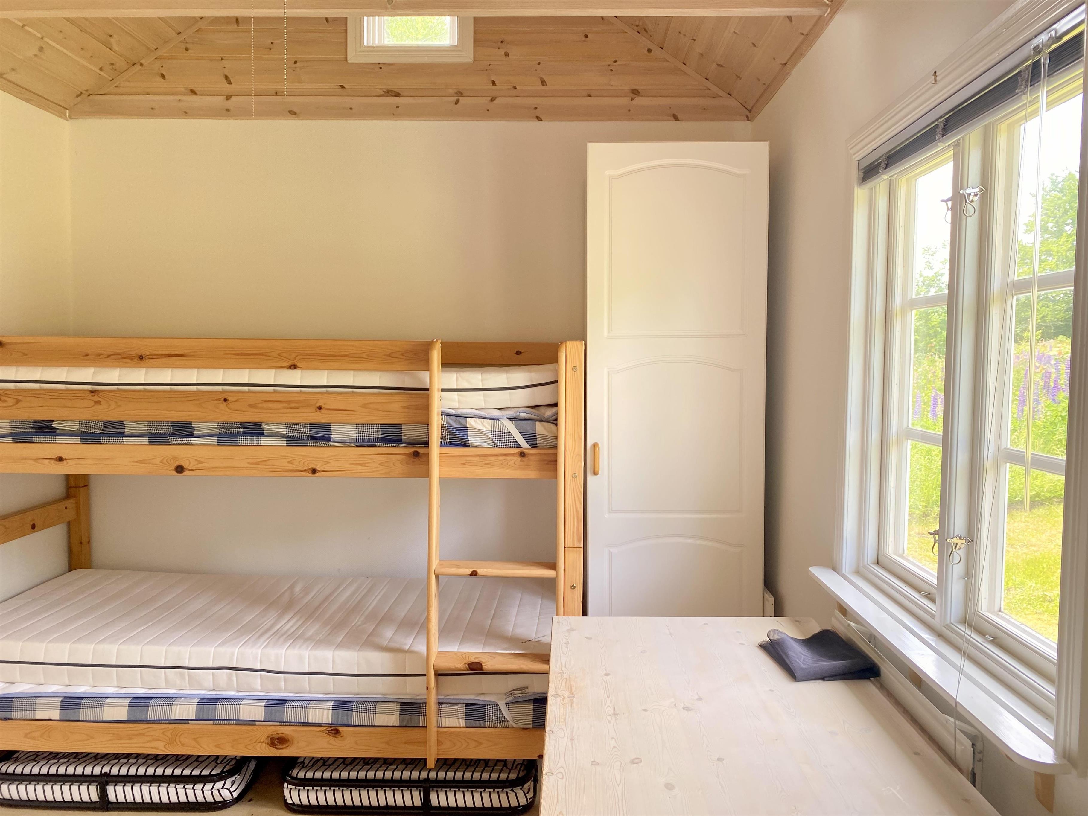 Im kleineren Haus gibt es ein Zimmer mit einem Etagenbett für zwei Kinder sowie ein ausziehbares Bett für 2 Personen. Außerdem gibt es ein sogenanntes Daybed und ein Babybett. In diesem kleineren Haus befindet sich derzeit ein Waschbecken und eine Campingtoilette, die der Eigentümer im Winter 2024 gegen eine Verbrennungstoilette austauschen wird. Dann wird auch eine Dusche installiert. Hier gibt es bereits eine Küche mit Kühlschrank/Gefrierfach und einer Kaffeemaschine.