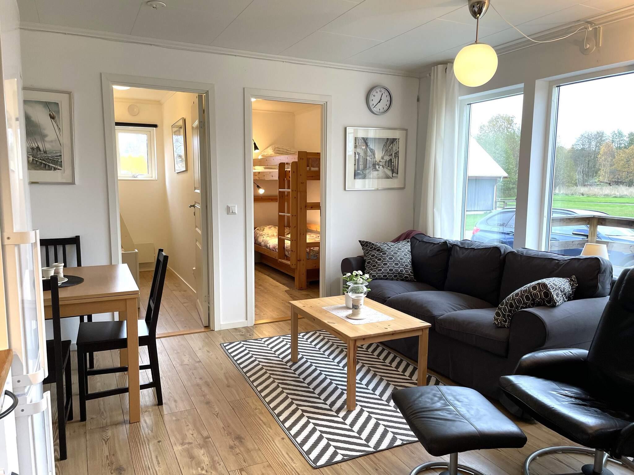 Stugan har öppen planlösning med stora fönster för rymd och fint ljusinsläpp. Modernt välutrustat kök med diskmaskin samt matplats. Soffa samt skön fåtölj med tv där ni har Viaplays lilla paketutbud av kanaler. Ni har tre sovrum, det ena med två enkelsängar som går att flyttas samman samt två sovrum med vardera en våningssäng. Fräsch toalett med dusch.