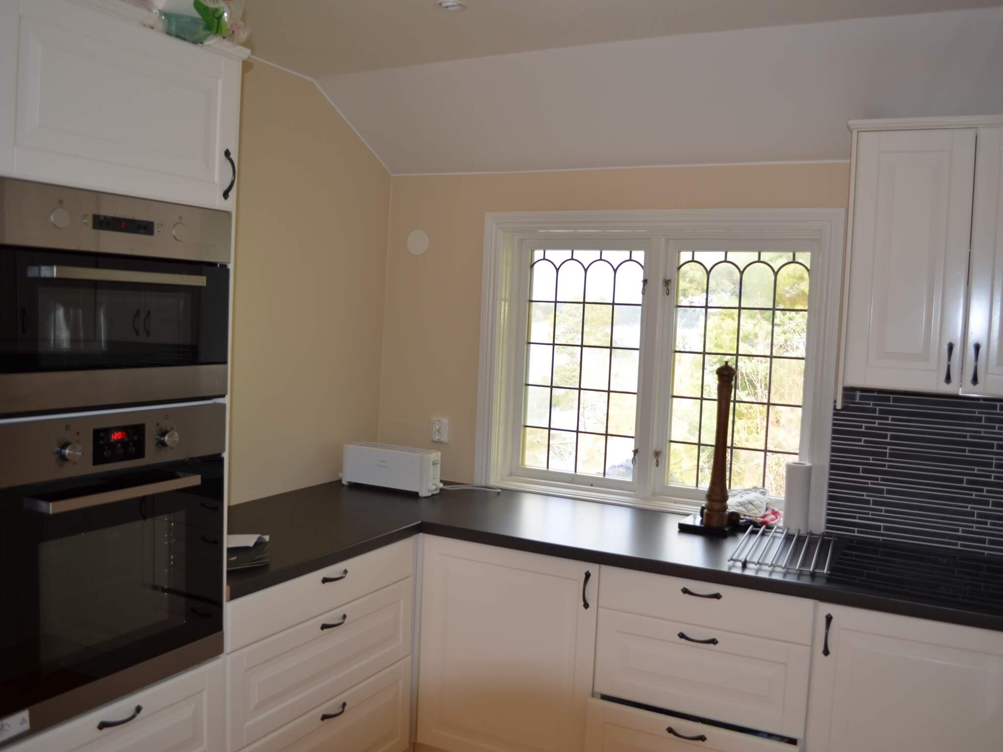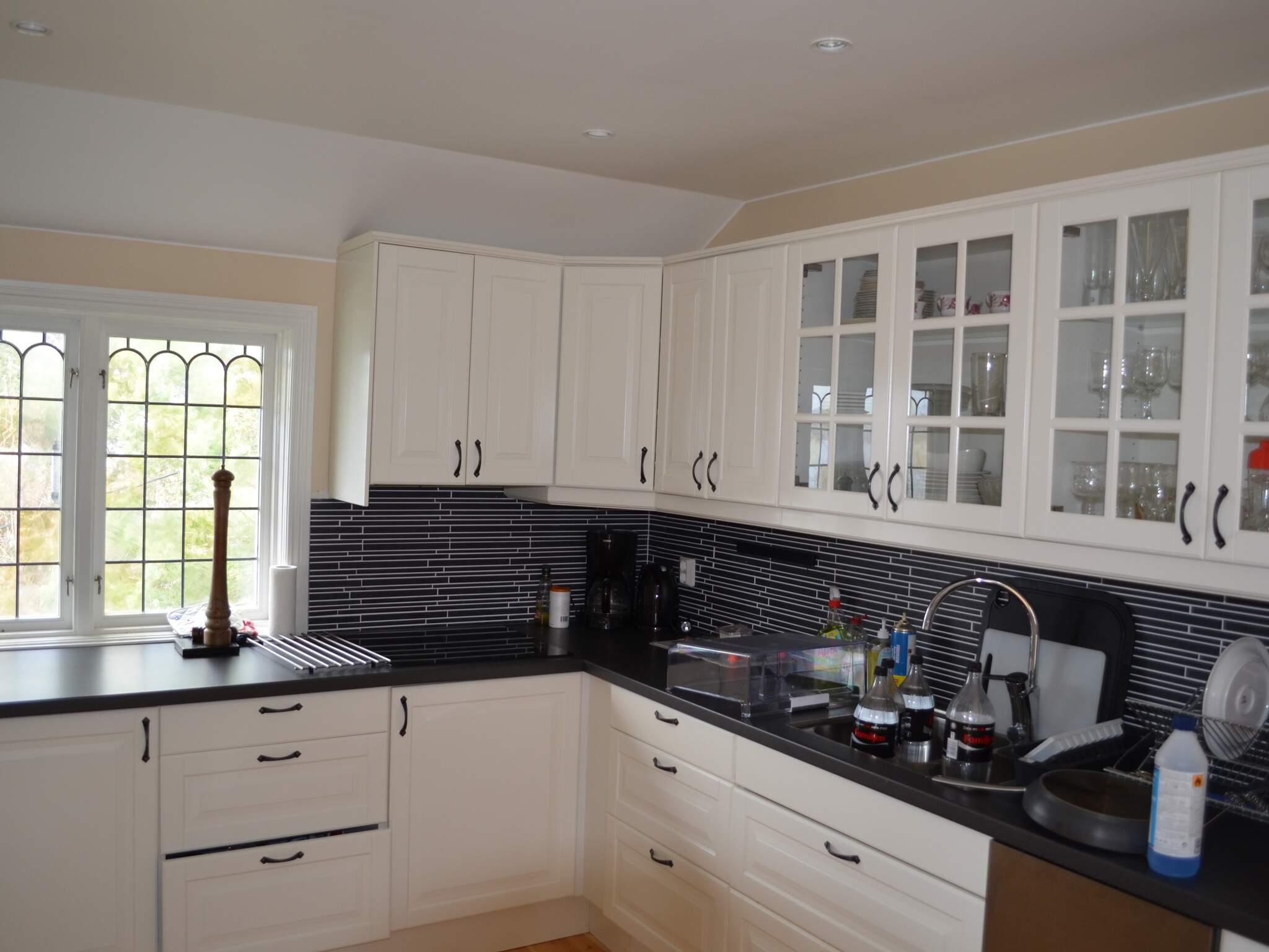Köket är helt nytt och välutrustat. Fräscht med vita skåp och svart kakel. Keramikhäll, ugn, fläkt, mikrovågsugn, kyl och frys, diskmaskin, brödrost, vattenkokare, kaffebryggare. Matplats i köket.
