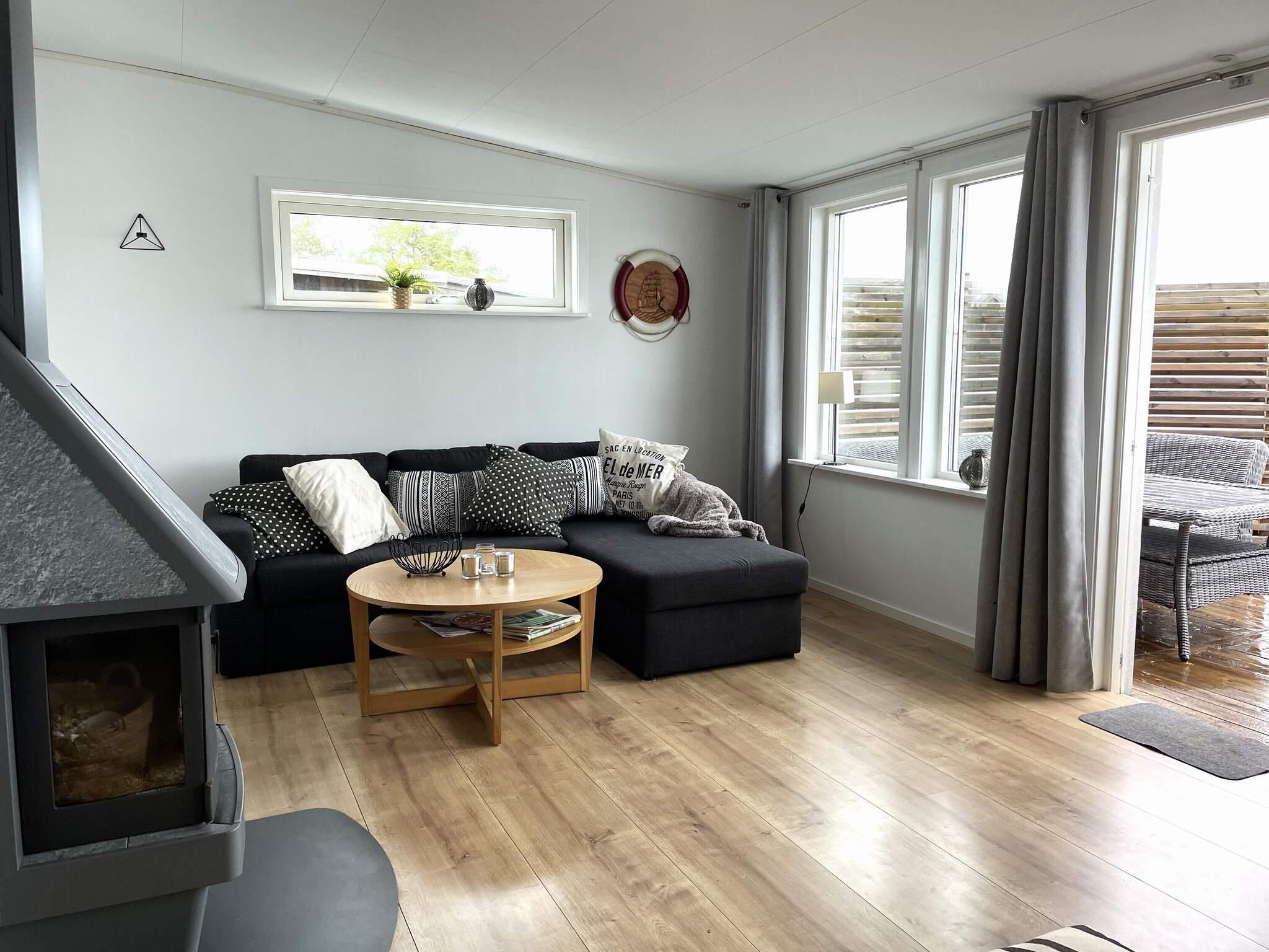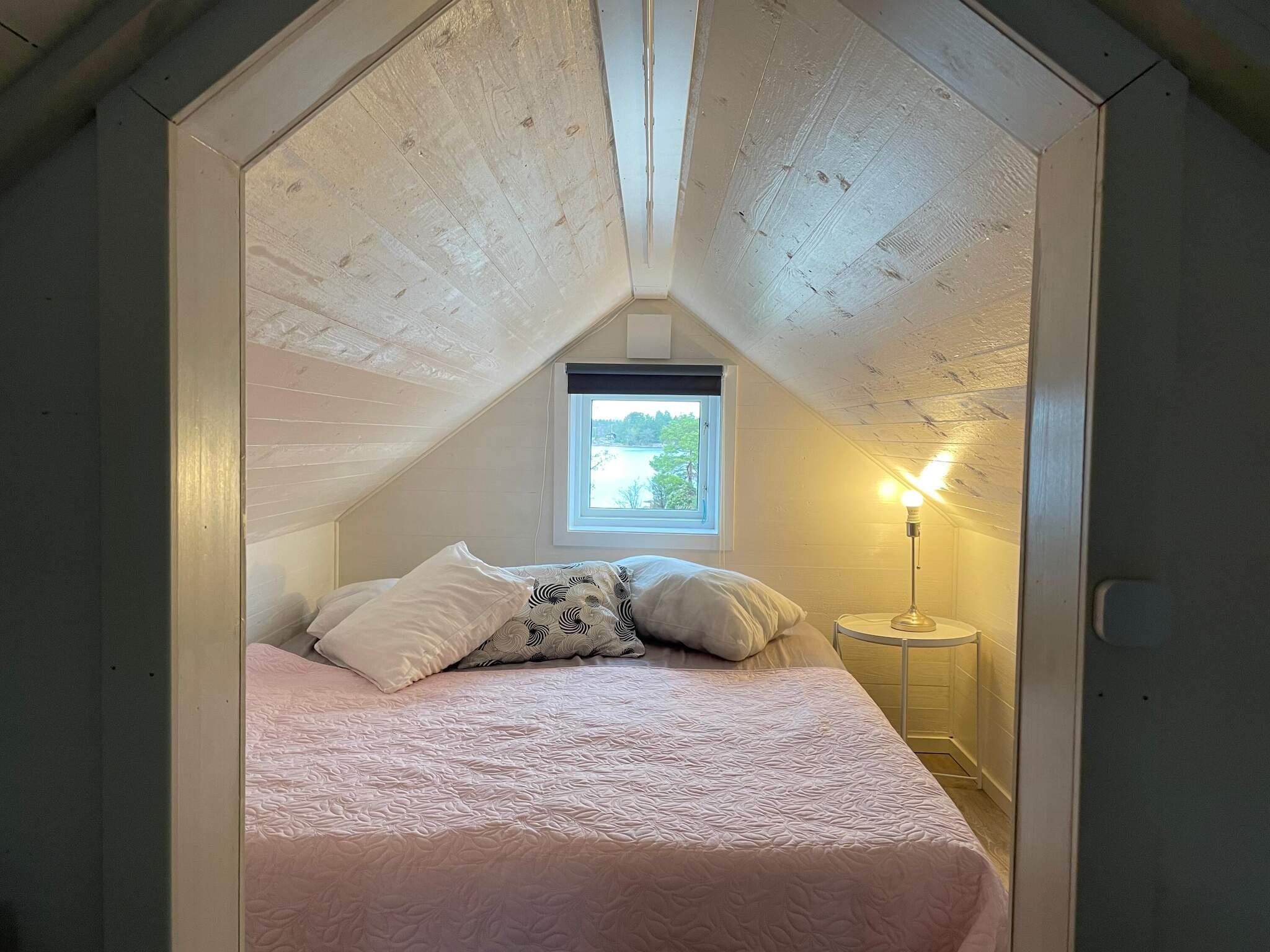 Det finns 3 sovrum, ett på nedervåningen utrustad med en dubbelsäng (160cm) av fin kvalitet. En trappa upp finns ett sovrum med lägre takhöjd direkt under taknocken med en 160cm dubbelsäng. Utifrån altanen med egen ingång finns det tredje sovrummet med två familjevåningssängar. Huset har en toalett med dusch samt tvättmaskin.