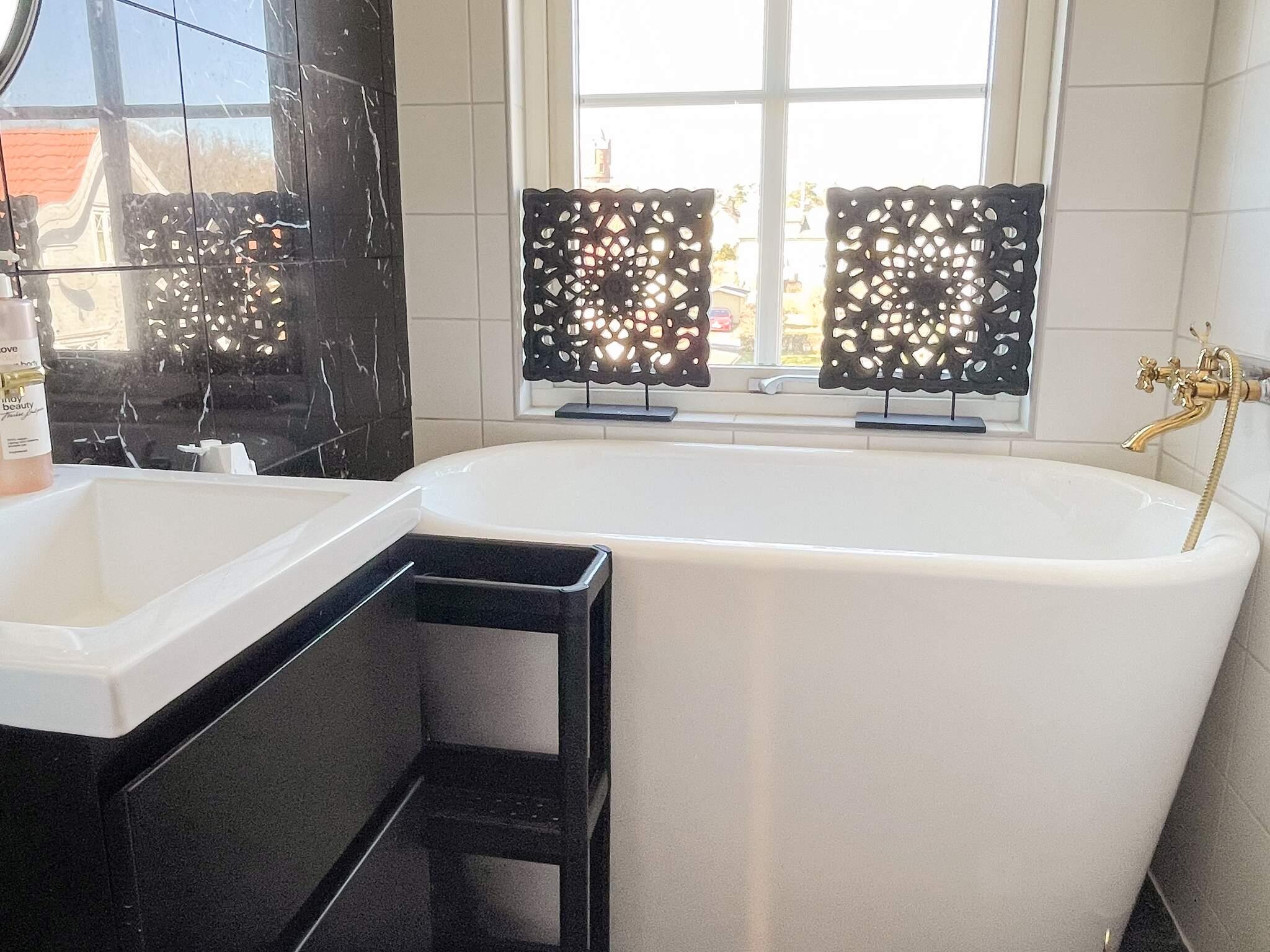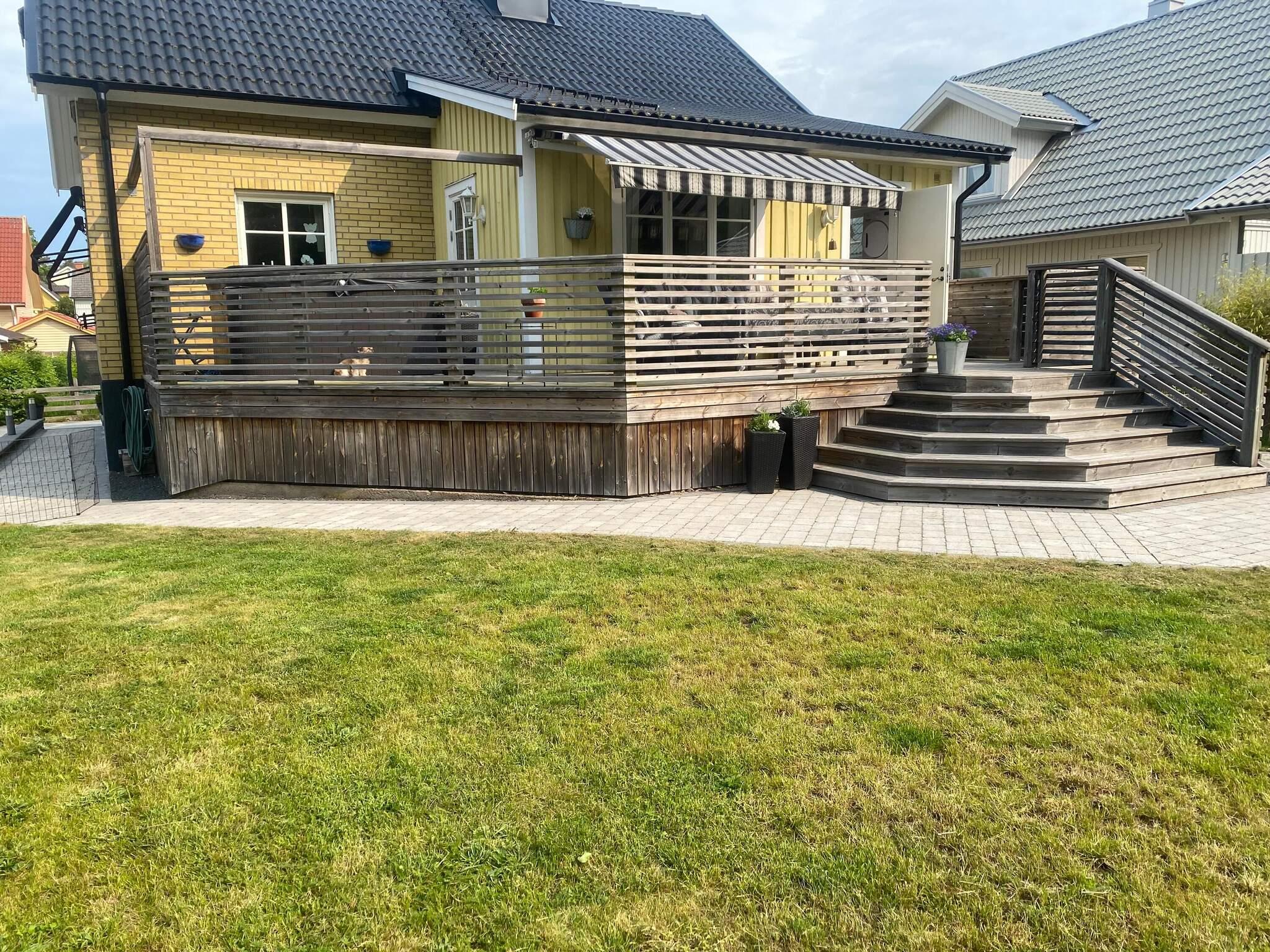 Huvudentrén på husets baksida har en kombinerad hall och tvättstuga. Vidare in i det välutrustade köket finns även stort matbord med mat stol för den minsta gästen och leksaker, spel och böcker att använda. Den öppna planlösningen in till vardagsrummet med ytterligare ett bord och stolar att samlas kring har även en rymlig soffa framför TV:n med chromecast. Bäddmadrass finns till soffans ena del för att använda som extrabädd. Ytterdörr ut till möblerad terrass och med trappa ner mot gatan. I hallen finns ingång till kaklat badrum med dusch intill det mysiga sovrummet med dubbelsäng och bra förvaring i garderober med skjutdörrar. En trappa leder dig till övervåningen som har ett sovrum med hotellkänsla. Här finns plats för medhavd barnresesäng och gott om förvaring i skåp och lådor utmed rummets väggar. Båda sovrummen har elektriskt ställbara sängar för att få den perfekta sömnen. Fräscht badrum med wc, handfat och litet badkar.