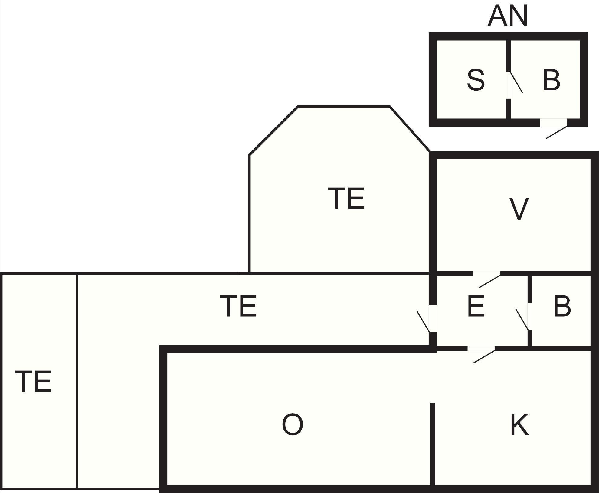 I entrén kommer du in till hallen och till vänster kommer man in till sovrummet. Här inne finns en dubbelsäng på 160 cm samt en våningssäng på 80 cm. I vardagsrummet finns en bekväm soffa som man lätt kan göra om till en bäddsoffa på 120 cm. Vid de lite kallare dagarna kan man sitta inne runt matbordet och höra sprakandet och känna värmen från den öppna spisen som finns här. Köket är väl planerat med stora ytor. Jämte hallen finns en mindre toalett.