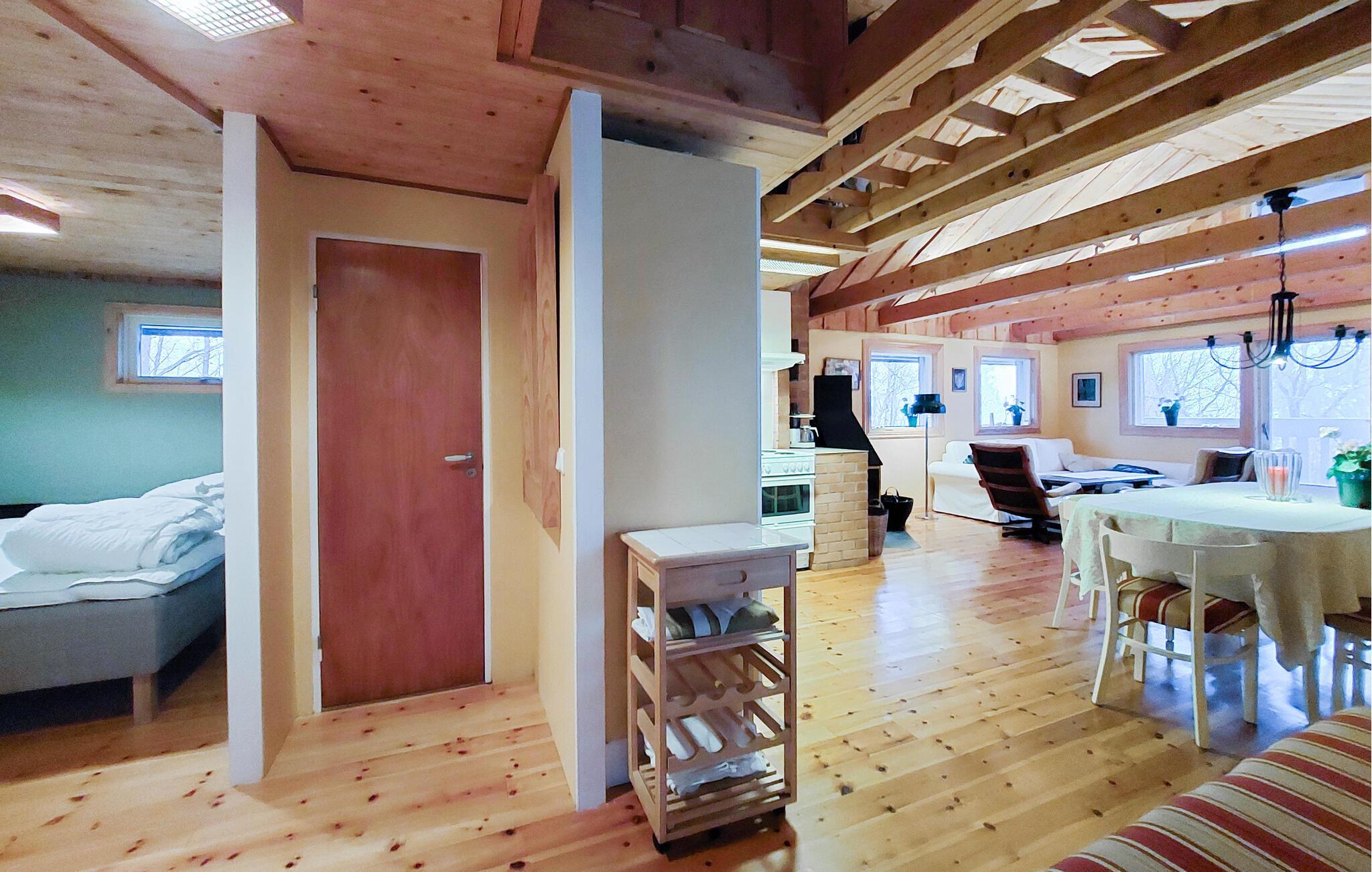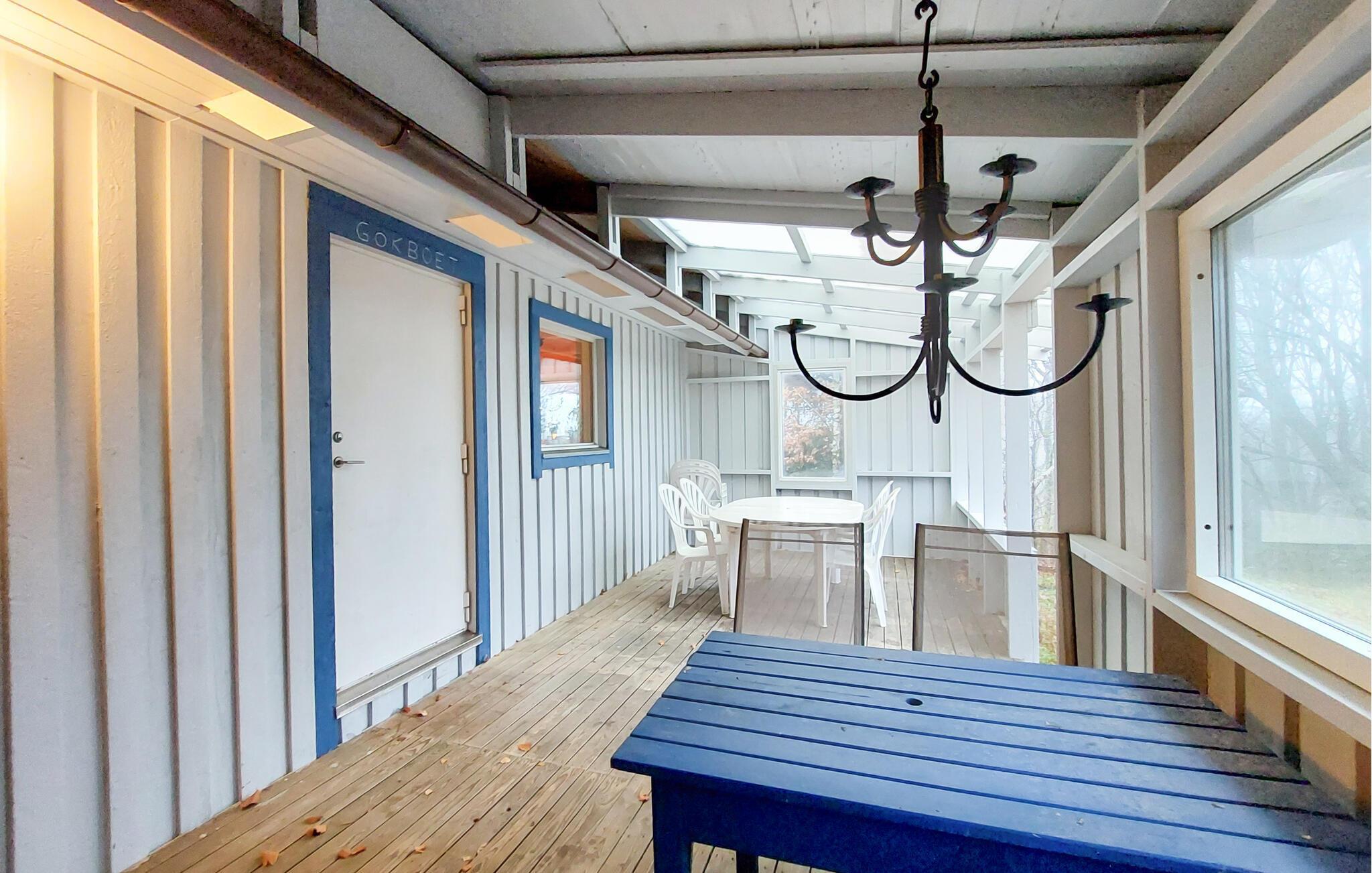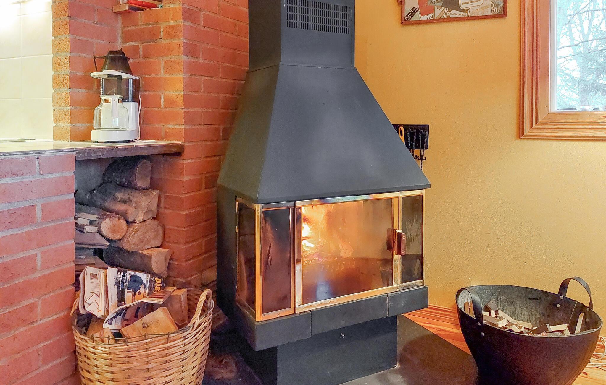 Det sjarmerende feriehuset med stor takhøyde og en innbydende hyttestemning er ideelt for naturelskere og de som søker fred og ro. Gå ut på den overbygde verandaen og nyt utsikten over skogen. Dette er det ideelle stedet for frokost eller uteservering. Inne finner du en åpen stue med varme tretoner og store vinduer som slipper inn rikelig med lys. Slapp av i det komfortable sofahjørnet foran peisen og la kveldene forsvinne i en koselig atmosfære. Les en bok eller bare nyt freden og roen. Lag favorittrettene dine på kjøkkenet og server dem ved det store spisebordet, som har plass til hele familien.