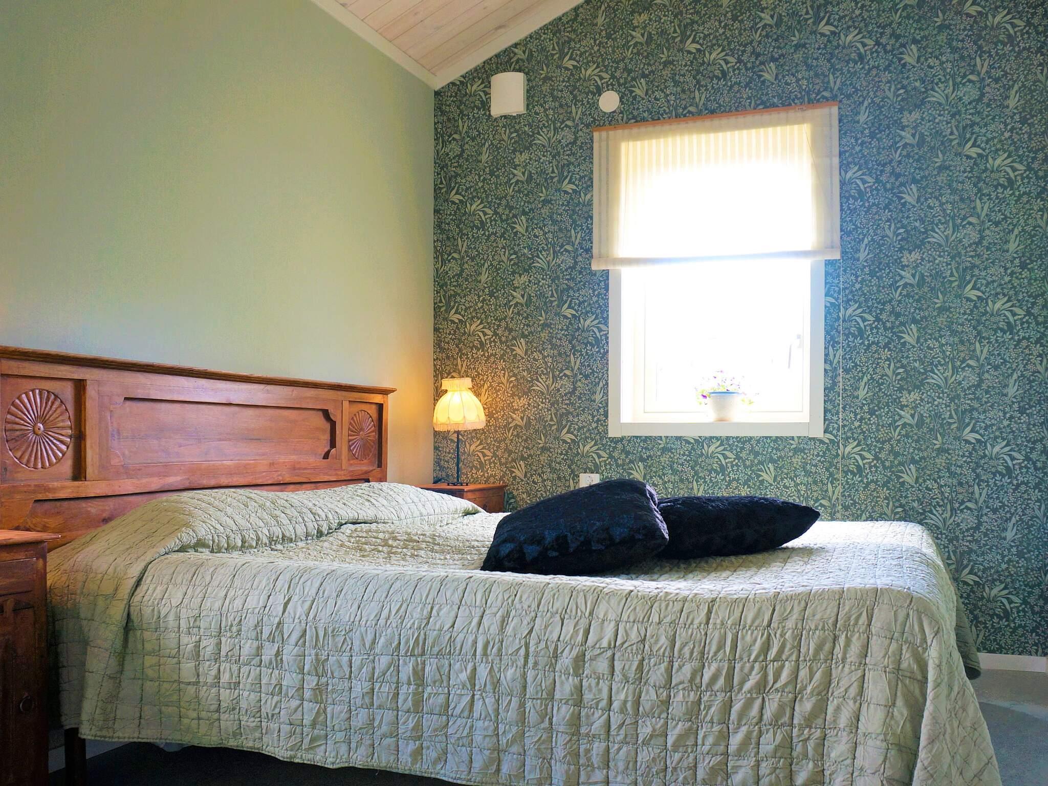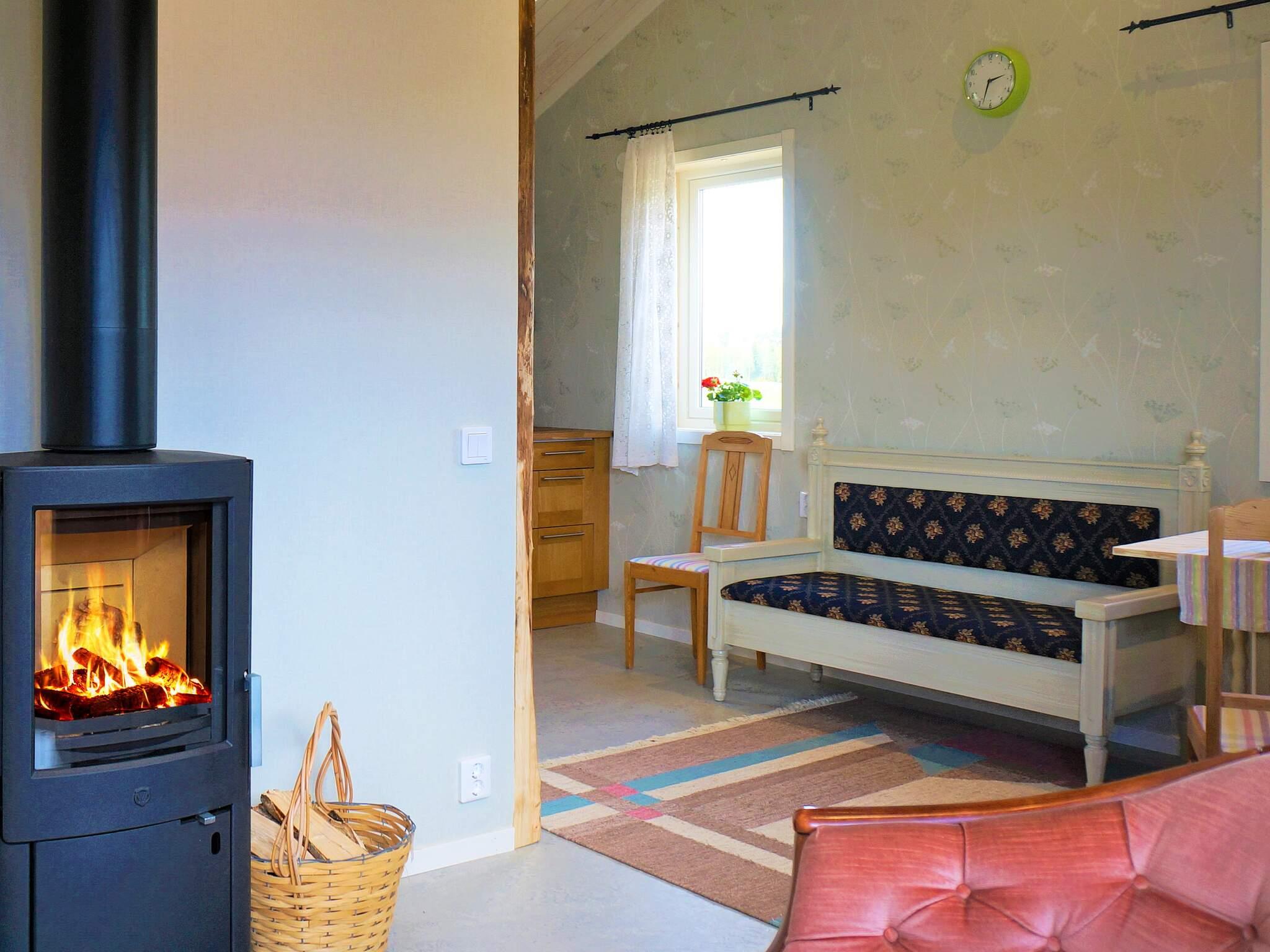 Rakt fram kommer det stora sovrummet med extra bred karm. Stillsam inredning och ett sovrum för harmoni. Vardagsrum och kök är integrerat i ett. I vardagsrummet står en kamin som sprakar gott kyliga kvällar och i anslutning finner man dörren ut till altanen. Här skiner kvällssolen gott. Köket är av ek, gediget, fräscht och öppet. Där finner du matbord för 4 personer.