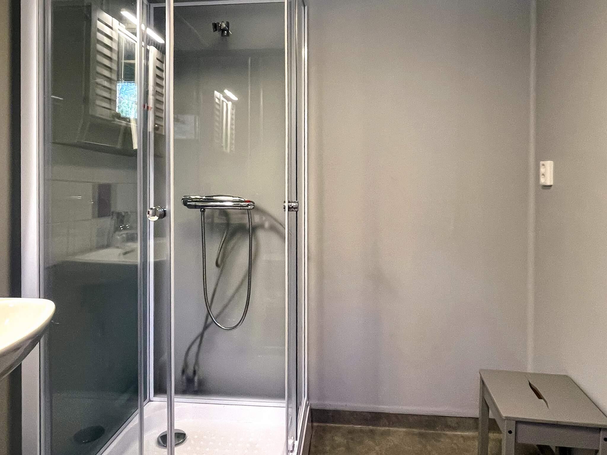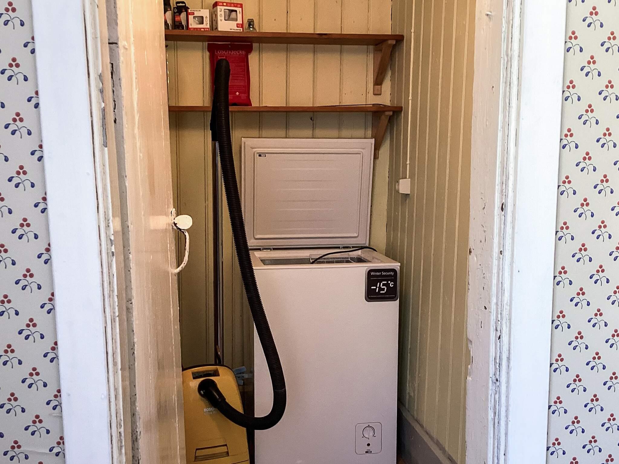 Köket rakt fram har allt man kan behöva. Det finns en diskmaskin, elspis med plattor, ugn, mikro och kylskåp. I den lilla dörren rakt in från köket – där finner man frysbox och städartiklar. Badrummet är helt ljus, rymligt och modernt. Här finns duschkabin, wc och handfat.