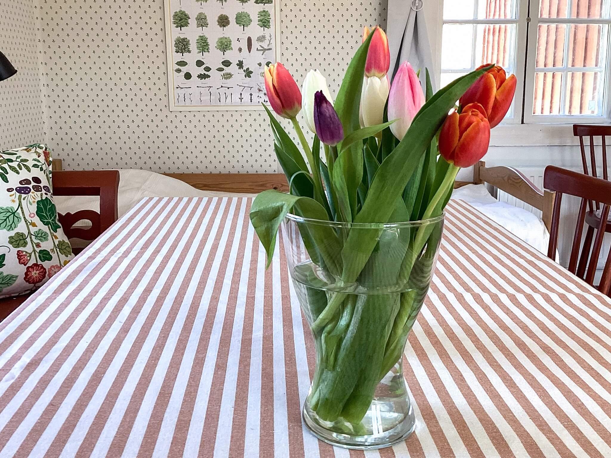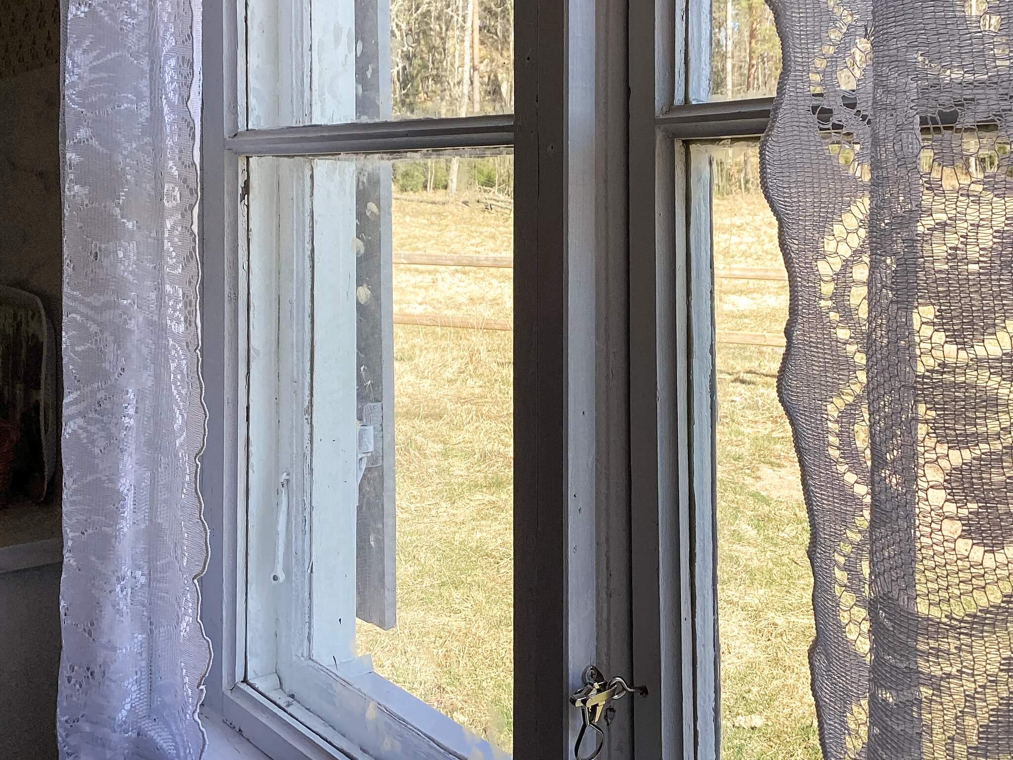 Du välkomnas in genom den vita dörren i en mindre hall. Till vänster öppnar allrummet upp sig där nytt möter den äldre charmen. Här inne finns två enkelsängar på varsin sida av rummet. I mitten står matsalsbordet med en gedigen kökssoffa. Det känns som att bo ett dockskåp. Väldigt hemtrevligt och sött.