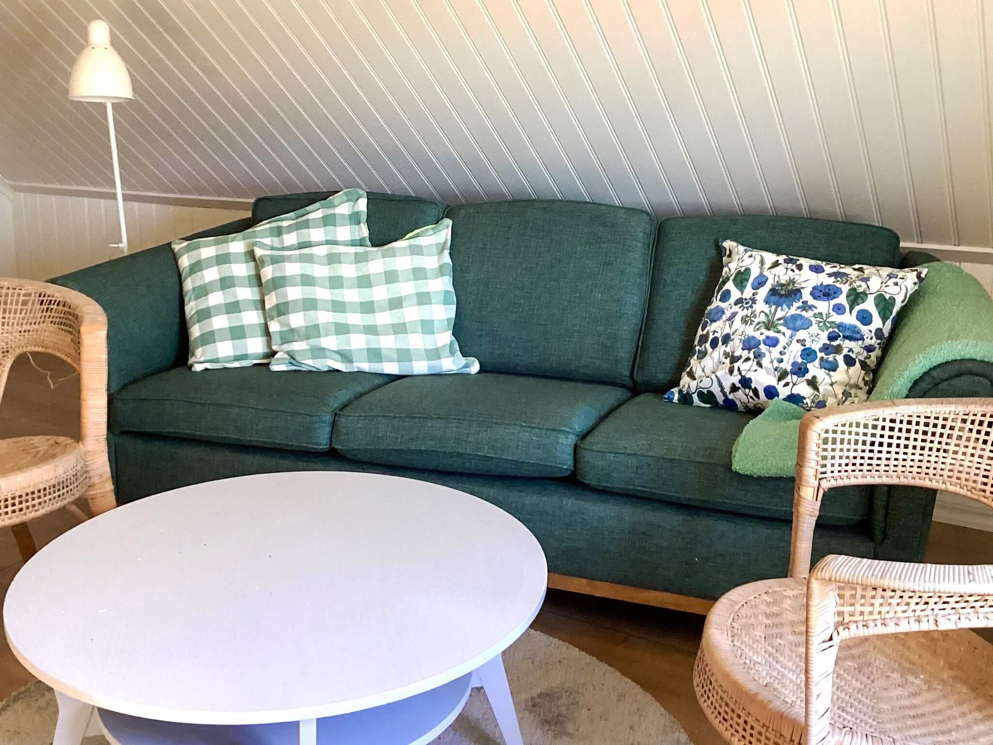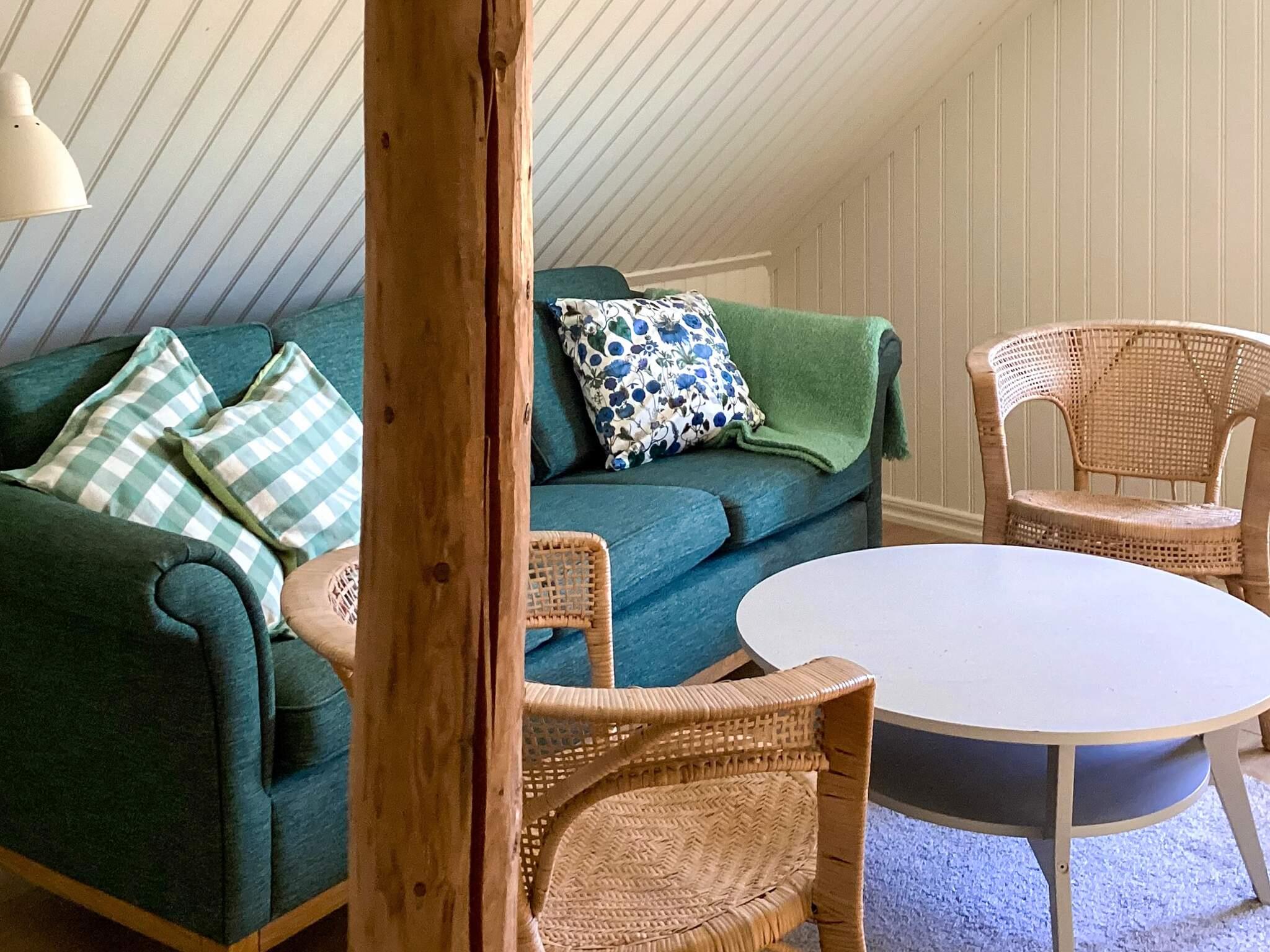 Här uppe här ytterligare en myshörna med soffa och fåtöljer. Innanför gömmer sig huset sovrummet med en dubbelsäng. Här uppe är det snedtak och där man sparat på de gamla balkarna från torpet original.