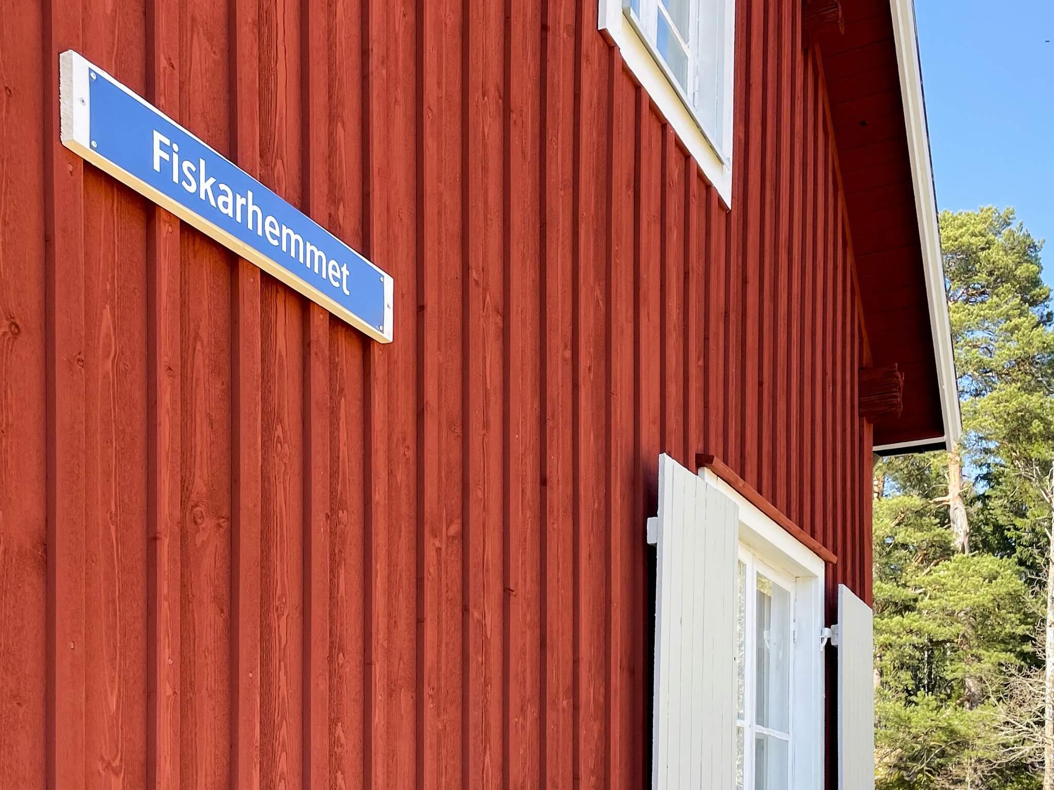 Torpet har en klassisk svensk röd fasad med vita knutar, en fin blå skylt på husets gavel som ger en inbjudande och varm känsla. Utanför stugan finns en sittgrupp, perfekt för att njuta av morgonkaffet eller en lugn kväll med goda vänner.