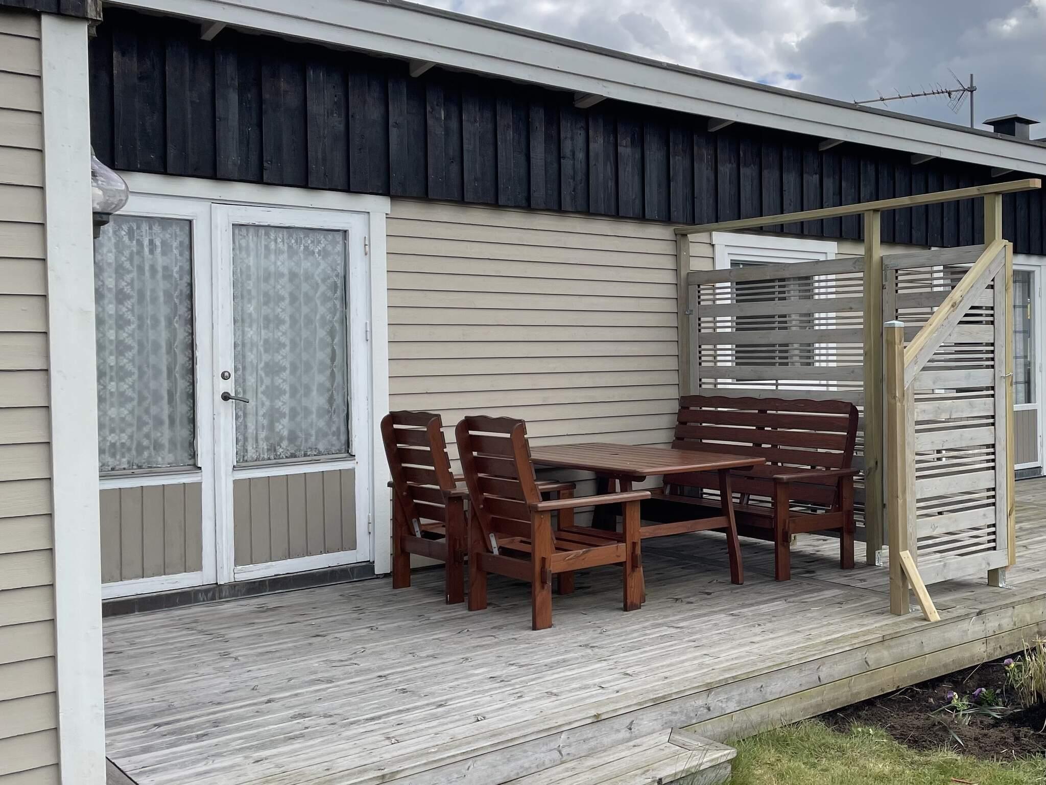 Ni bor i en del av ägarens hus med egen avdelad uteplats och tillgång till den gemensamma tomten. Från entrén vid altanens vänstra sida kommer ni till en mindre hall. Till höger finns ett välutrustat kök och ett badrum med dusch. Vardagsrummet är rymligt och har ett matbord. Här finns två bäddsoffor och en TV med svenska kanaler. Sovrummet har två enkelsängar. Er del av uteplatsen är avdelad med en skärmvägg och här finns bekväma utemöbler och grill.