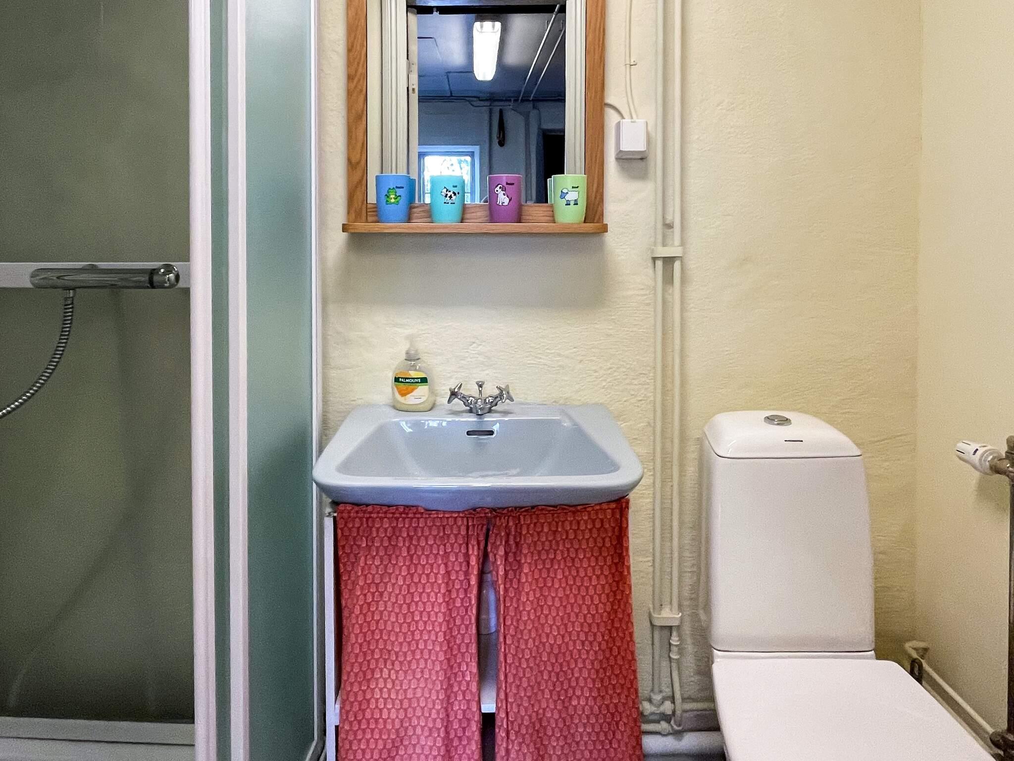 Vid stugans entré kommer ni in i en hall som används som pannrum där det finns en tvättmaskin och där ni når badrummet.