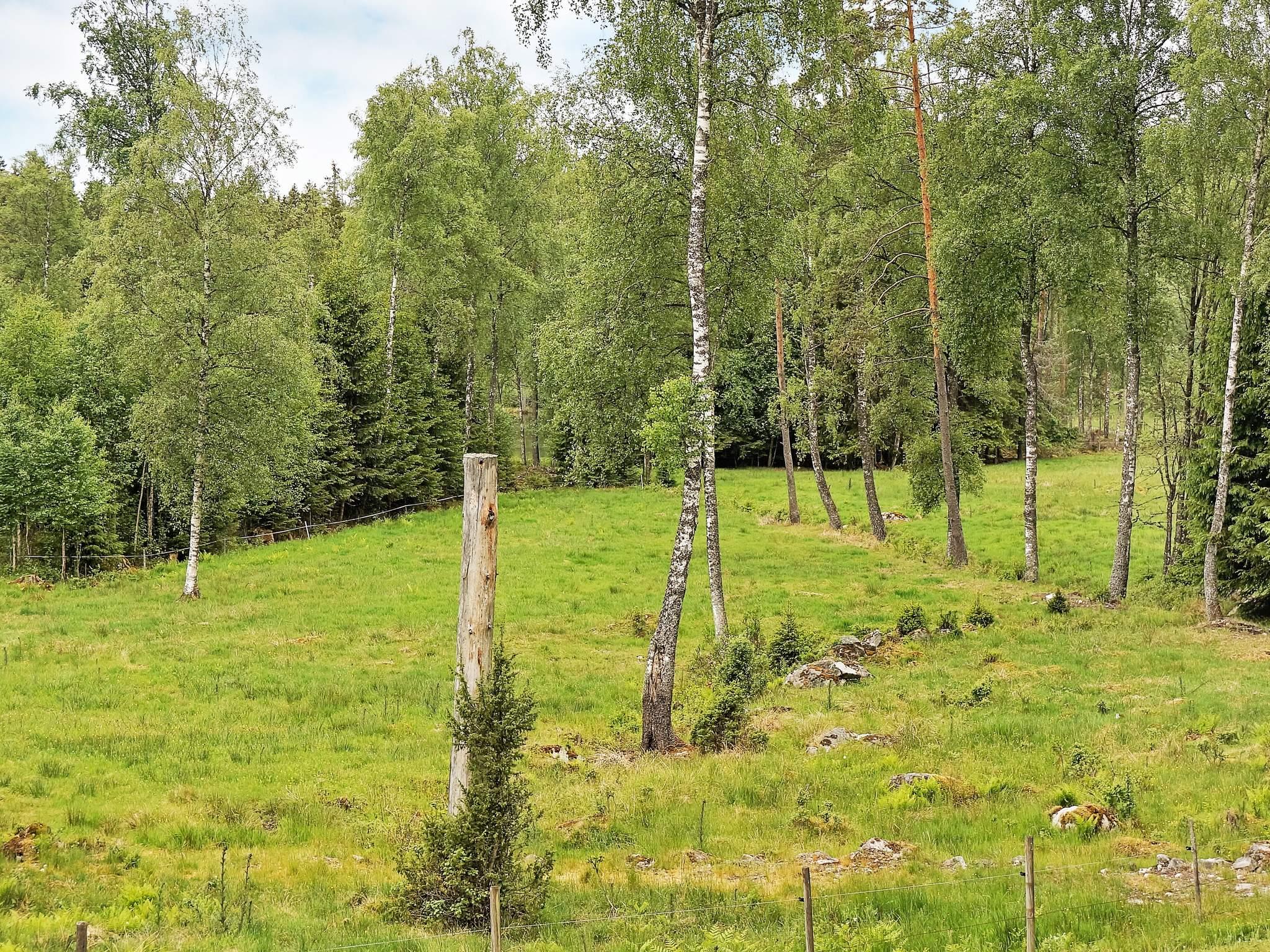 Skogsnära fritidshus med vacker utsikt över ängen och skogen från balkongen. Den lilla sjön ligger bortom träden och skymtar till under kallare årstider.