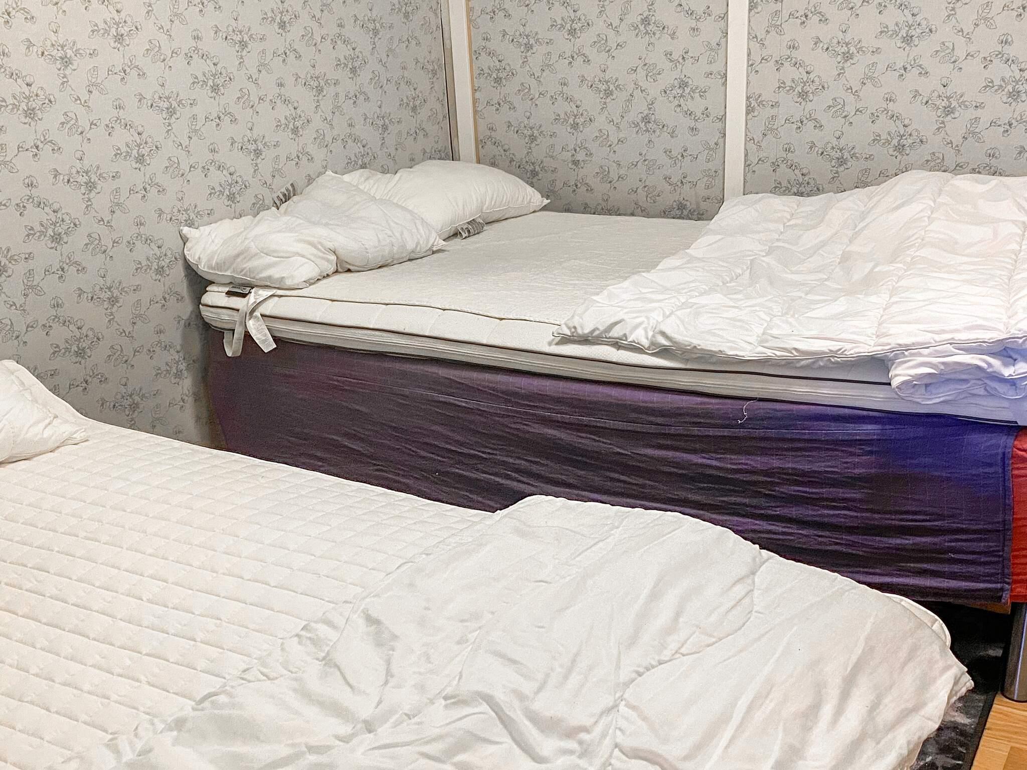 En trappa upp kommer man in i en rymlig hall. Direkt till höger ligger ett sovrum som har en dubbelsäng (2x90cm). Här finns bra förvaring i form av en klädgarderob samt en byrå. Utanför ligger ett öppet kök som är integrerat med vardagsrum med bäddbar soffa (120cm), TV och matplats. I nästa sovrum finns en säng (120cm) och en bäddsoffa (120cm), garderob finns. På det här planet finns även en toalett med handfat och wc. En trappa ner i källaren finns ett badkar med dusch, tvättmaskin och egen utgång till trädgården. Boendet är mest lämpat för familj med 2 vuxna och 2-3 barn.