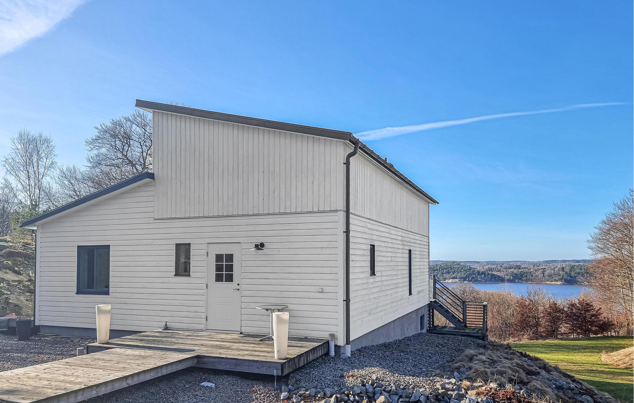Gå ut på den romslige terrassen og nyt den vidstrakte utsikten over fjorden. Avslutt dagen i boblebadet på terrassen og slapp av i det varme vannet med utsikt over landskapet. Husets høye beliggenhet sørger for en spesielt vakker utsikt og en fredelig atmosfære.