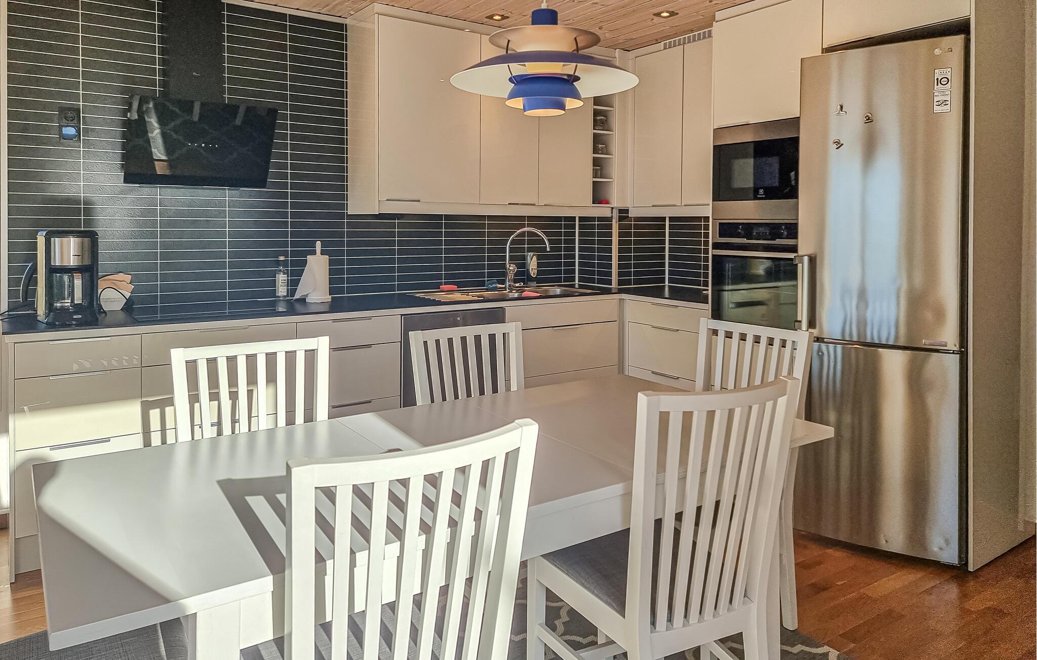Stuen har åpen planløsning og kombinerer sittegruppe, spiseplass og kjøkken. Sett deg godt til rette i de koselige sofaene og nyt utsikten over vannet, som blir en integrert del av oppholdsrommet gjennom de store vinduene. Deretter kan du sette deg ved spisebordet og planlegge dagen i en avslappet atmosfære. På det moderne kjøkkenet kan dere enkelt tilberede måltider sammen. Du kan også trekke deg tilbake til det andre oppholdsrommet og tilbringe avslappende timer der med en film eller en bok.