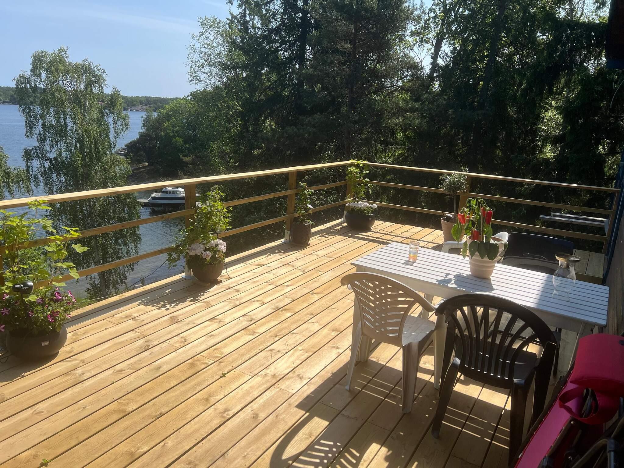 Runt huset finns flera altaner med trevliga sittplatser och då huset ligger högt är det insynsskyddat. En stor gräsyta för lek och spel ligger intill huset. Det finns två sovrum, ett med en 140 säng och ett med en 140 säng och en juniorsäng. Eventuellt kommer det en enkelsäng till i vardagsrummet, men det går att sova två i de större sängarna. Ett nyrenoverat badrum och ett stort kök med alla faciliteter ni kan behöva finns. Vardagsrummet är stort och har utgång till altanen mot vattnet. Parkering finns vid huset.