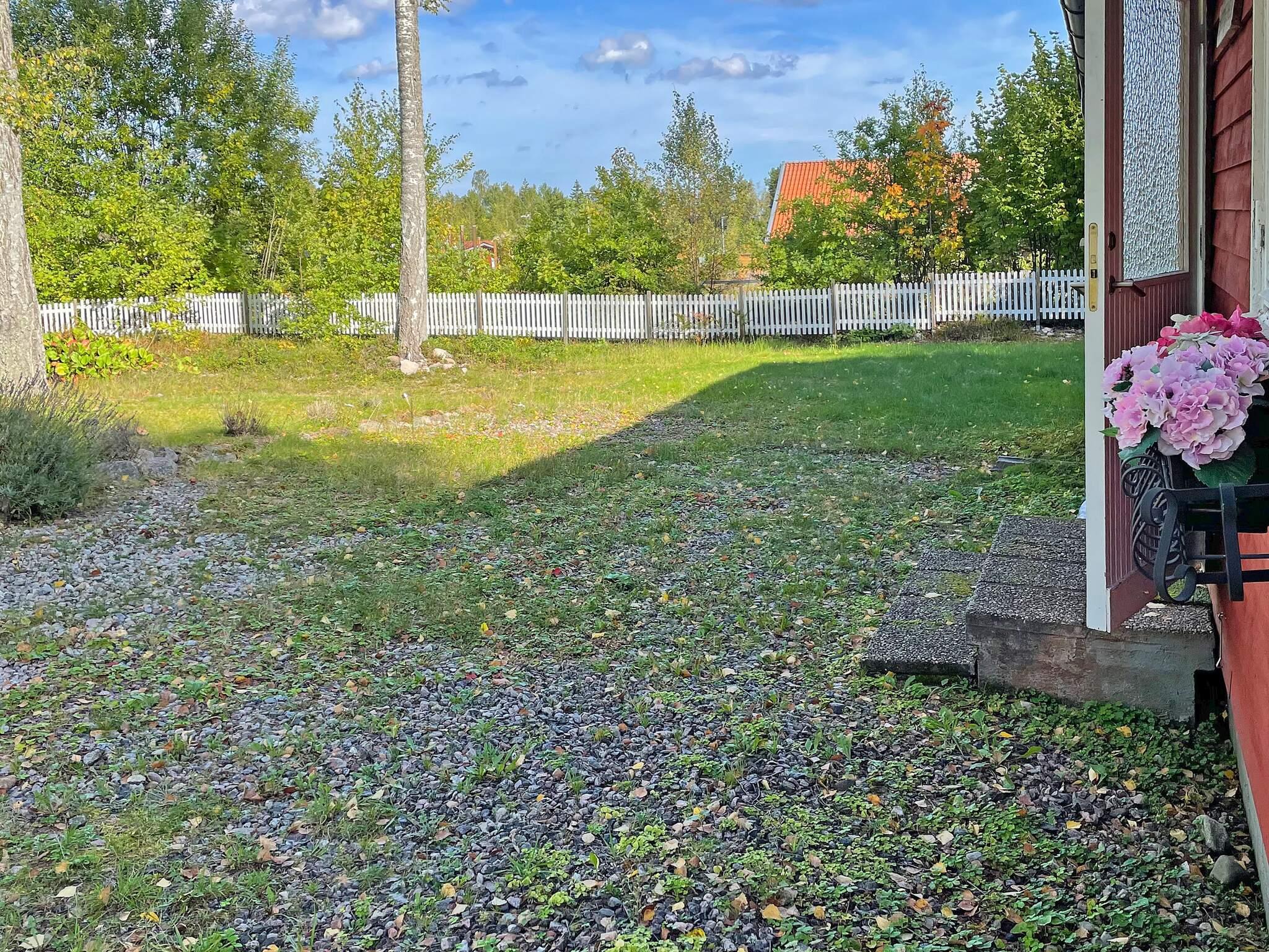 Stugan ligger i ett mindre stugområde vid en väg utan genomfartstrafik. Runt stugan är det lummigt och grönt under sommaren och du har gräsytor på tomten med gott om plats för uteaktiviteter.