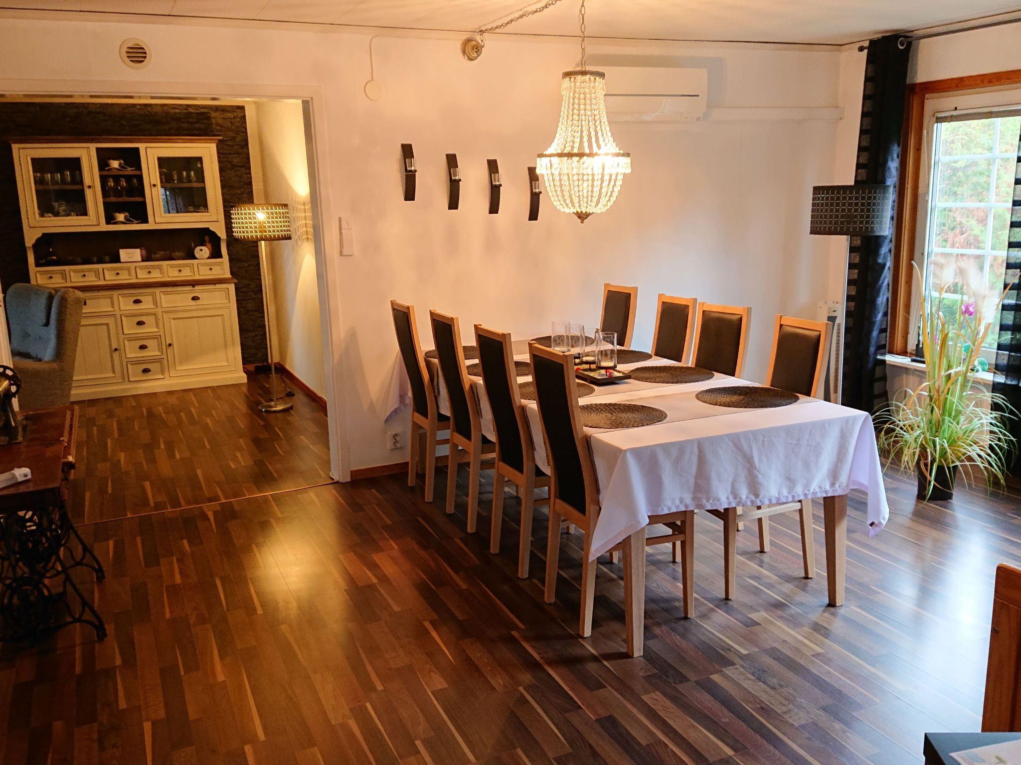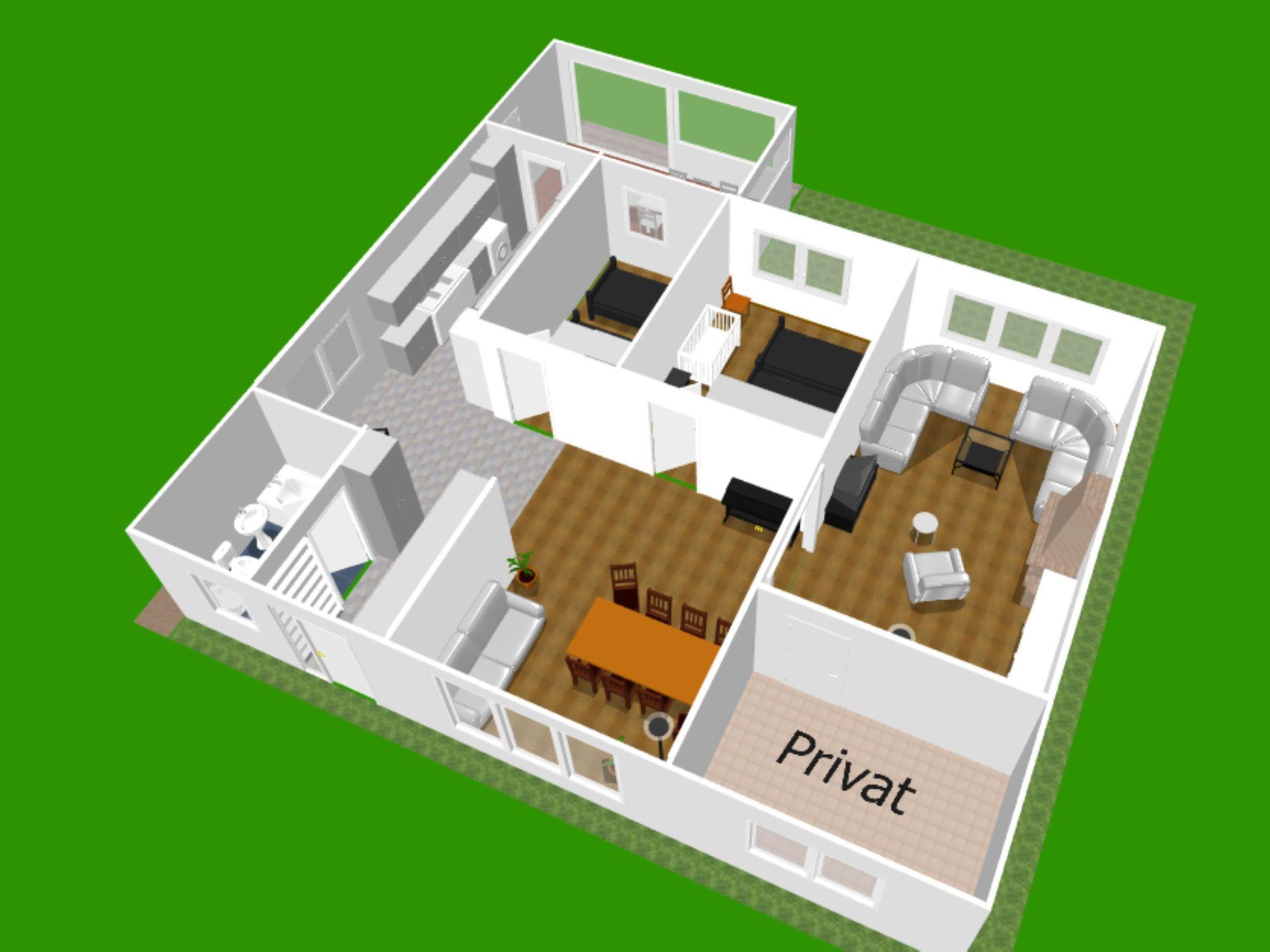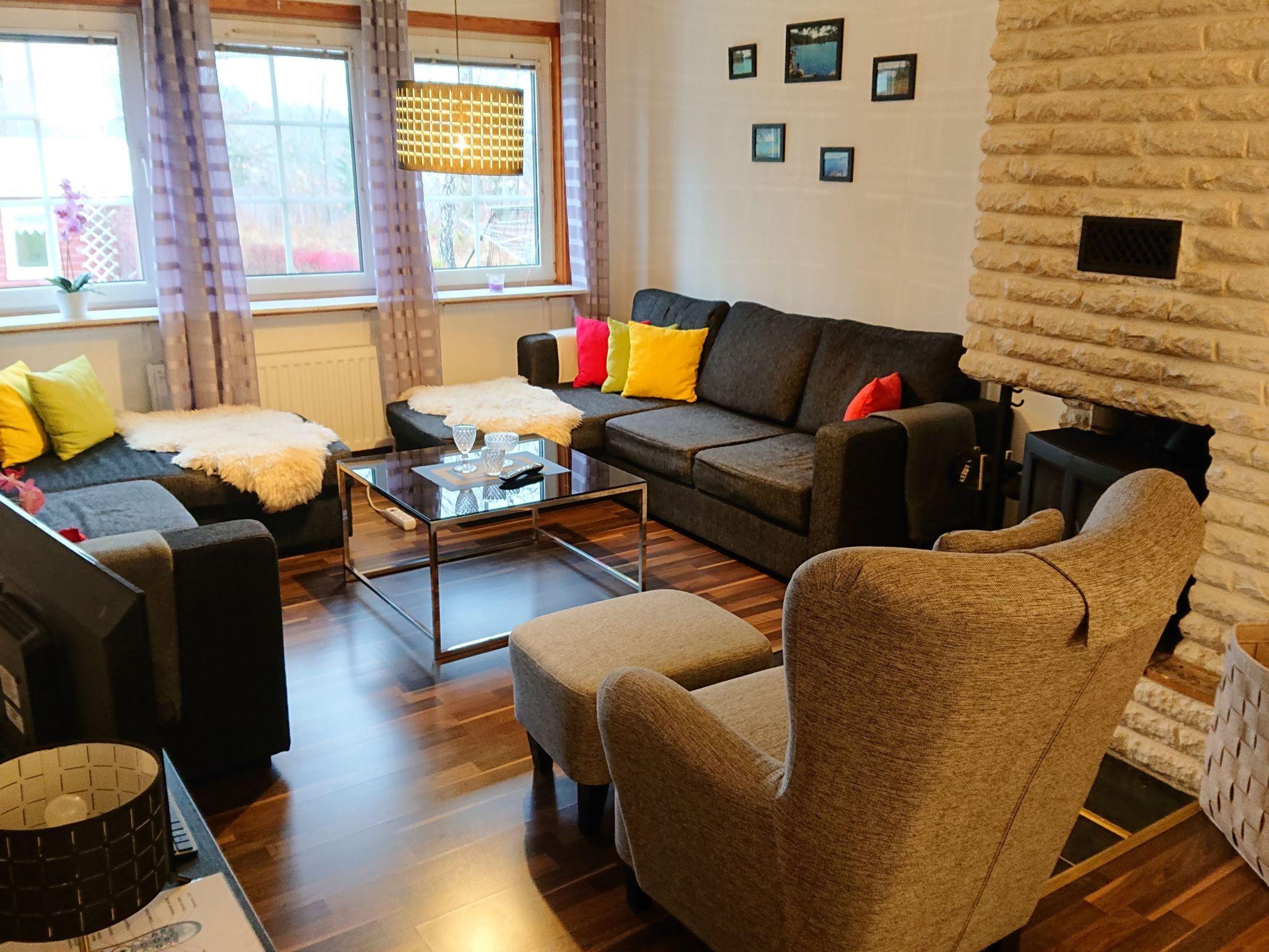 The house has a modern, cosy Scandinavian interior, furnished with attention to detail and equipped with all the necessary utensils for a pleasant and relaxing stay. Enjoy lovely evenings by the open fireplace with a flue lining. Or you can have breakfast in the morning sun on the roofed terrace, with a view over town. Cable TV with a USB port and more than 20 Swedish and some English channels is available, along with free Internet access and a selection of board games for all ages. Some German films are available on DVD. The house with around 100m² of living space can accommodate a maximum of eight people and features an open layout in combination with furnishing of a high standard. It has two separate bedrooms each with two single beds (90 x 200cm). The living room with a fireplace provides two sofa beds each for two people (140 x 200cm). There is also a sofa bed (90 x 200cm) in the dining area. A cot and a highchair complete the family-friendly furnishing. The property is of course heated and habitable in winter. All the rooms have electric radiators. There is also a heat pump which ensures that the house can be heated quickly, along with the fireplace.