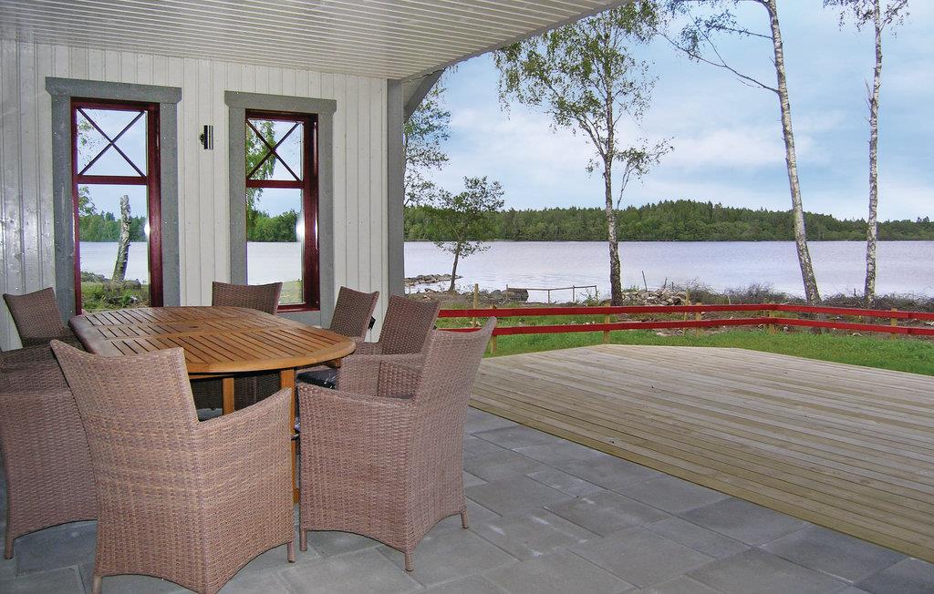 Feriebolig med fantastisk utsikt over innsjøen Flåren og gjennomtenkt arkitektur. Her er det kvalitet som teller. Miljøvennlig med trelagsvinduer og gulvvarme fra en energisparende varmepumpe. Her ønsker vi gjester velkommen hele året. Her er det god plass til alle. Kjøkkenet med kokeøy er mer enn eksepsjonelt. Det er gode dyner på alle soverommene. Vedovnen sørger for hygge til alle årstider. Badstue og boblebad er et must for mange. Den overbygde balkongen fortsetter ut på den åpne terrassen. En båt er inkludert, og du kan leie flere båter og en motor. Du kan fange gjedde, gjedde og abbor i innsjøen. Det er til og med isfiske om vinteren. Eget skur for fiskeutstyr direkte ved sjøen. Lekeplass for små barn 200 meter unna. Du bor i nærheten av Lagan. Laganland elgpark, Buslandet og en 36-hulls golfbane ligger 8 km unna. Shopping i Värnamo eller Ljungby. Om sommeren kan du besøke Astrid Lindgrens Värld og High Chaparral. Shopping i Jönköping eller Ullared.