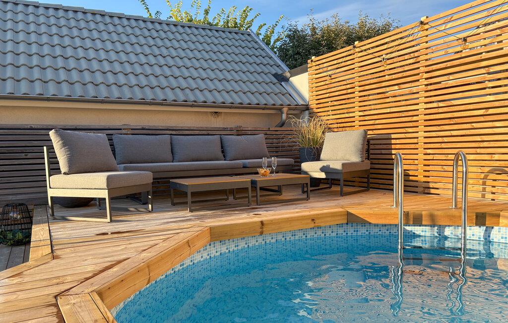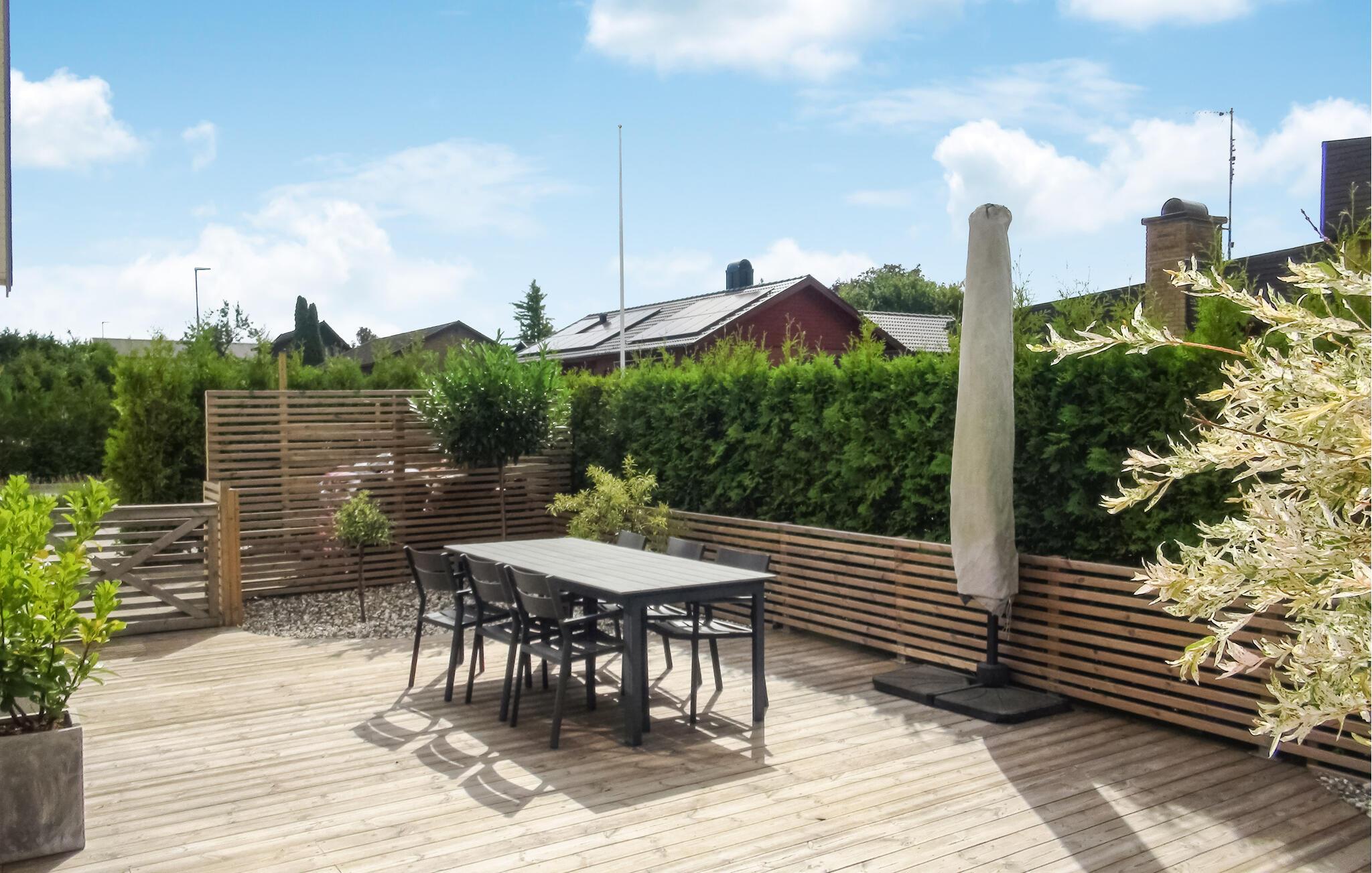 Unn deg en avslappende ferie i dette moderne feriehuset med en stor treterrasse.