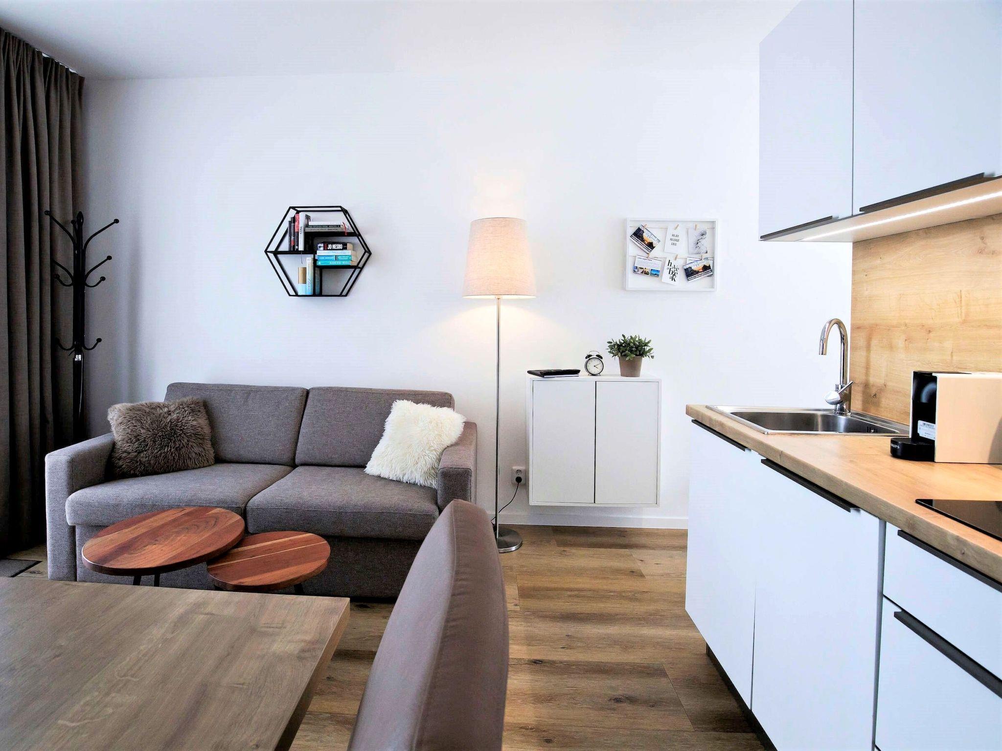 "Lakeside Village 4", 1-room studio 32 m2, on the ground floor. Object suitable for 2 adults + 2 children. Comfortable and cosy furnishings: living/sleeping room with 1 double sofabed and 1 double bed. Kitchenette (4 hot plates, oven, dishwasher, kettle, microwave, electric coffee machine) with dining table, satellite TV. Shower/WC. Floor heating. Balcony. Terrace furniture. Facilities: Internet (WiFi, free). Suitable for families. Maximum 1 pet/ dog allowed.