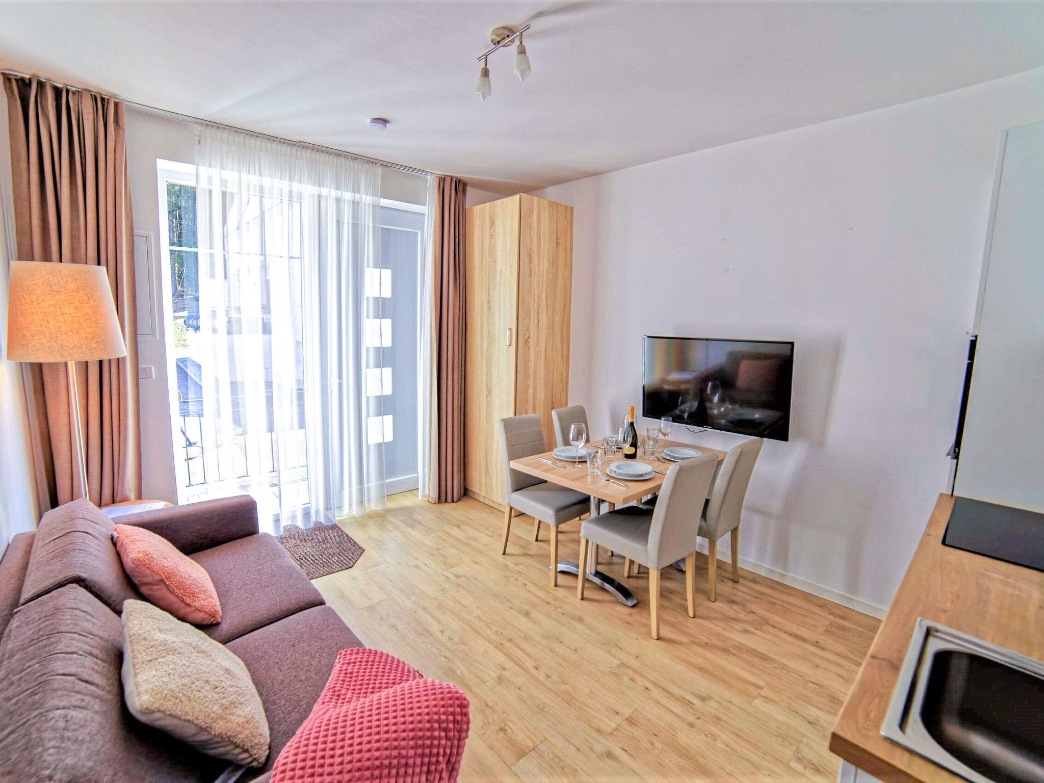 "Lakeside Village 5", 1-room studio 32 m2, on the ground floor. Object suitable for 2 adults + 2 children. Comfortable and cosy furnishings: living/sleeping room with 1 double sofabed and 1 double bed. Kitchenette (4 hot plates, oven, dishwasher, kettle, microwave, electric coffee machine) with dining table, satellite TV. Shower/WC. Floor heating. Terrace. Terrace furniture. Facilities: Internet (WiFi, free). Suitable for families. Maximum 1 pet/ dog allowed.