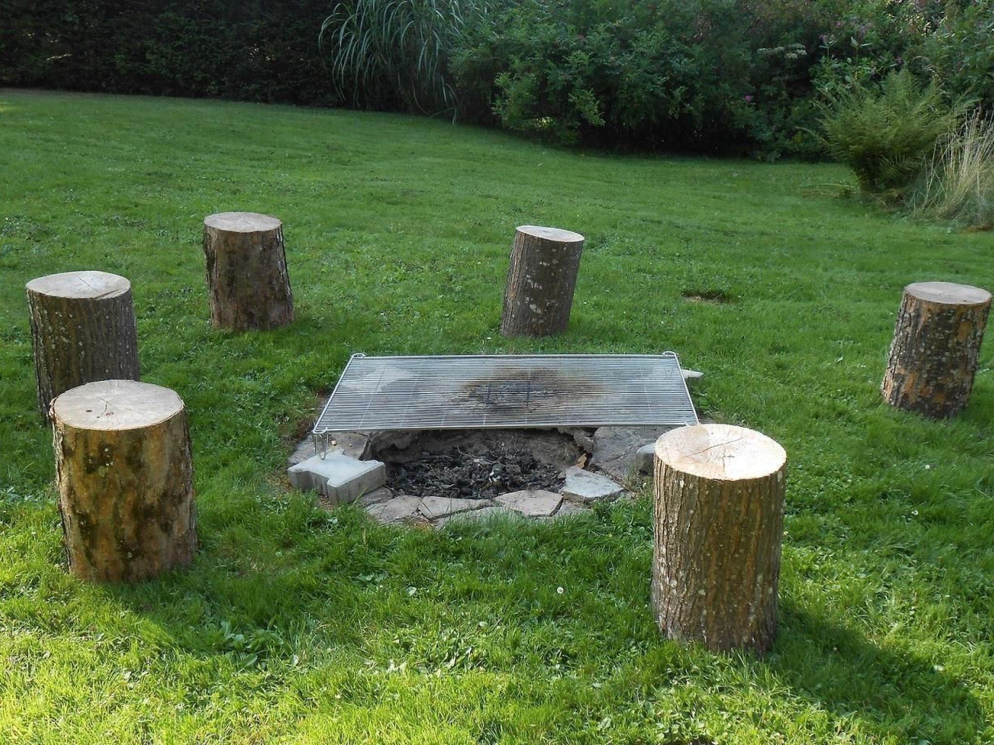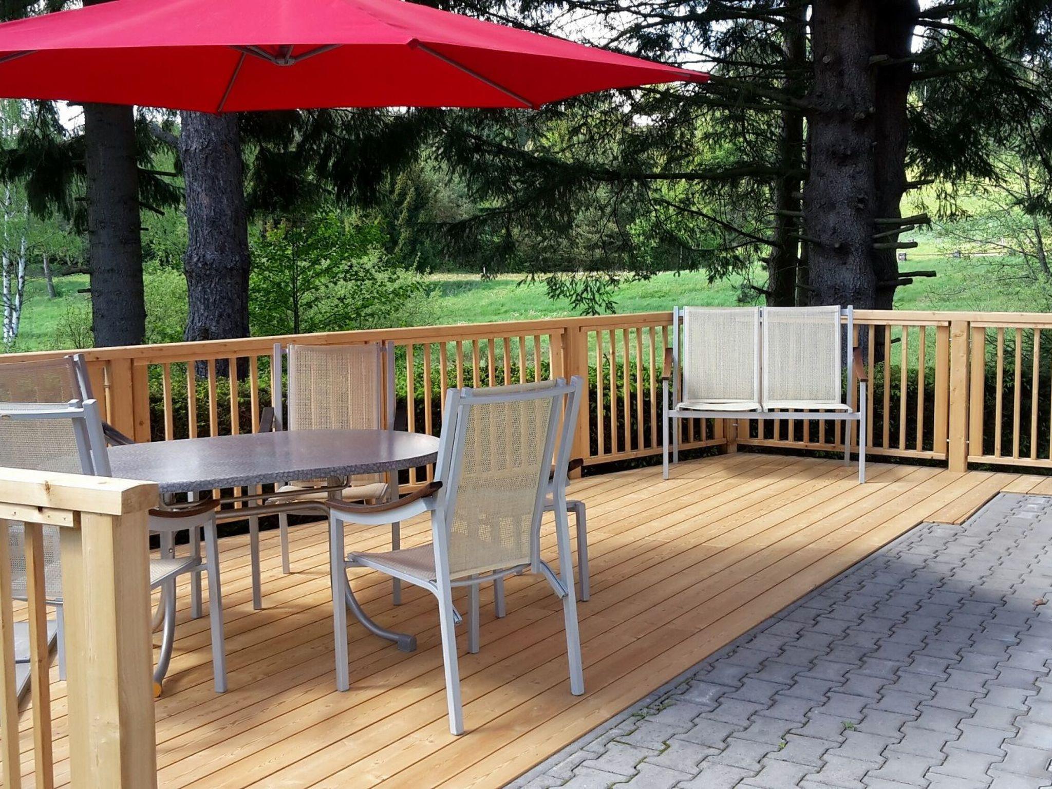 in 2018, a 22 m² wooden terrace with railings was added on the lake side, which offers you a great view of the lake and brings you even closer to it. An eight-piece garden set (four armchairs, 1x 2-seater bench, stool, table & swing umbrella), as well as a five-piece mosaic seating group consisting of two armchairs with cushions and a table, are placed on this area. The remaining space would also allow additional sun loungers to be placed there, which are also provided for your use. There is also a wooden settee outside, consisting of two benches with cushions, a table and parasol. At the back of the house there is an open fireplace with a barbecue grill. Rustic tree trunks serve as seating. And to explore the lake from the water, or to extend the range of leisure and fun activities, the house also has a rowing boat and a kayak that is easy for children to use. You are responsible for the safe and proper use of the boat. Please also note that lighting a fire on the lakeshore is prohibited.
