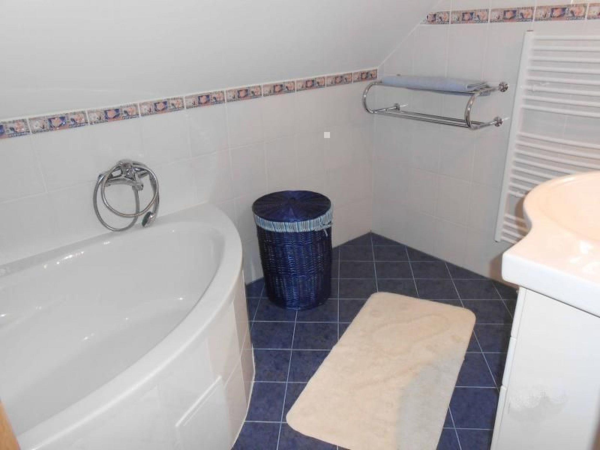 On the ground floor there is a large, bright room on the lake side with a very well-equipped kitchen in a nice design and the living room, which is furnished with a SAT TV and a cosy and spacious couch. The kitchen includes a ceramic hob (four plates), an oven, a dishwasher, a spacious fridge, a kettle, a mini oven, a filter coffee machine, a toaster and all crockery, pots and pans, etc... as well as many useful cooking utensils. There is also an easy-to-use wood-burning stove in this room, which - please note - is also the only source of heating. (Note: we provide you with wood for the first day, if you need more, the tenant is responsible for purchasing it - this is the general custom in this region; there are no radiators or central heating).
