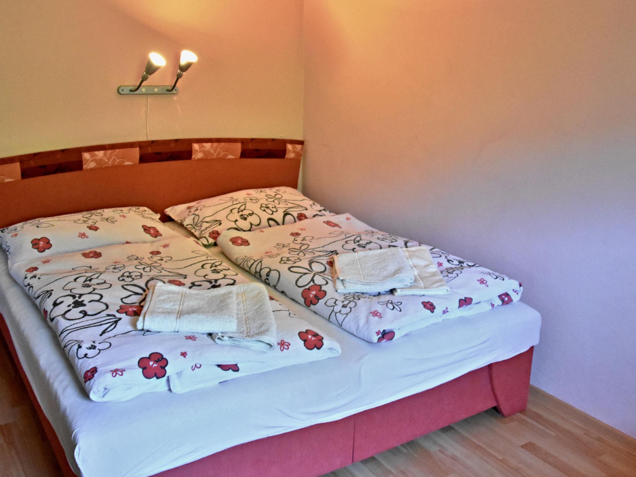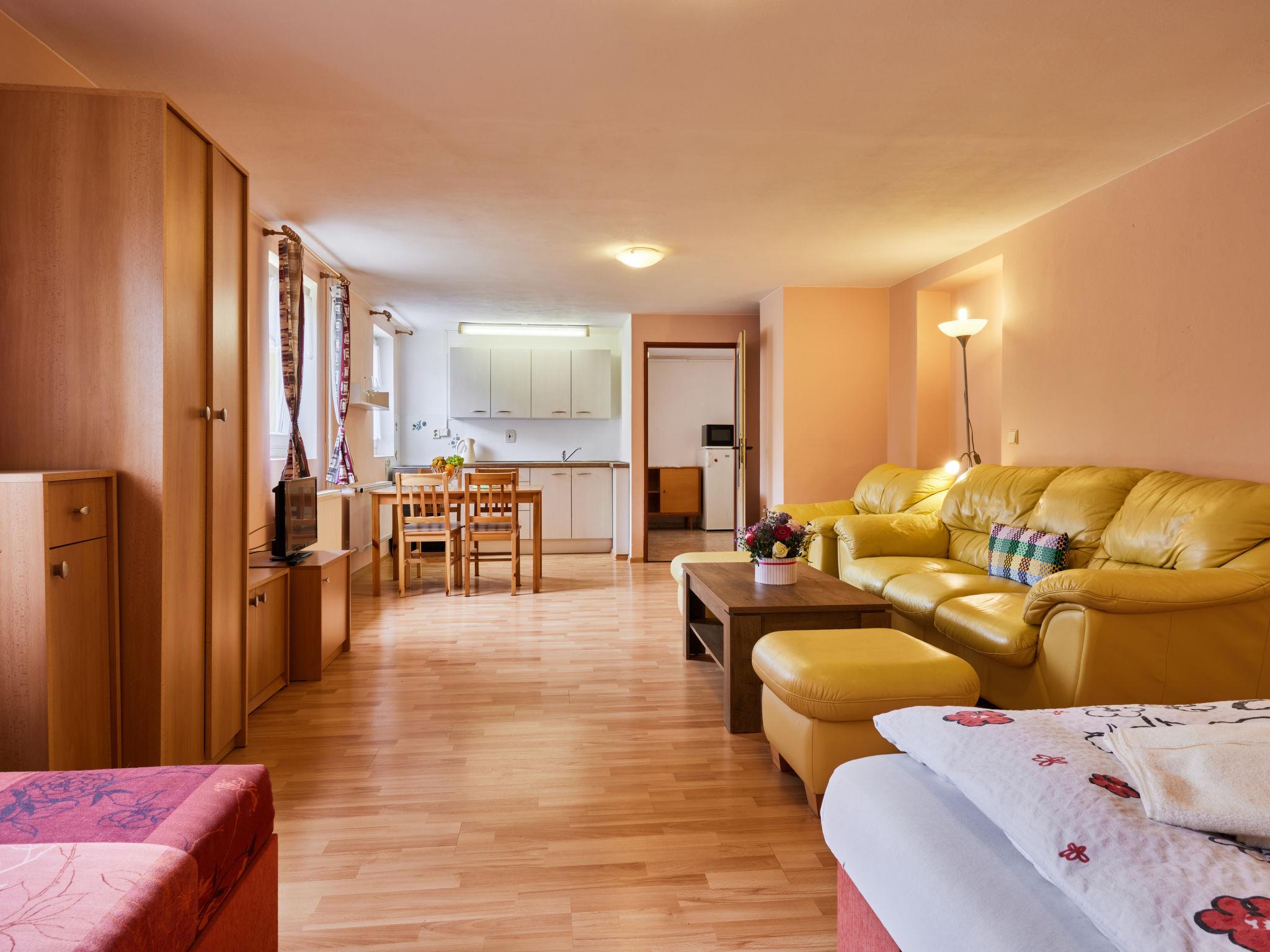 "U Šustru", 1-room studio 30 m2, on the ground floor. Spacious and bright, comfortable furnishings: living/sleeping room with 1 double sofabed (120 cm), 2 double beds and satellite TV. Kitchenette (oven, 4 ceramic glass hob hotplates, kettle, microwave, freezer) with dining table. Shower/WC. Solar power. Patio. Terrace furniture, barbecue. Facilities: baby cot. Internet (WiFi, free). E-charging station. Please note: suitable for families. Maximum 1 pet/ dog allowed. Private entrance.