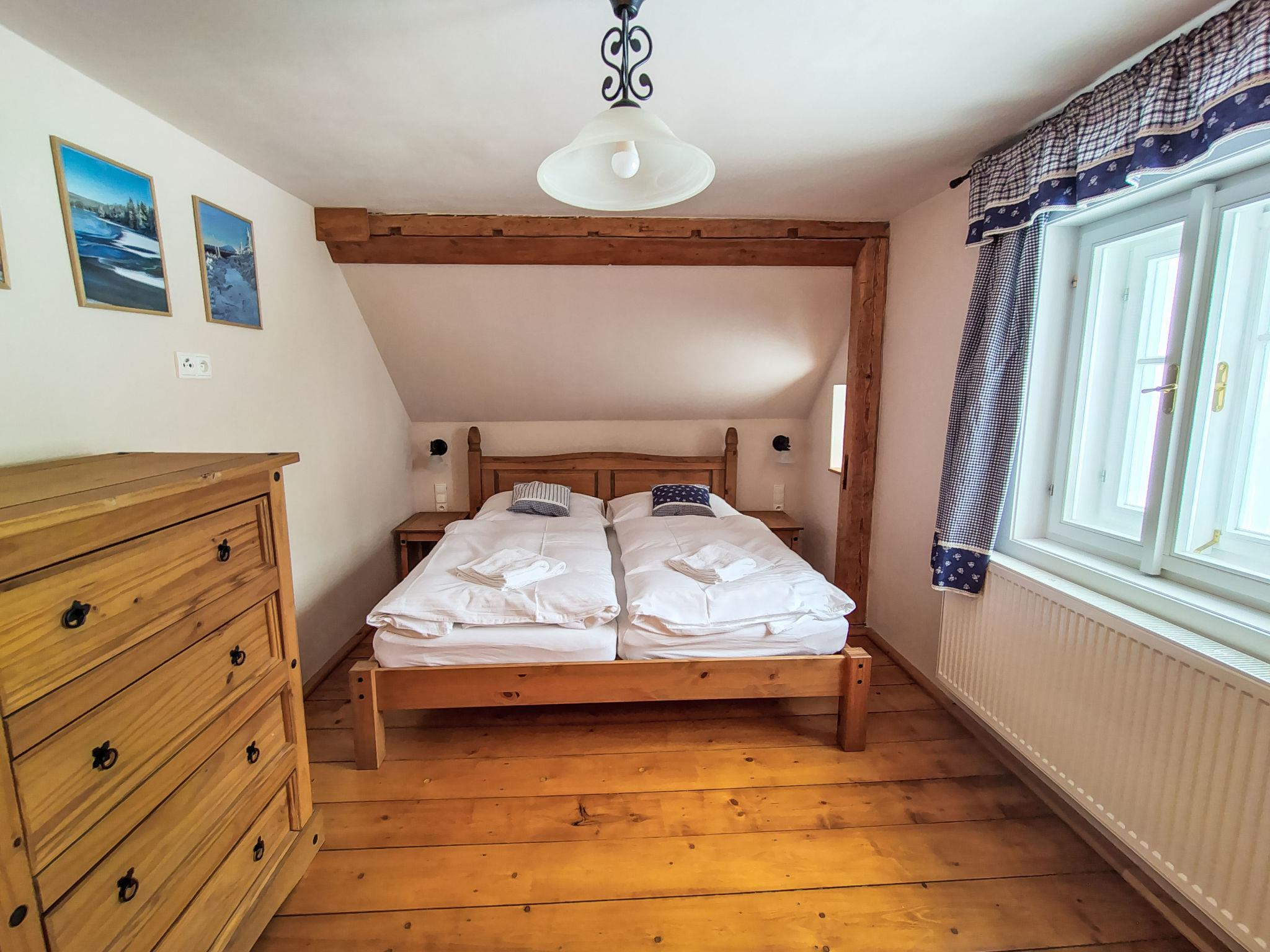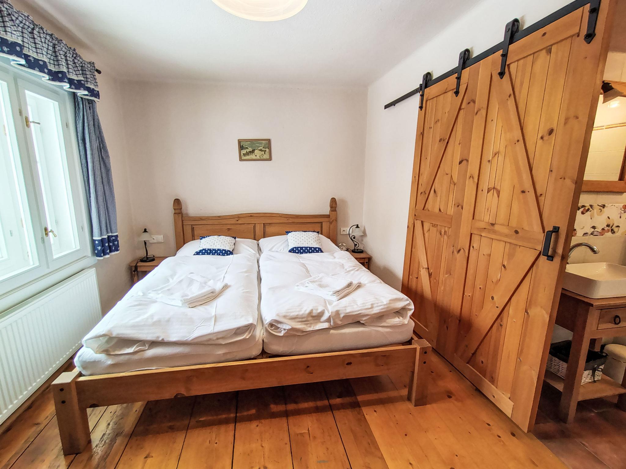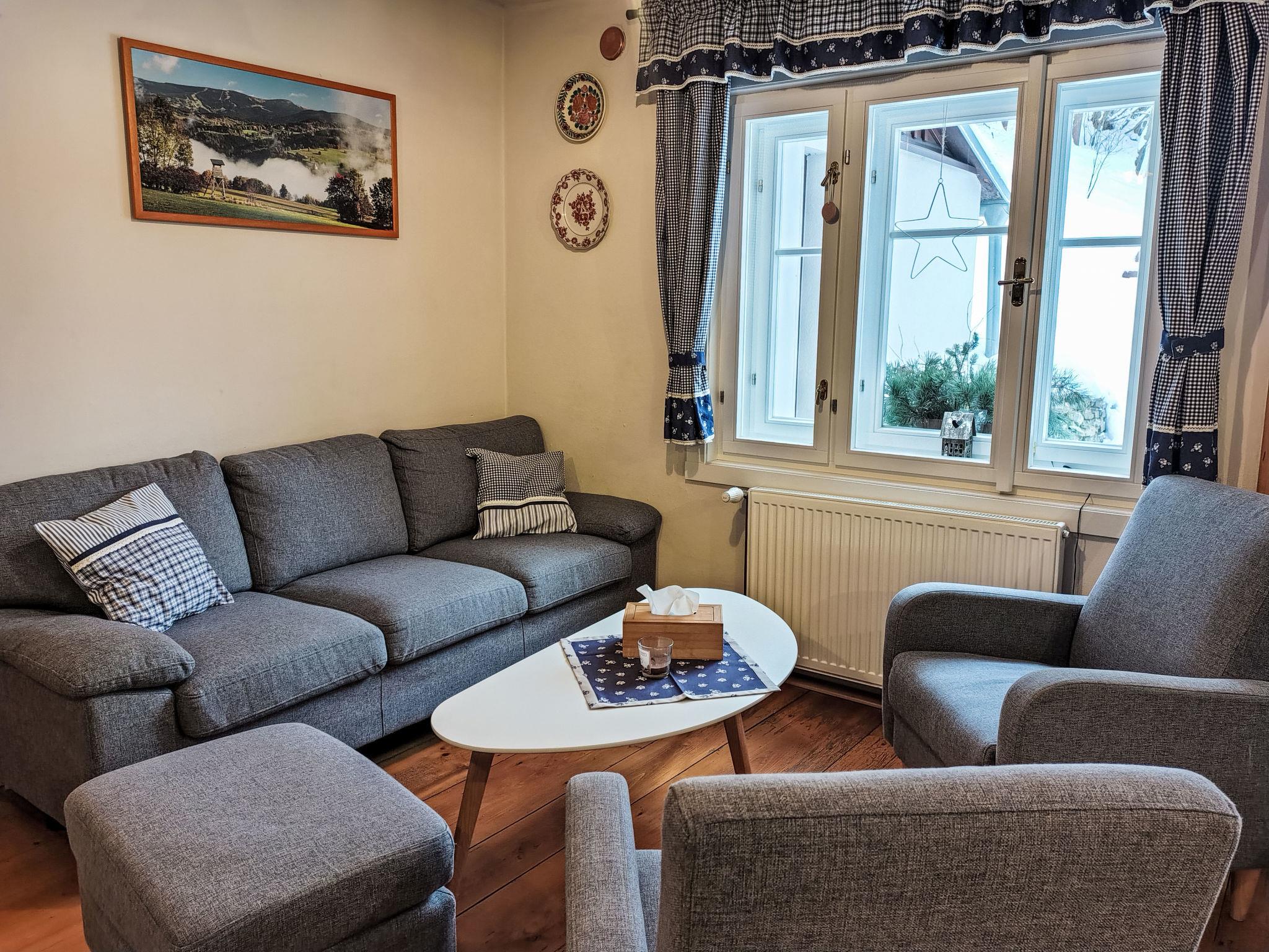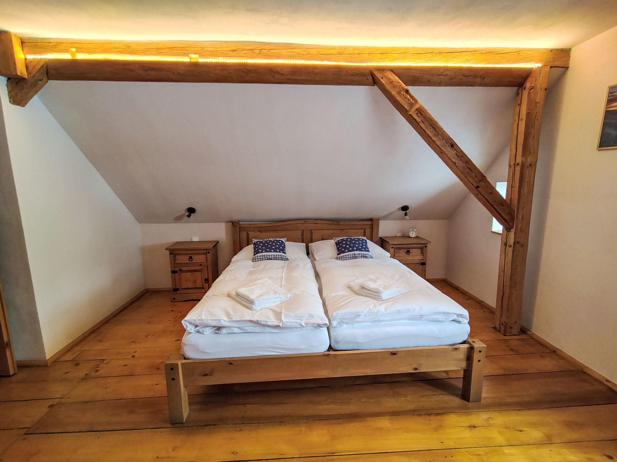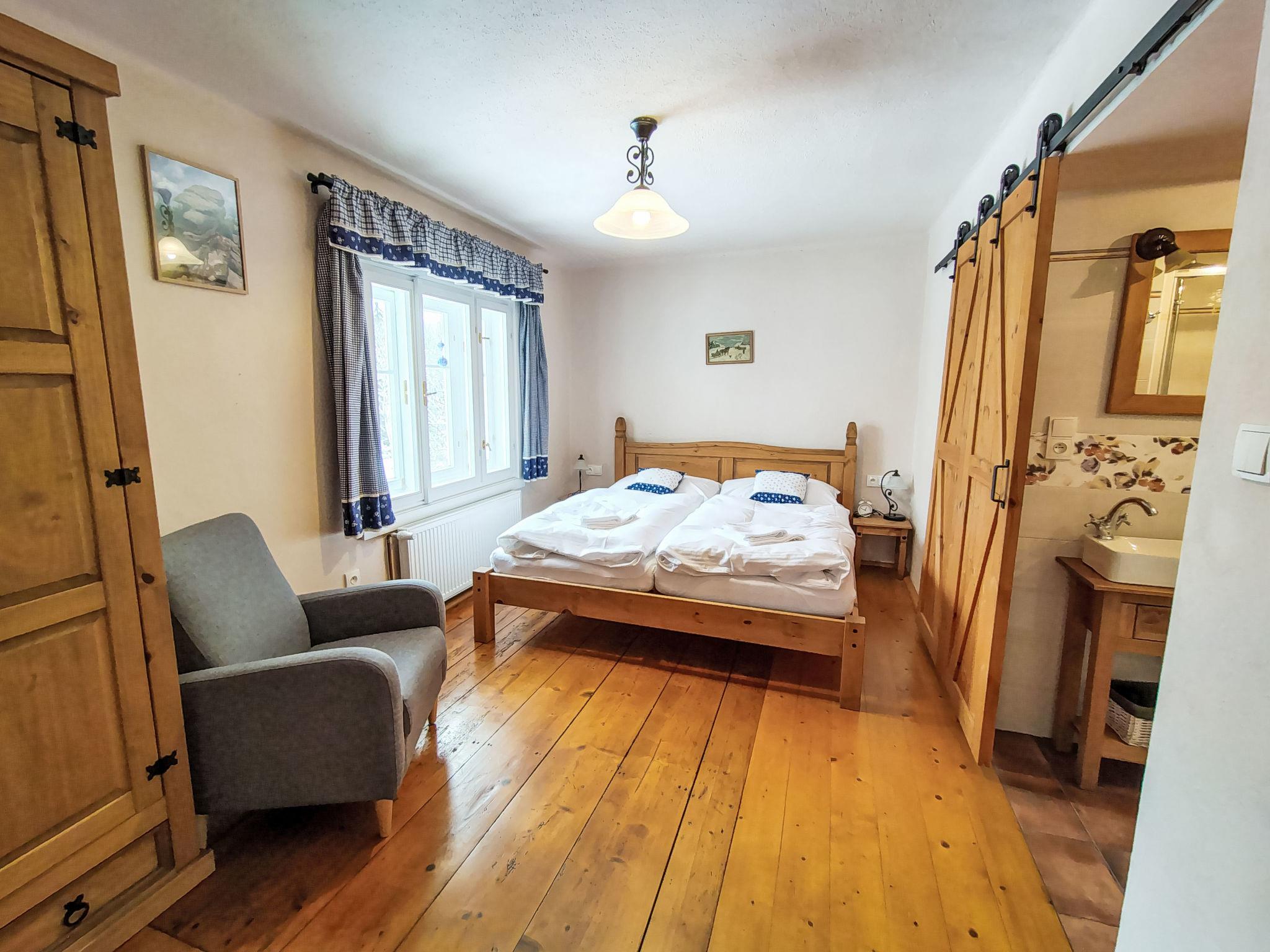 5-room cottage 200 m2. Very beautiful and rustic furnishings: entrance hall with separate WC. Exit to the veranda. Open large living/dining room with 1 sofabed and dining table. Large, open kitchen (oven, dishwasher, 4 ceramic glass hob hotplates, toaster, kettle, microwave, freezer, electric coffee machine, Capsules for coffee machine (Nespresso)) with electric heating and tiled stove. Sep. WC, Sauna. 2nd upper floor: 1 room with 2 beds, 1 double bed and shower/WC. 1 room with 1 double bed and shower/WC. 1 room with 1 double bed and shower/WC. 1 room with 2 beds, 1 double bed and bath/WC. Wooden floors. Terrace furniture. View of the mountains, the garden and the forest. Facilities: washing machine, sauna, children's high chair, baby cot, hair dryer. Internet (WiFi, free). Please note: suitable for families. Non-smokers only. 1 pet/ dog allowed.