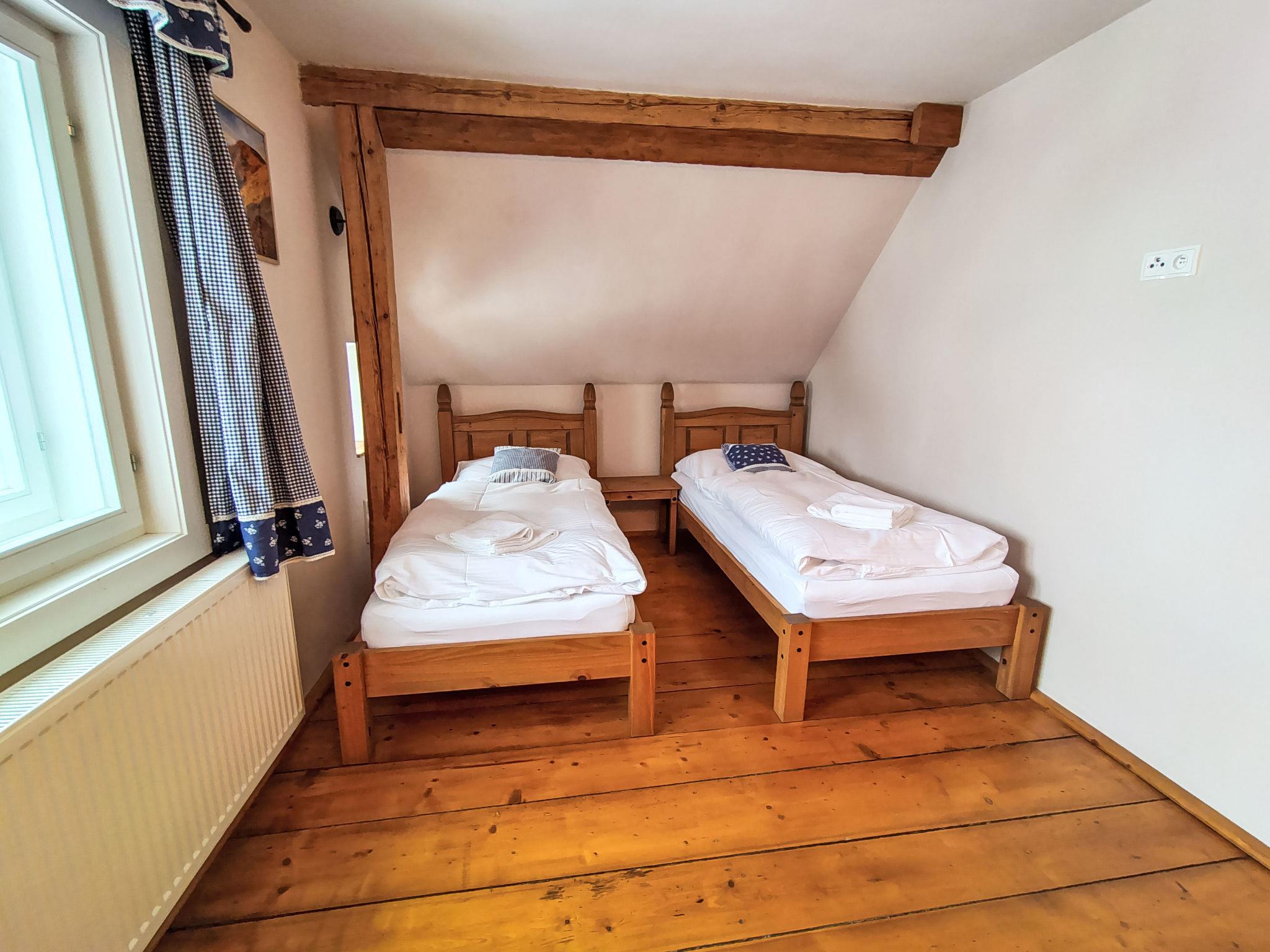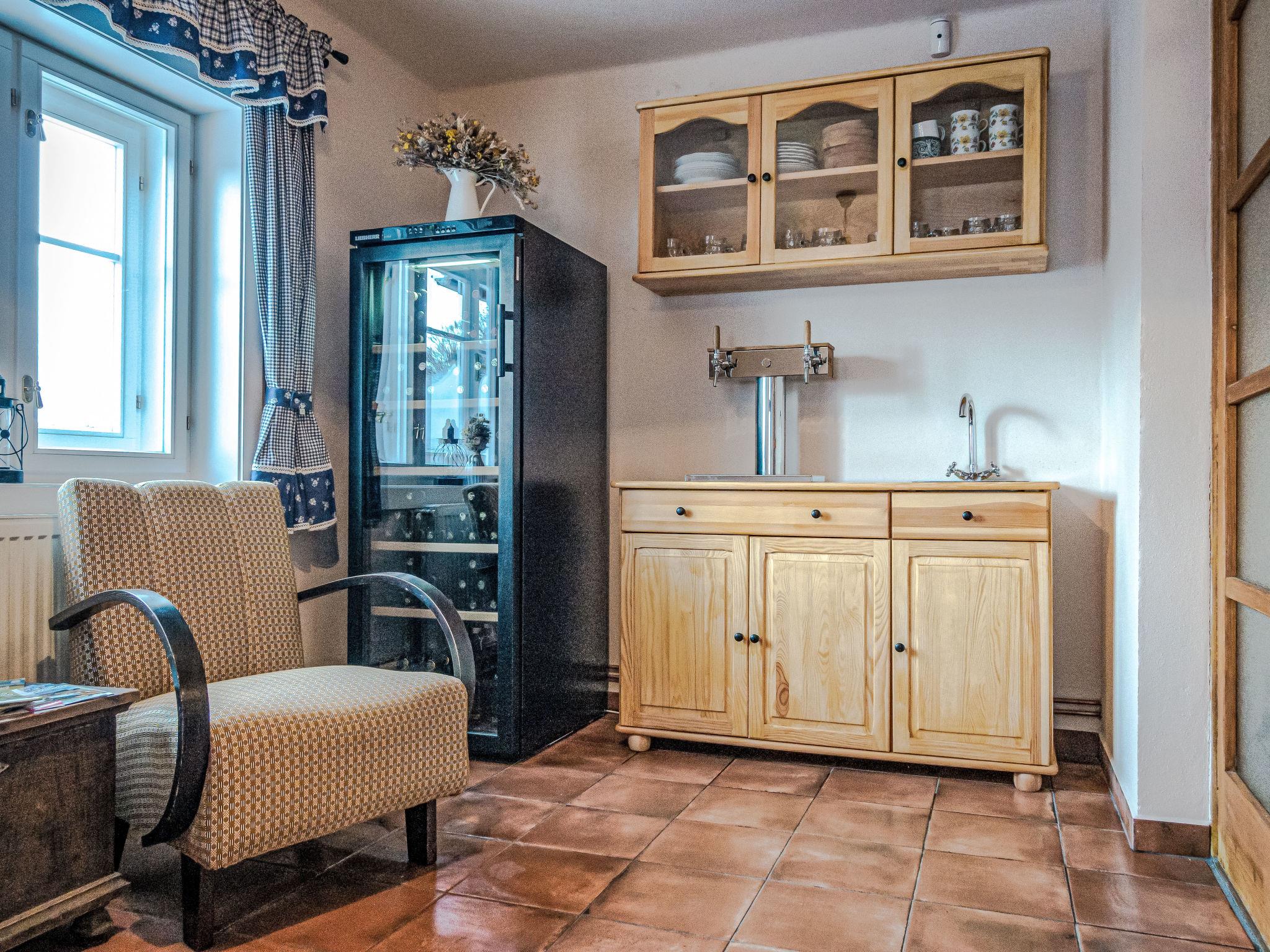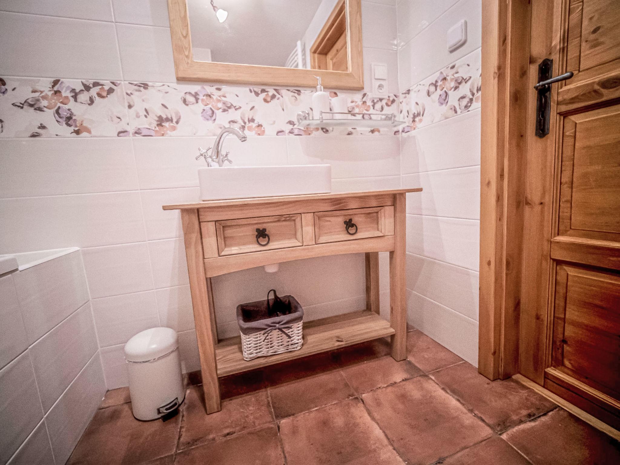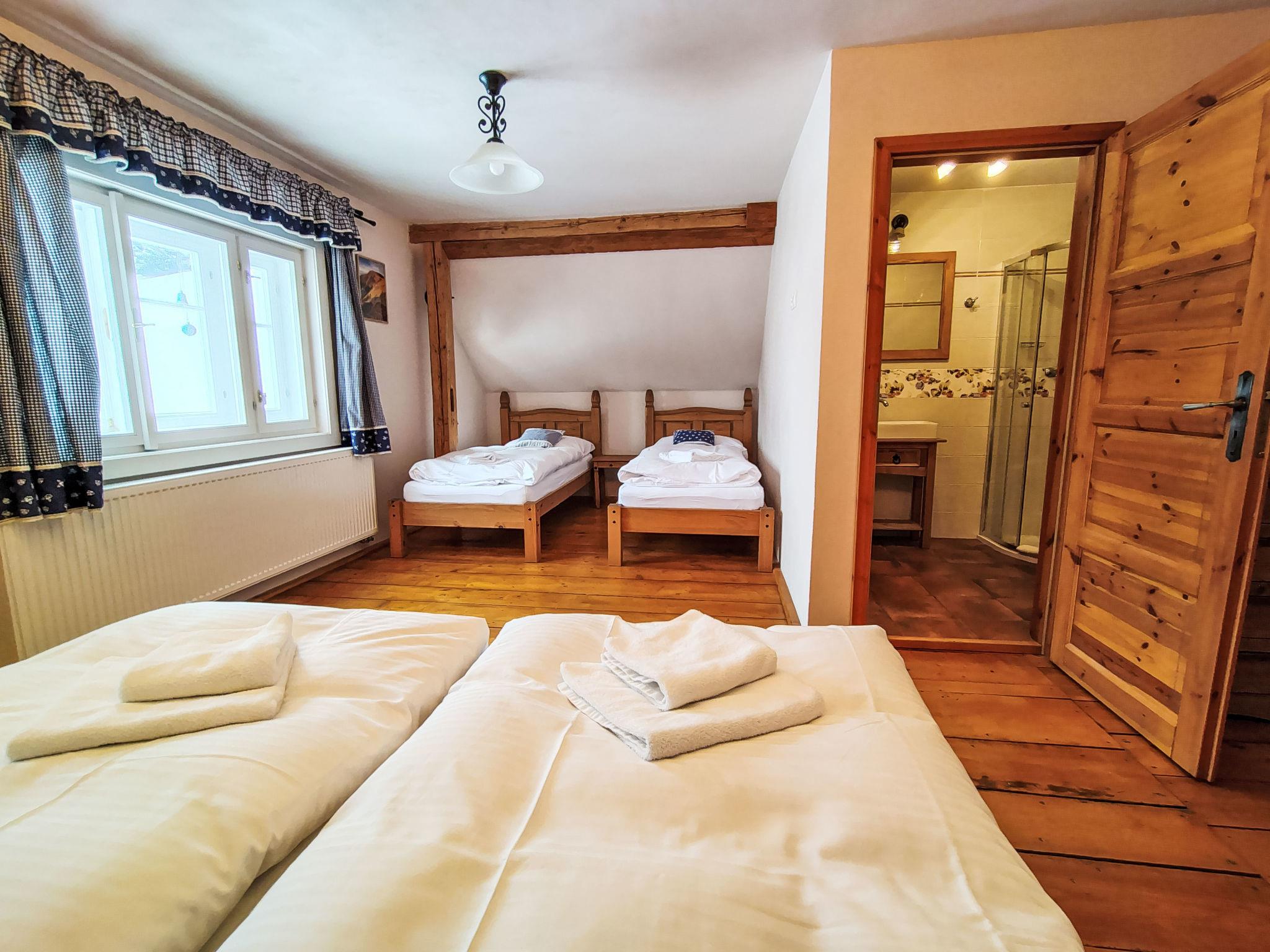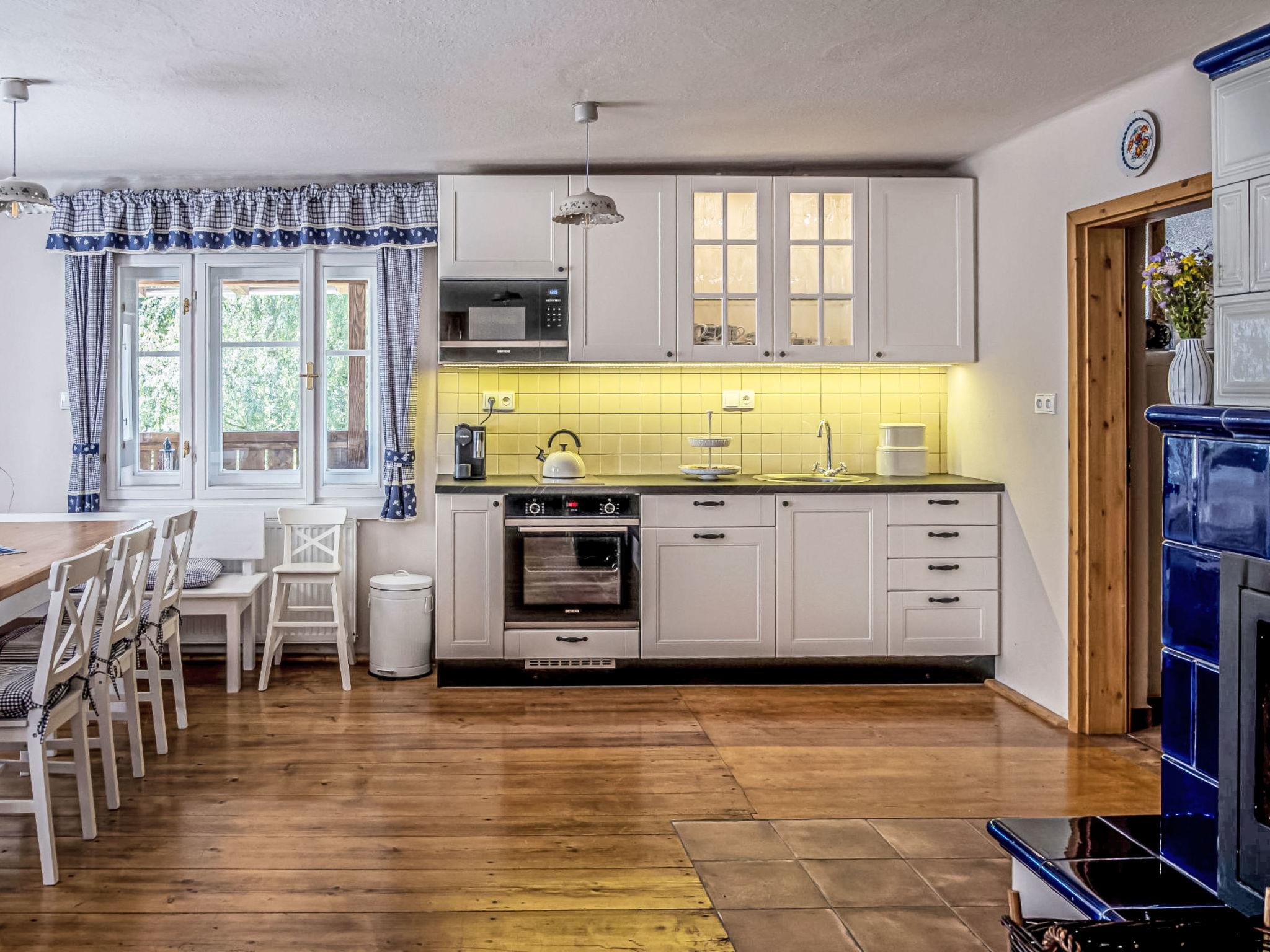 5-room cottage 200 m2. Very beautiful and rustic furnishings: entrance hall with separate WC. Exit to the veranda. Open large living/dining room with 1 sofabed and dining table. Large, open kitchen (oven, dishwasher, 4 ceramic glass hob hotplates, toaster, kettle, microwave, freezer, electric coffee machine, Capsules for coffee machine (Nespresso)) with electric heating and tiled stove. Sep. WC, Sauna. 2nd upper floor: 1 room with 2 beds, 1 double bed and shower/WC. 1 room with 1 double bed and shower/WC. 1 room with 1 double bed and shower/WC. 1 room with 2 beds, 1 double bed and bath/WC. Wooden floors. Terrace furniture. View of the mountains, the garden and the forest. Facilities: washing machine, sauna, children's high chair, baby cot, hair dryer. Internet (WiFi, free). Please note: suitable for families. Non-smokers only. 1 pet/ dog allowed.