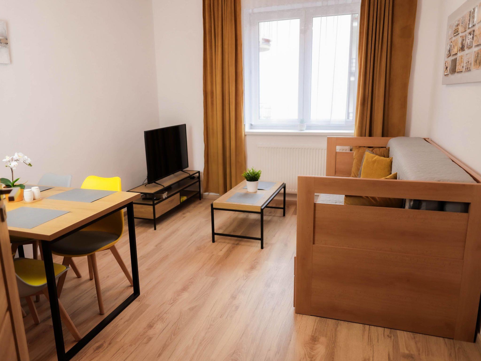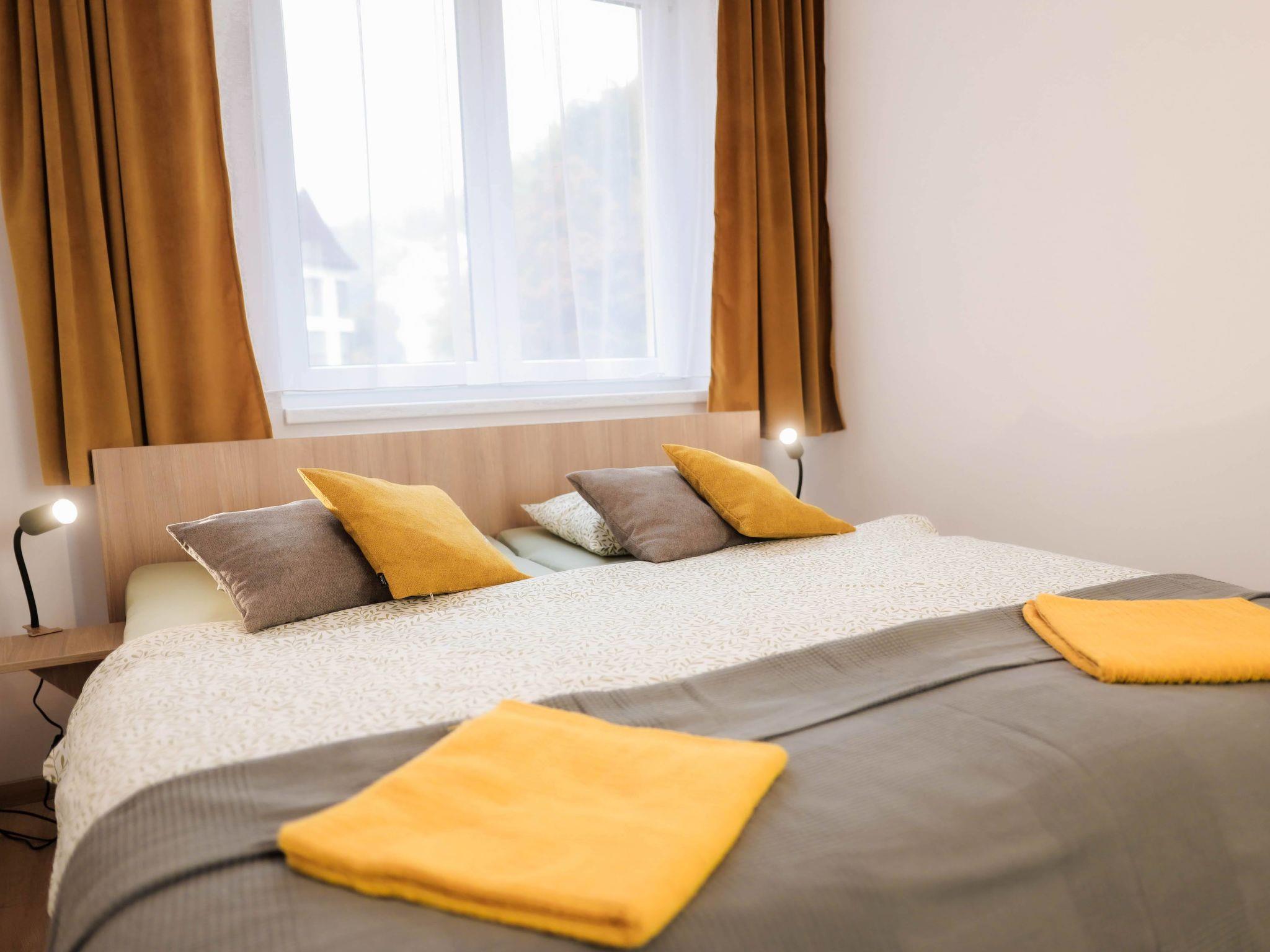 "Jachymov Retreat", 2-room apartment 39 m2 on 1st floor. Living room with 1 double sofabed and TV. 1 room with 1 double bed. Kitchenette (oven, dishwasher, 2 ceramic glass hob hotplates, toaster, kettle, microwave, freezer, electric coffee machine). Shower/WC. Electric heating. View of the forest. Facilities: hair dryer. Internet (WiFi, free). Parking at the house. Please note: suitable for families. Non-smokers only.