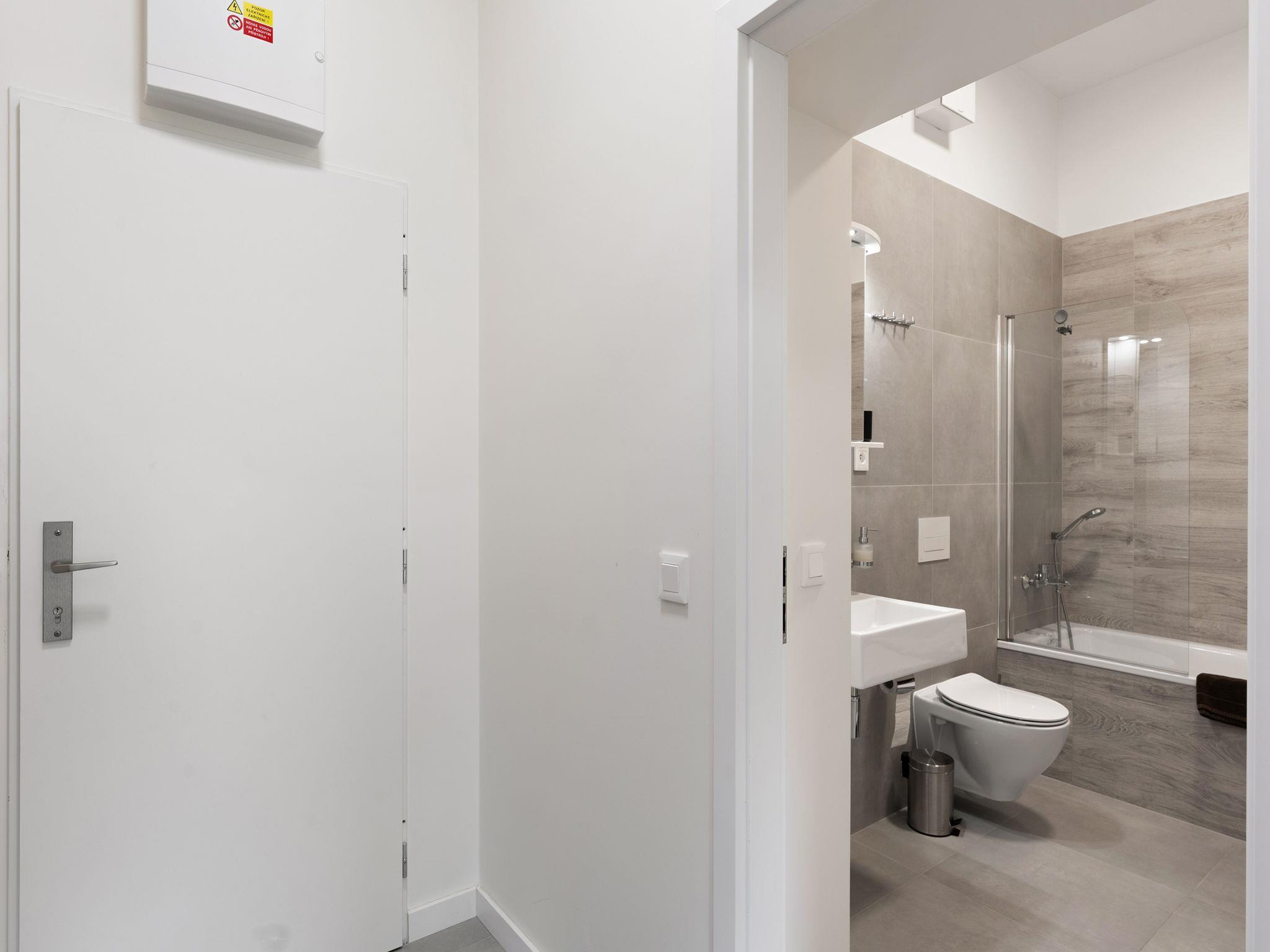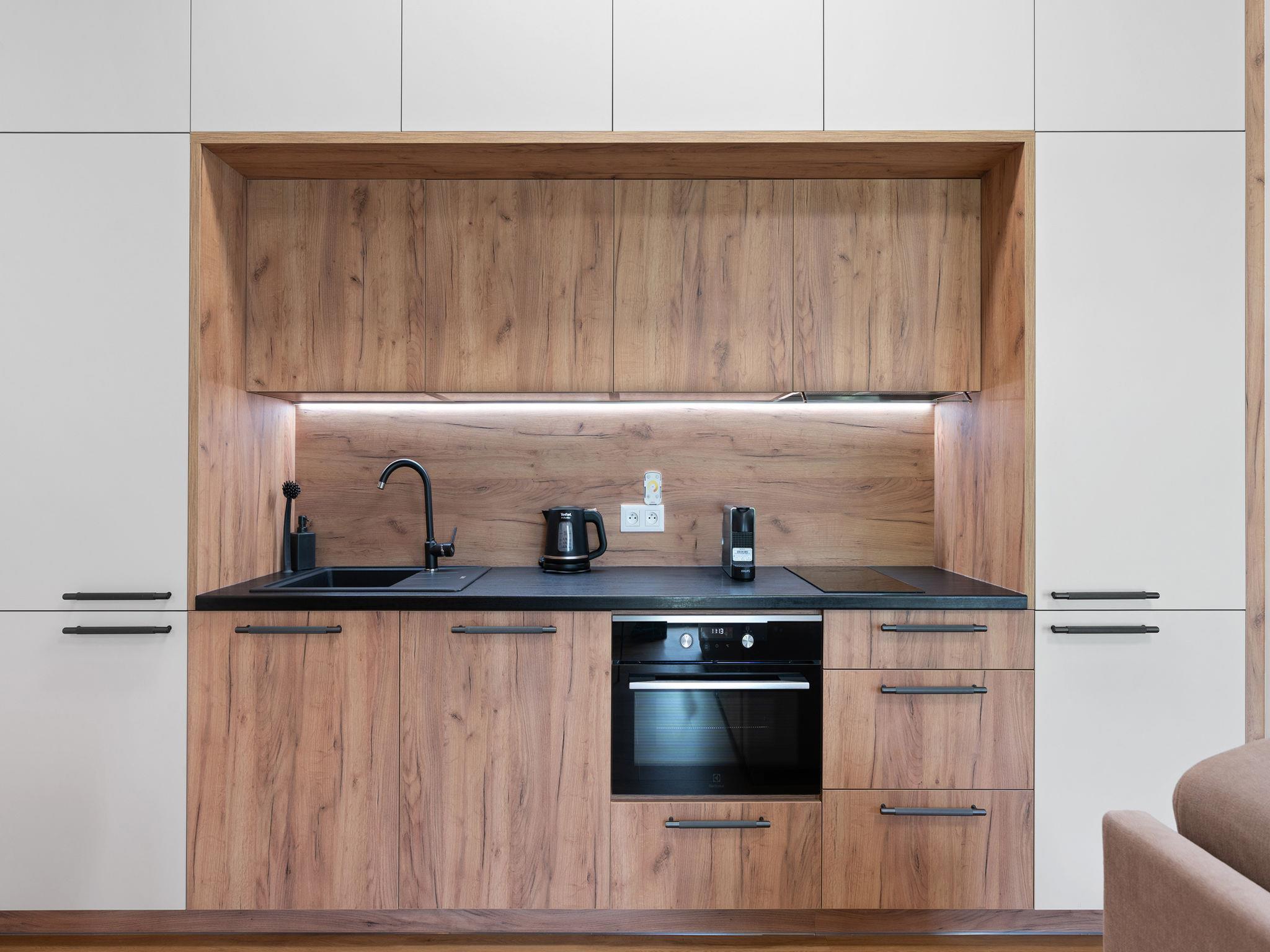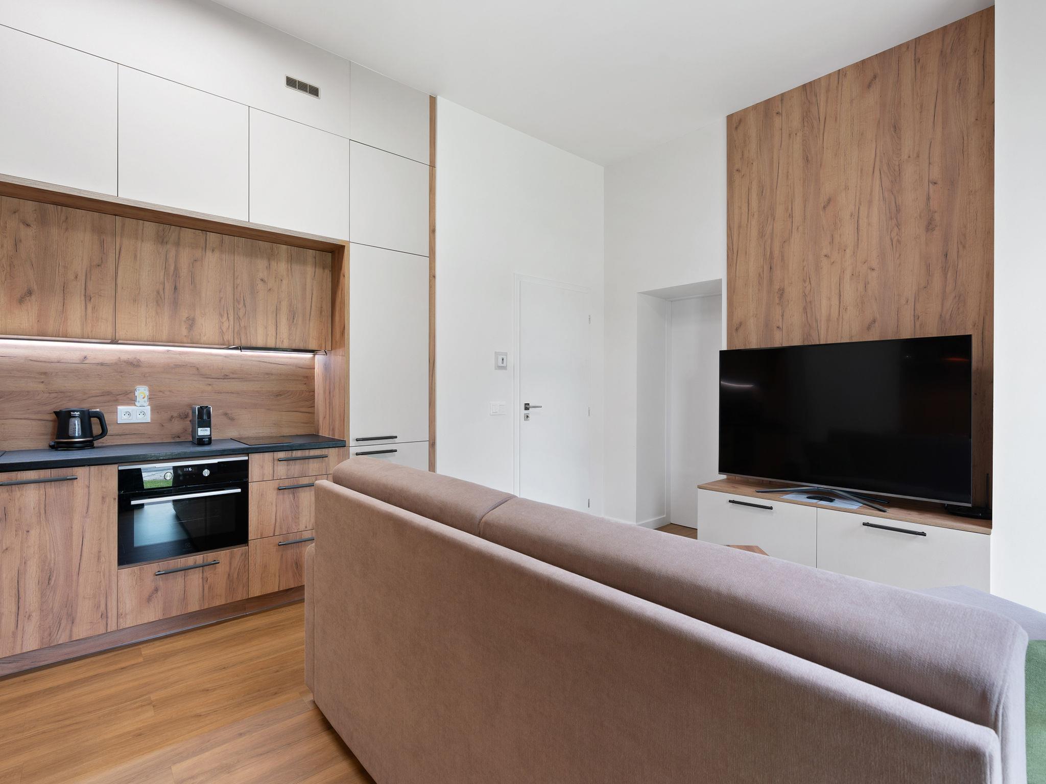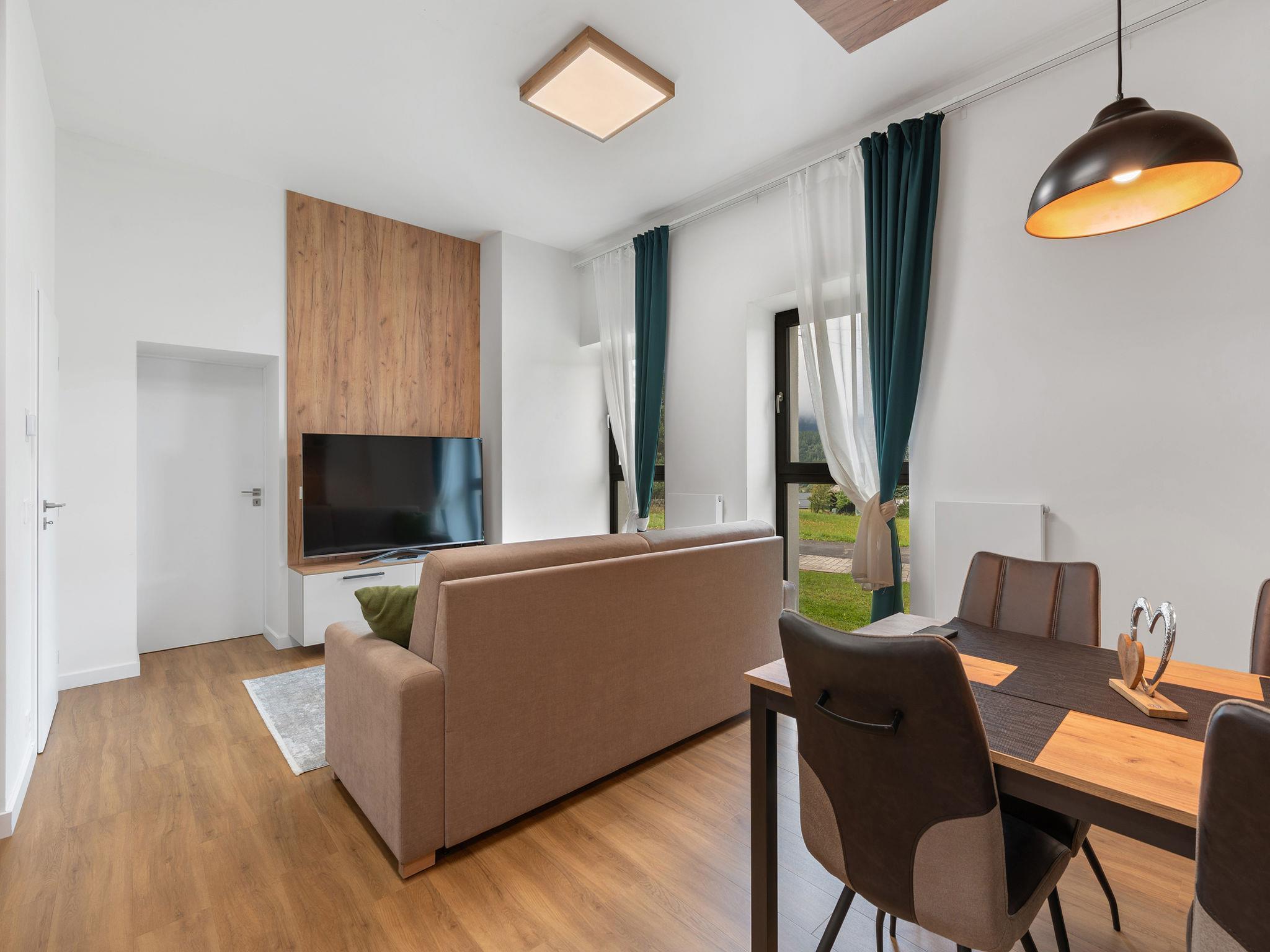 "Javorná Lodge", 2-room apartment 45 m2, on the ground floor, south-west facing position. Bright, modern furnishings: entrance hall. Living room with 1 double sofabed and TV. 1 room with 1 double bed. Kitchenette (oven, dishwasher, 2 ceramic glass hob hotplates, kettle, freezer) with dining nook. Bath/WC. Facilities: Internet (WiFi, free). Please note: non-smokers only.